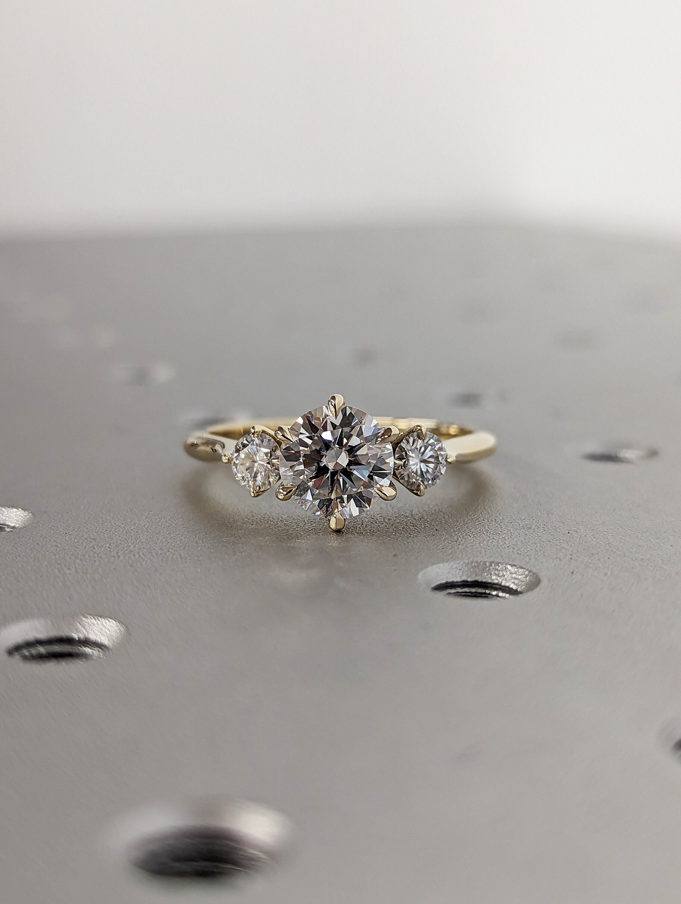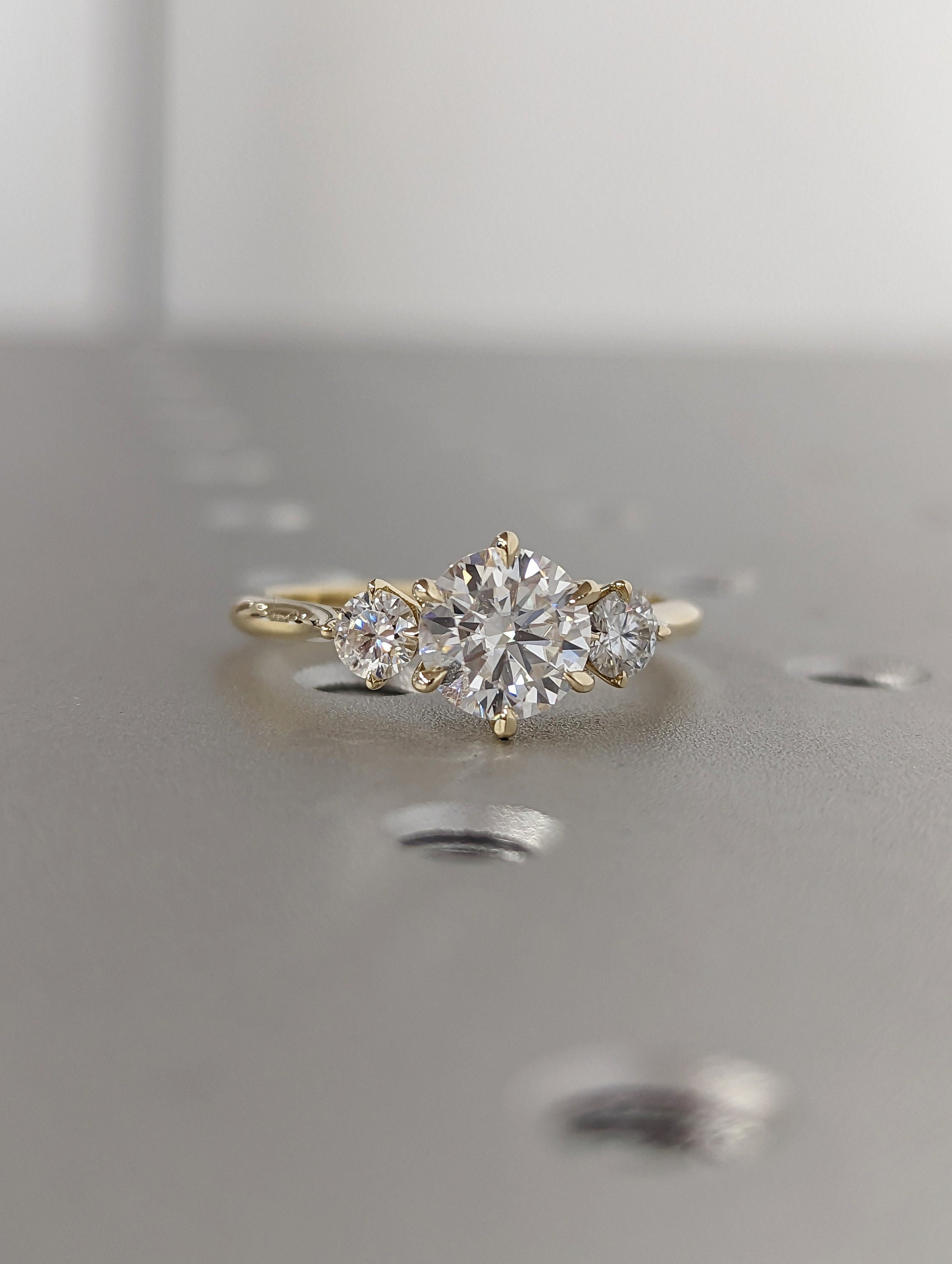 Petite Round Cut Moissanite Three Stone Ring in 14K Yellow Gold Engagement Ring, Promise Ring, Dainty Gold Ring, Moissanite Ring, Minimalist