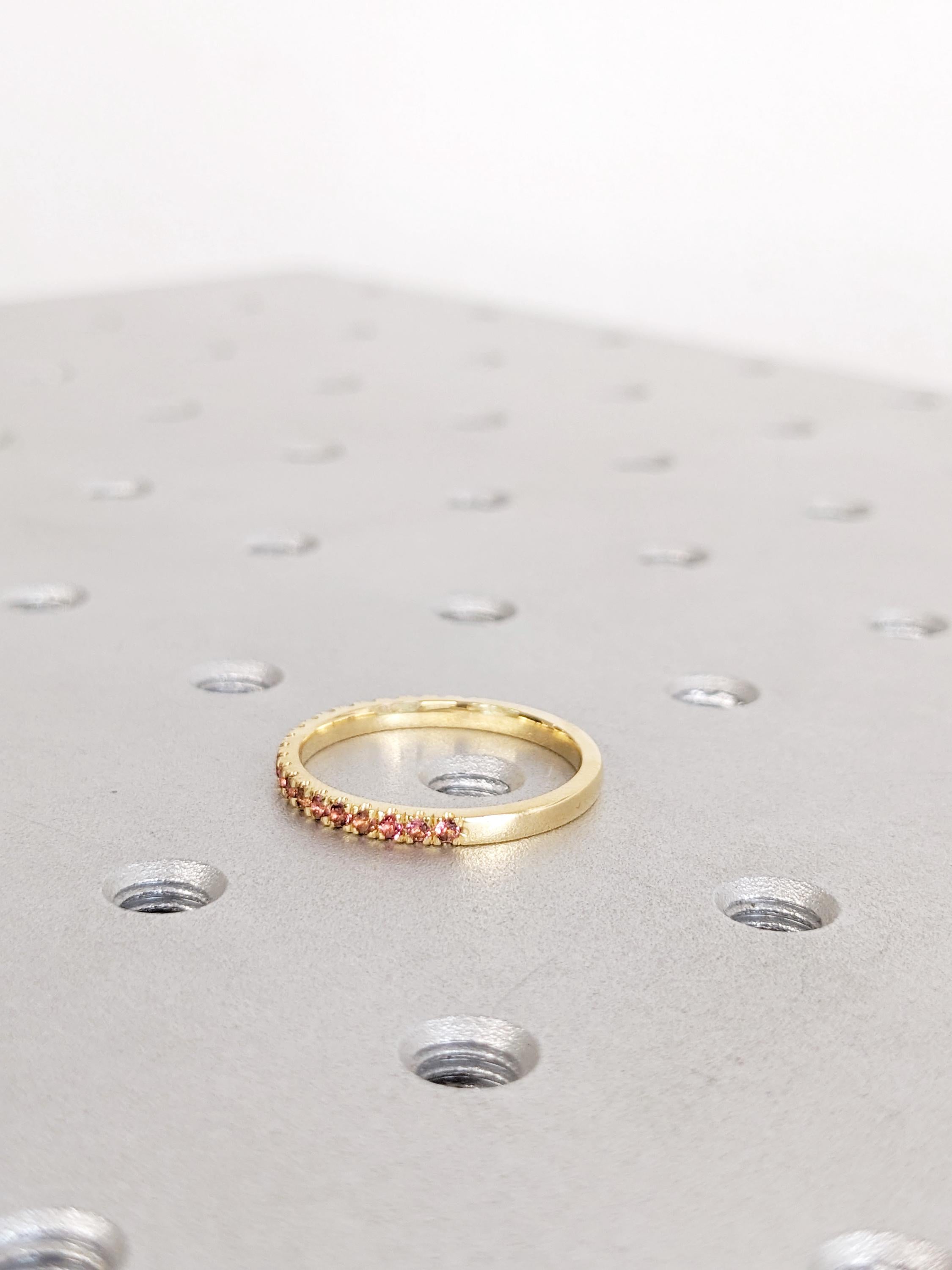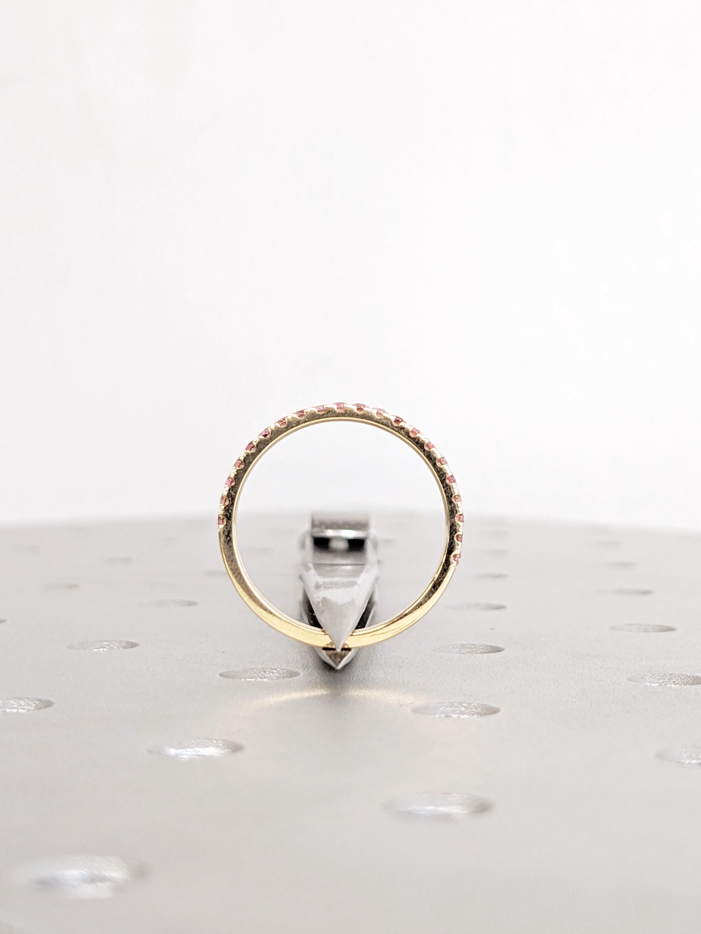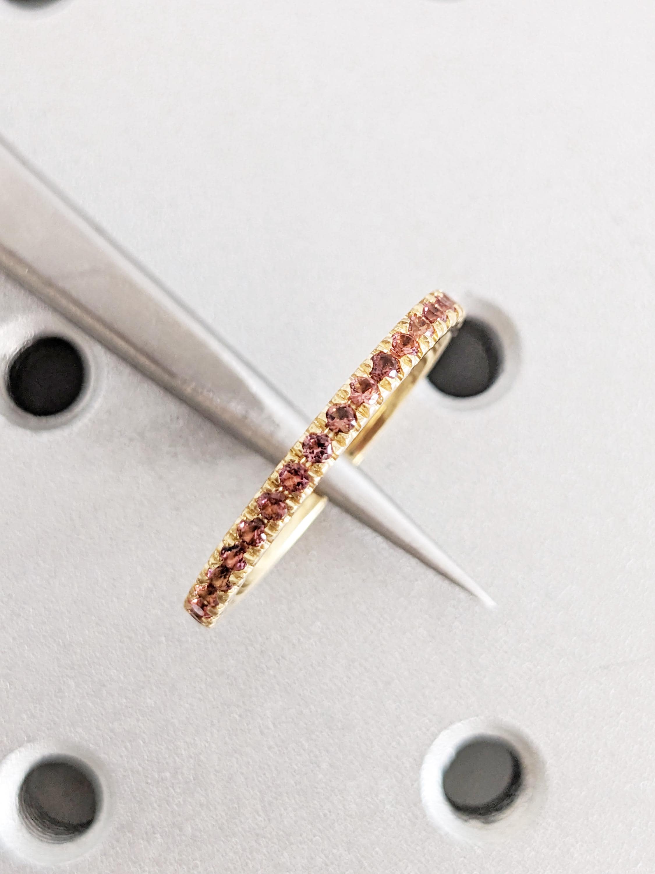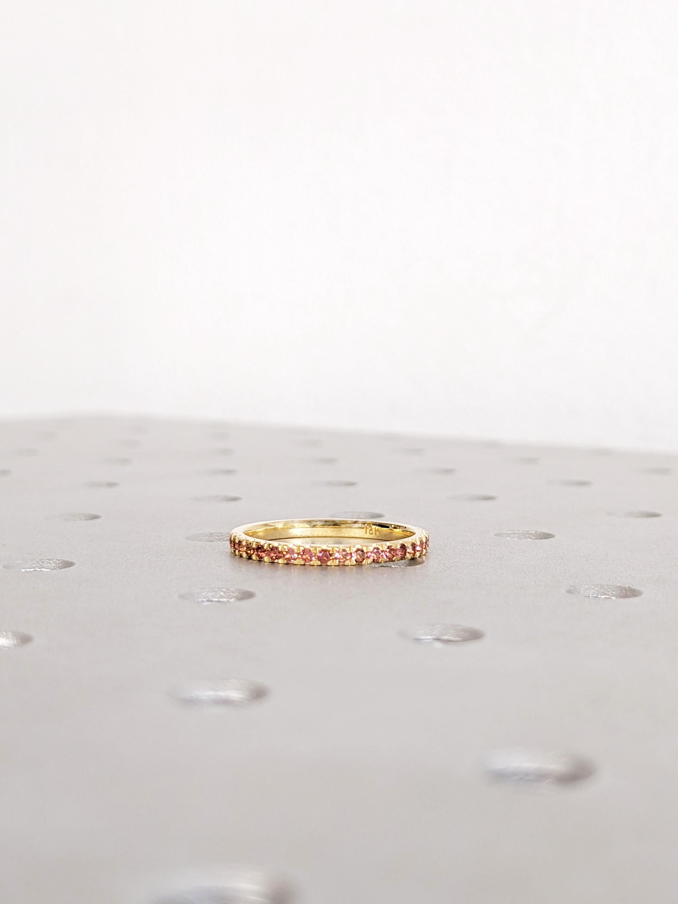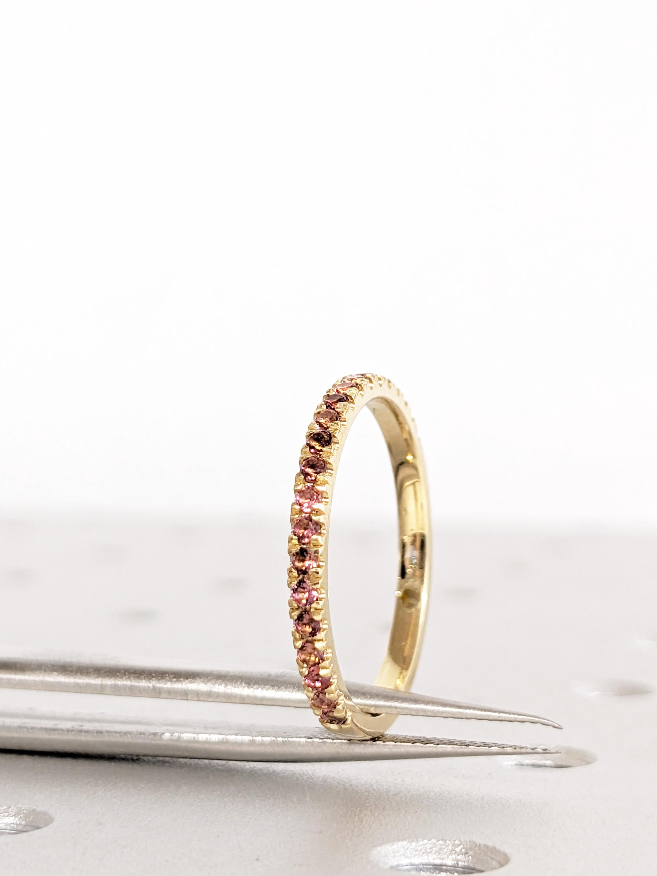 This Natural Tourmaline wedding band brings soft pink round Tourmaline stones in a clean pave setting, creating a bright and feminine ring perfect for stacking or wearing alone. The natural pink Tourmaline side stones add warm color and gentle sparkle, making this band a lovely choice for a wedding ring, matching band, anniversary gift, or elegant everyday wear.