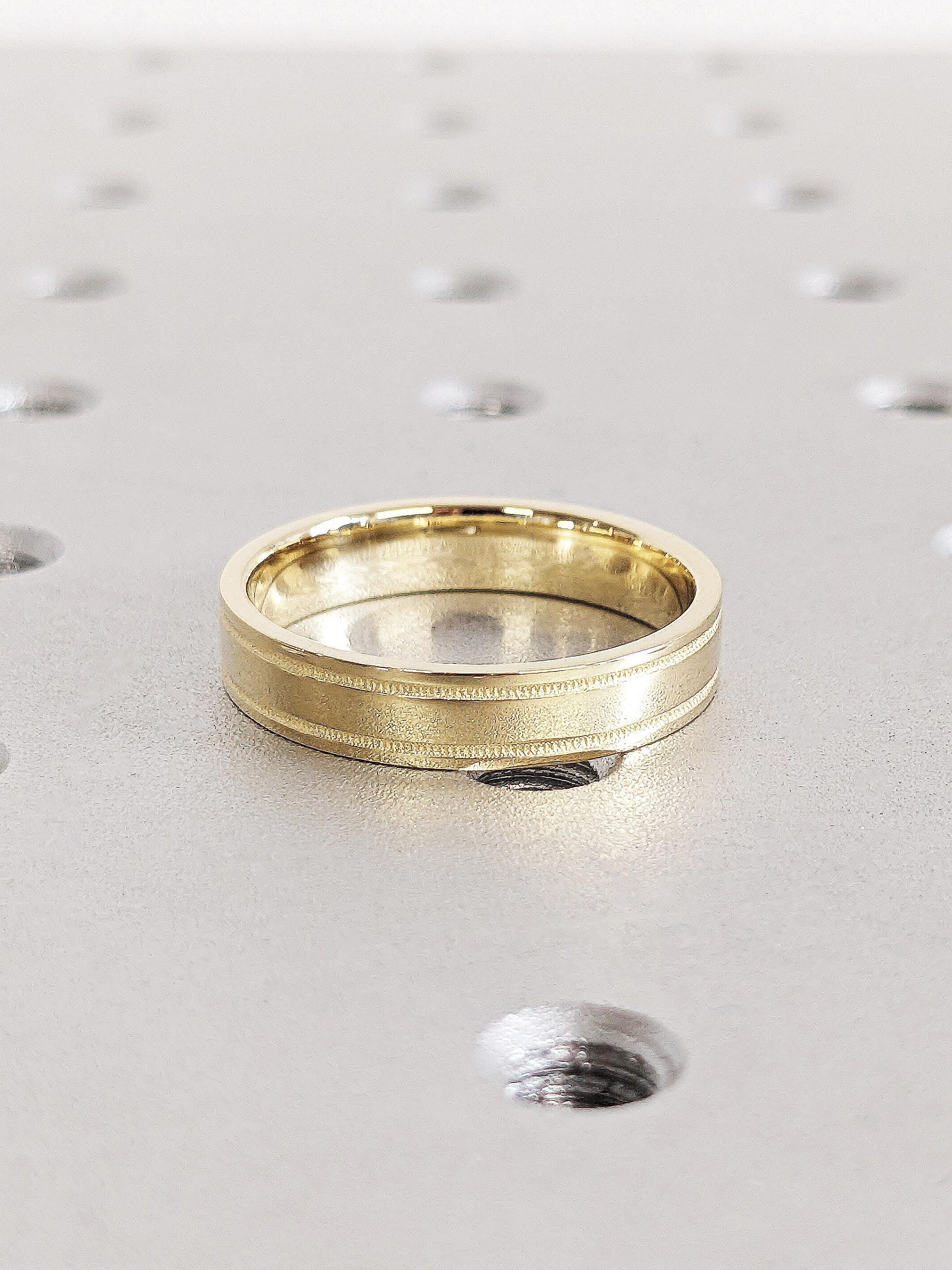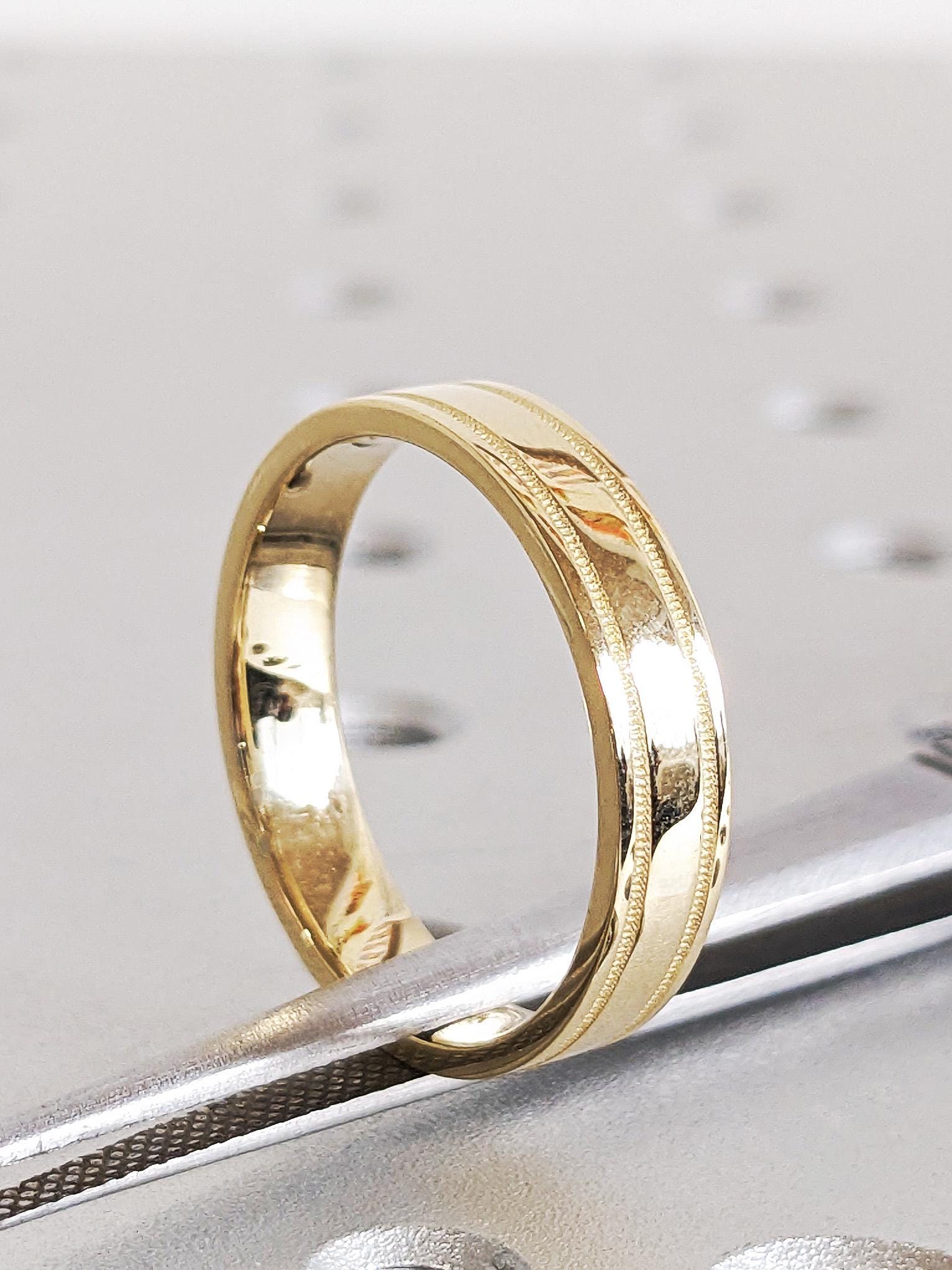This plain gold wedding band showcases a sleek, minimalist design accented with refined milgrain edges for subtle detail. A timeless piece of men’s jewelry, it is perfect as an engagement ring, wedding band or a sophisticated everyday accessory, blending elegance with enduring style.