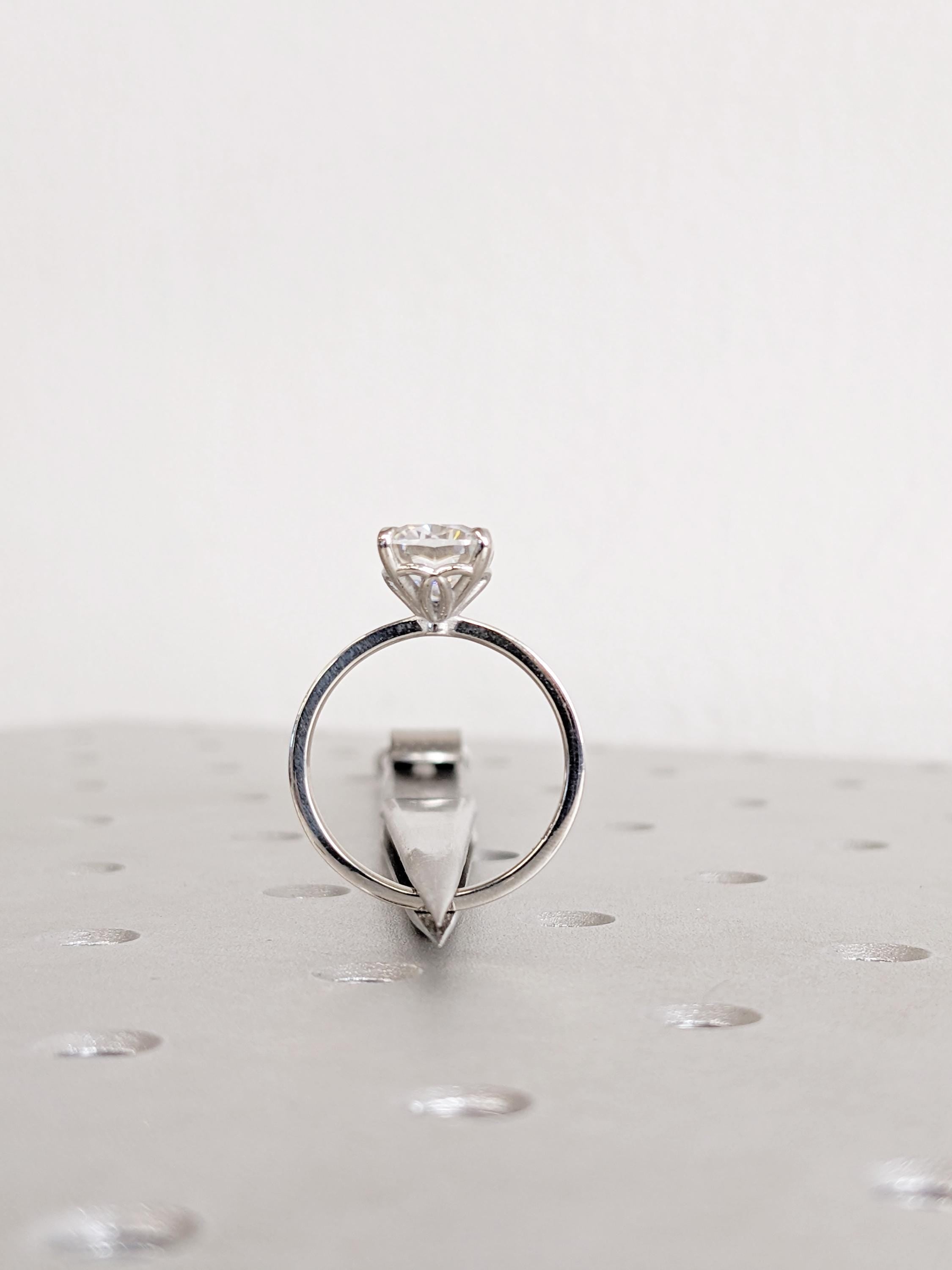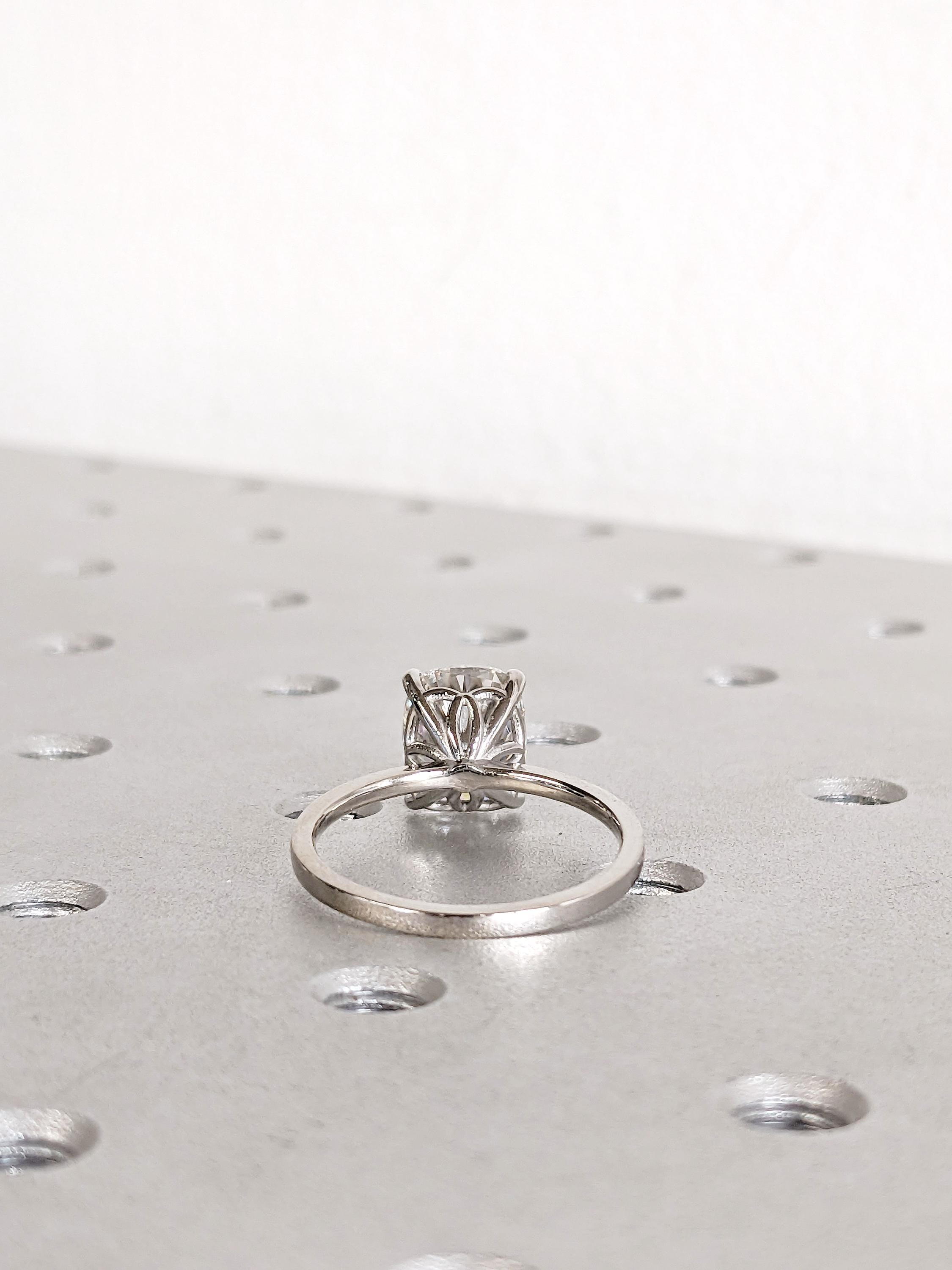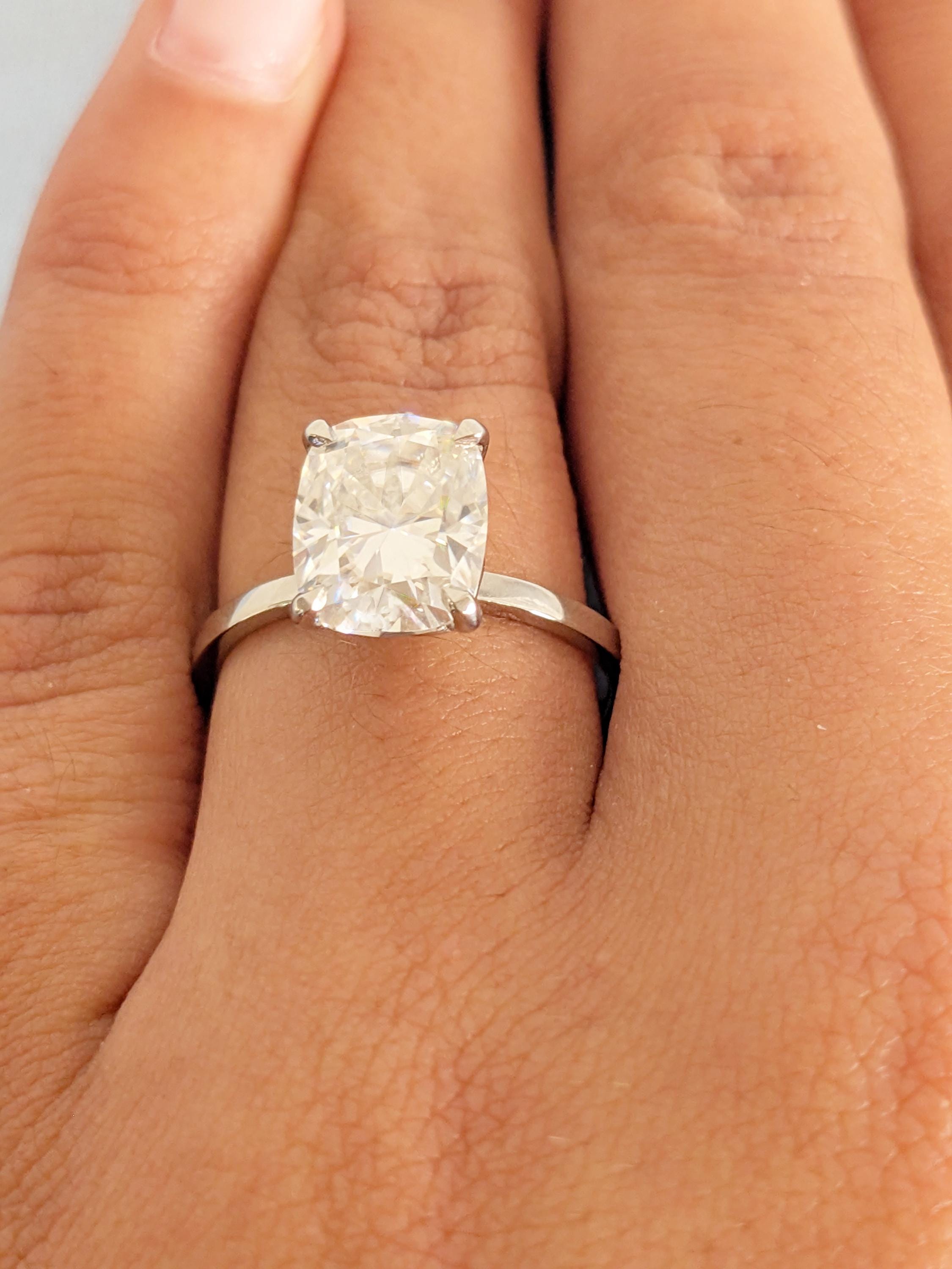 This Moissanite engagement ring features a cushion cut Moissanite in a refined talon prong setting, capturing a brilliant sparkle with timeless elegance. Its clean solitaire design highlights the stone’s fire and clarity, creating a sophisticated and modern look that makes it perfect for engagements, anniversaries, weddings, or as a meaningful symbol of everlasting love.