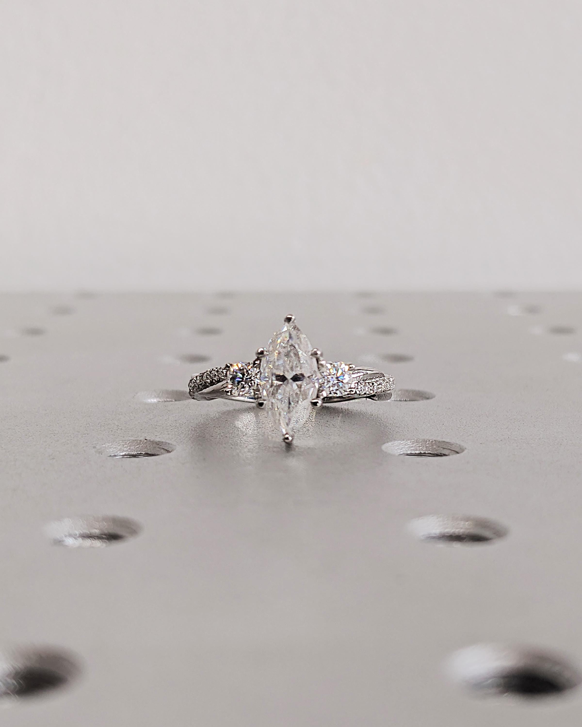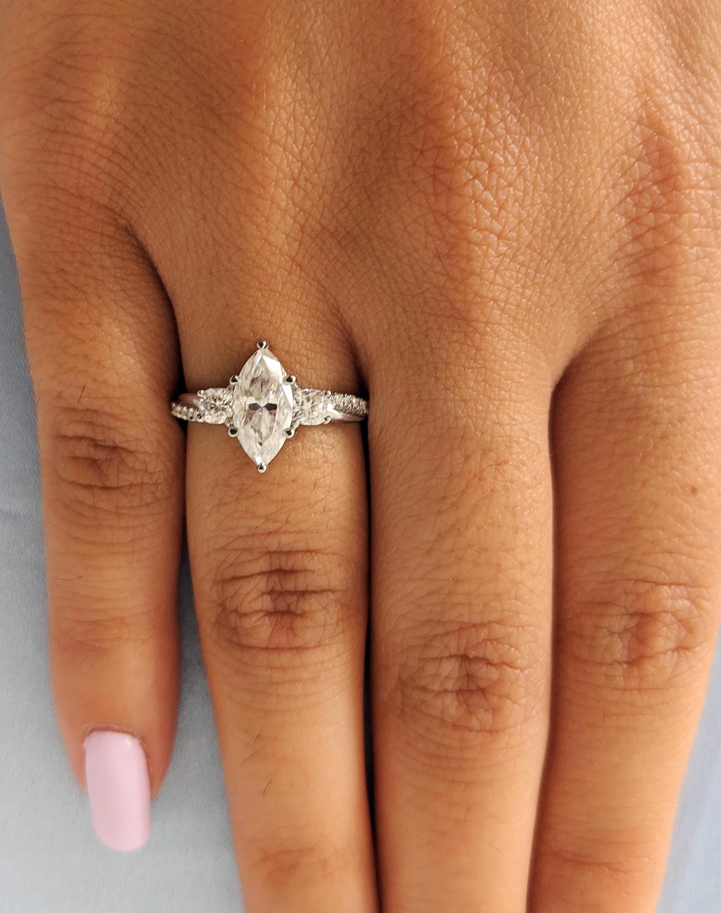 This marquise cut Lab Diamond Engagement ring features a graceful three stone design set along a beautifully twisted band. The side stones framing the center stone, along with the diamonds adorning the spiral band, are available in Natural Diamonds, Lab Diamonds or Moissanite. This ring offers a striking and timeless choice for engagement or fine wedding jewelry.
