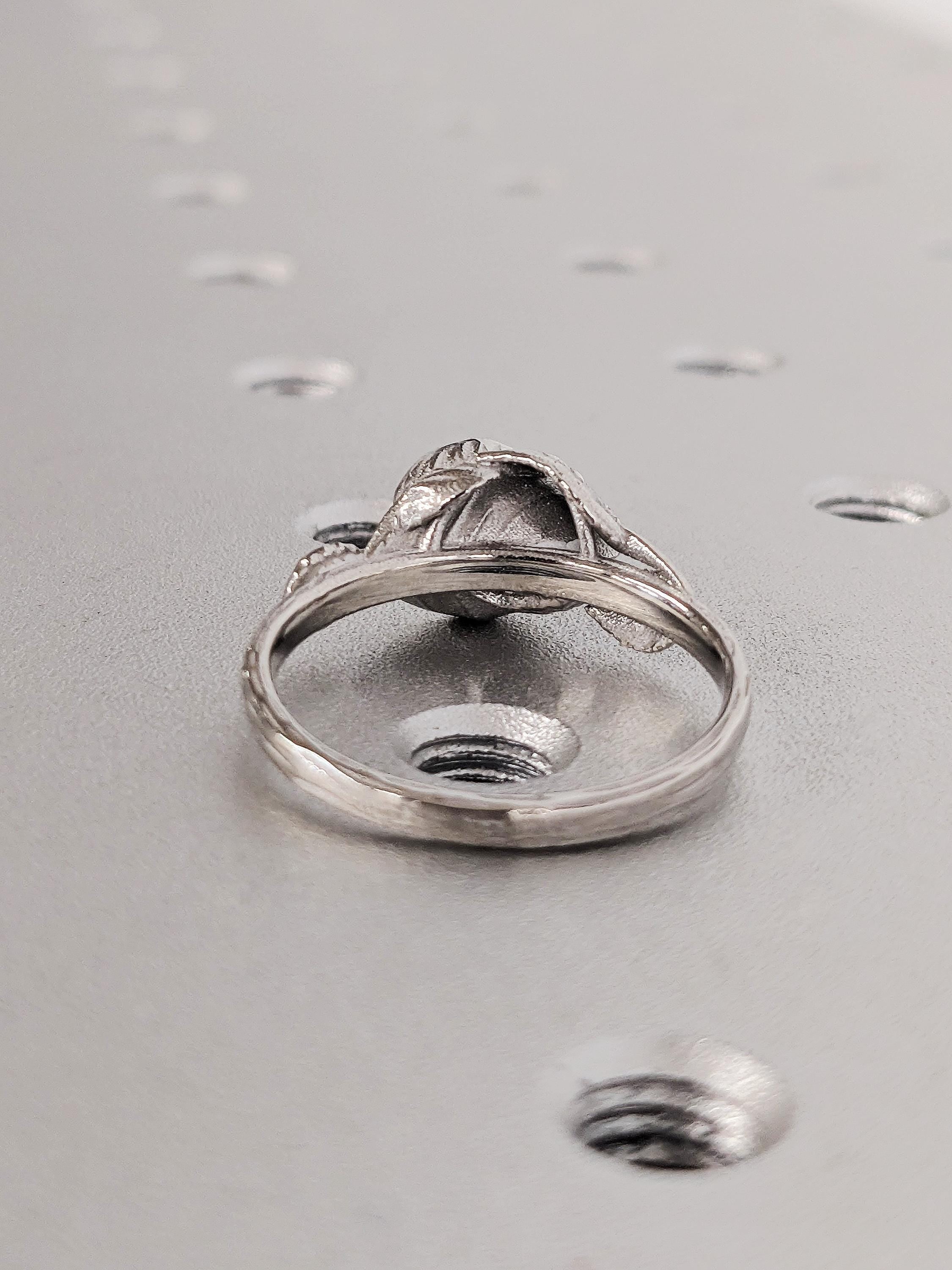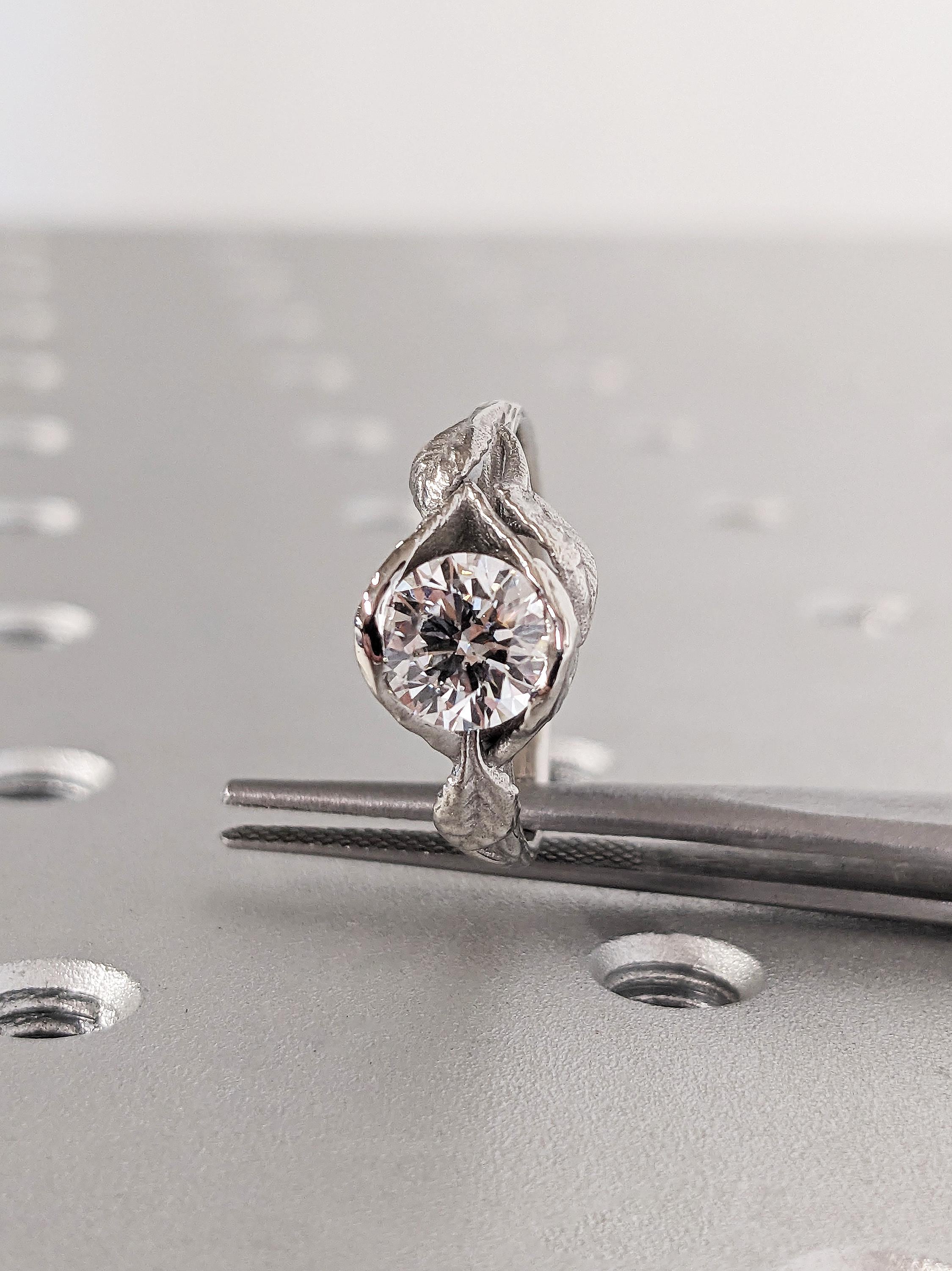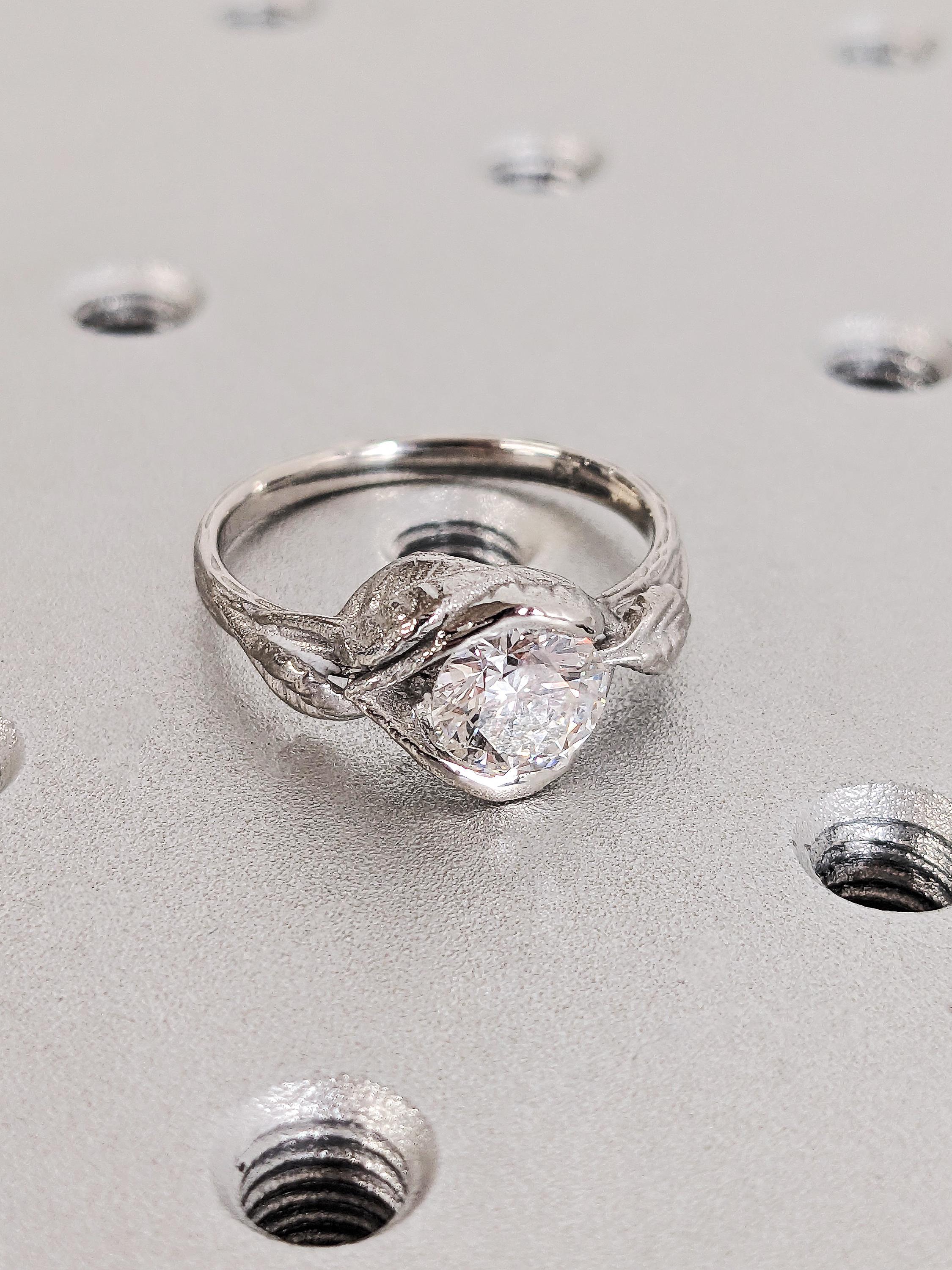 This ring set captures the beauty of nature with its delicate floral design. A brilliant round cut Lab Diamond takes center stage, paired with lotus leaves band. Crafted with fine detail, this piece blends elegance with symbolism, making it a meaningful choice for engagements, weddings or anniversaries.