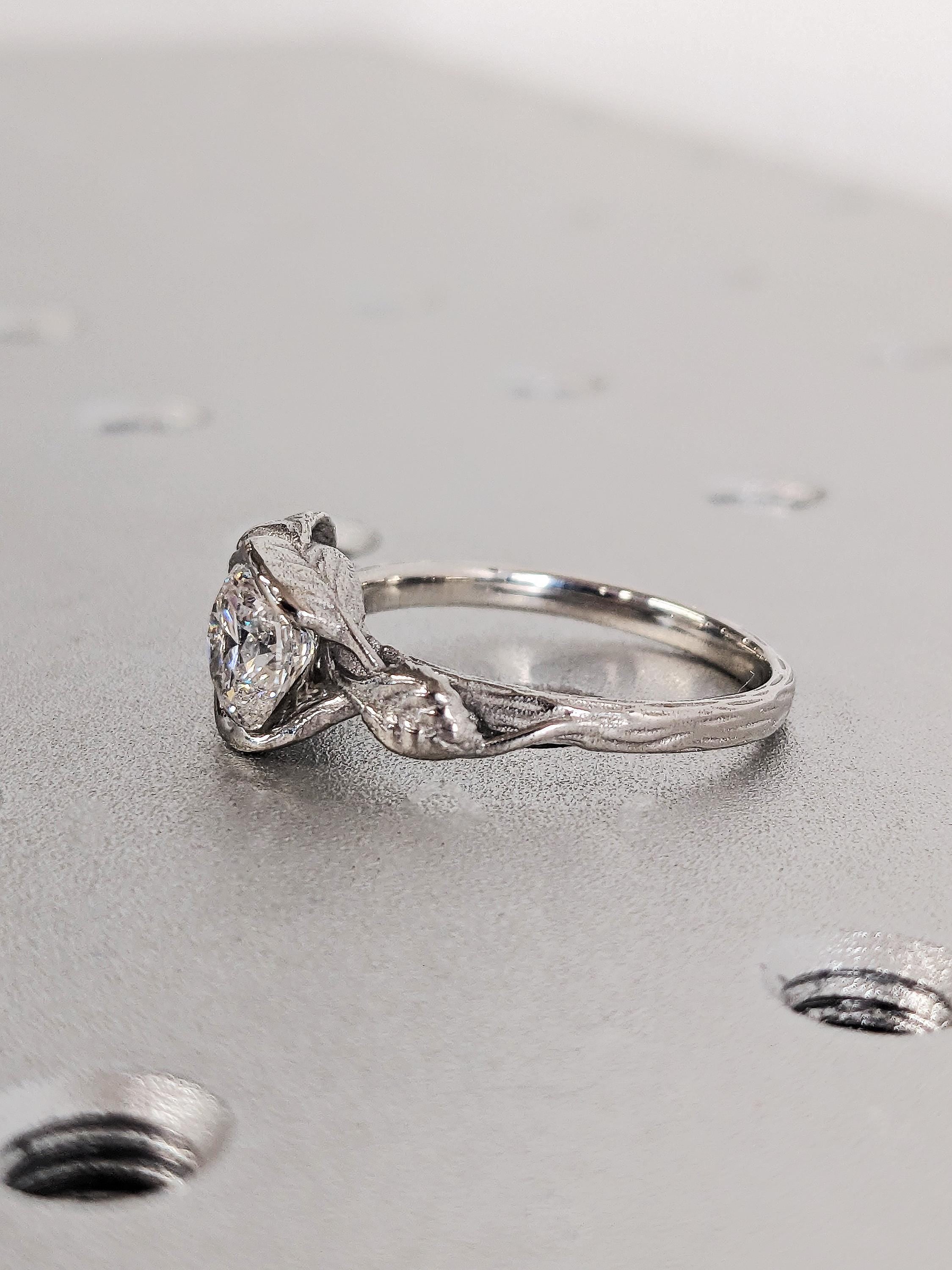 Platinum Solitaire Lab Grown Diamond Engagement Ring, Lotus Leaves Flower White Diamond Wedding Band, Unique Bridal Jewelry
