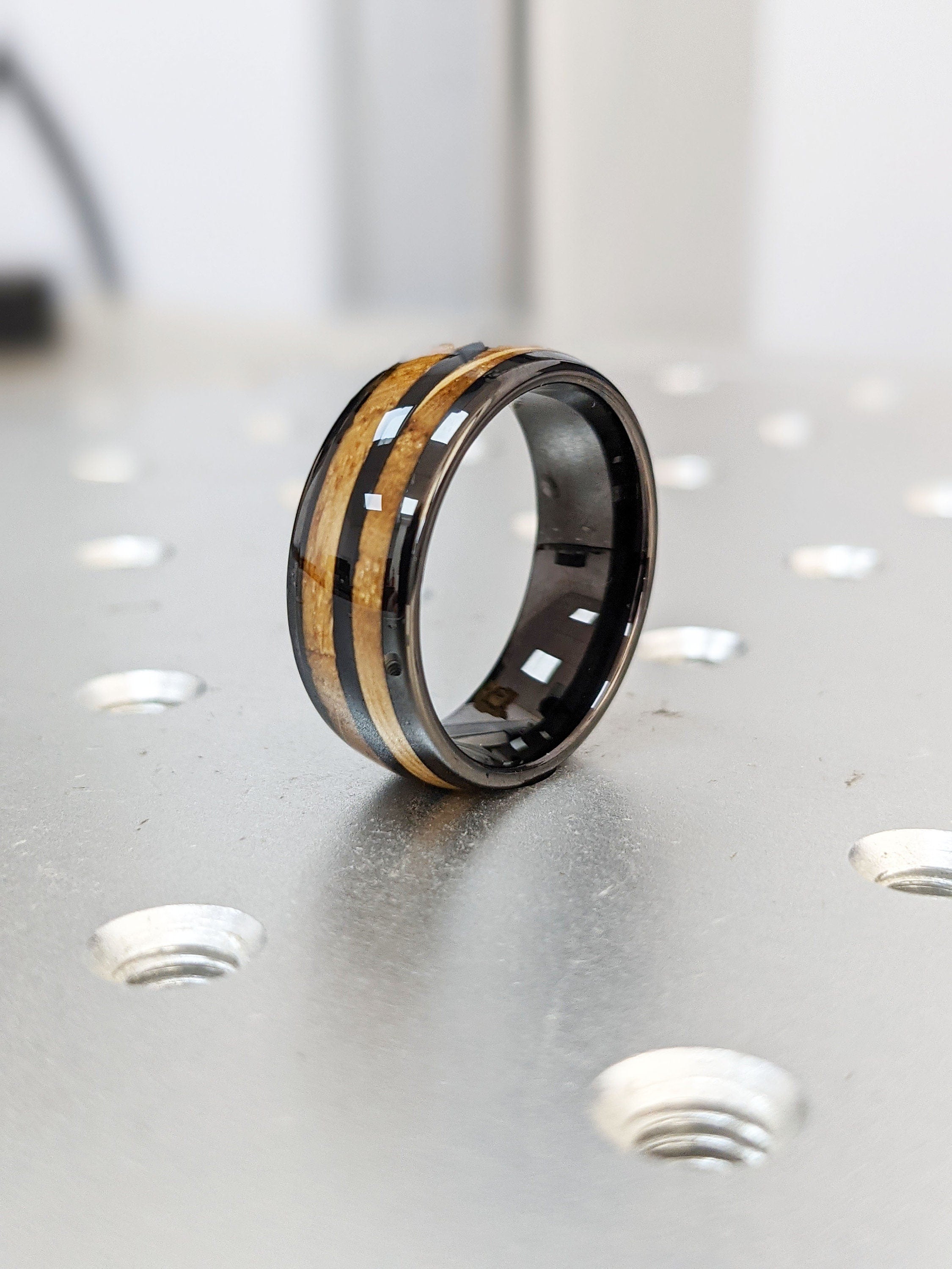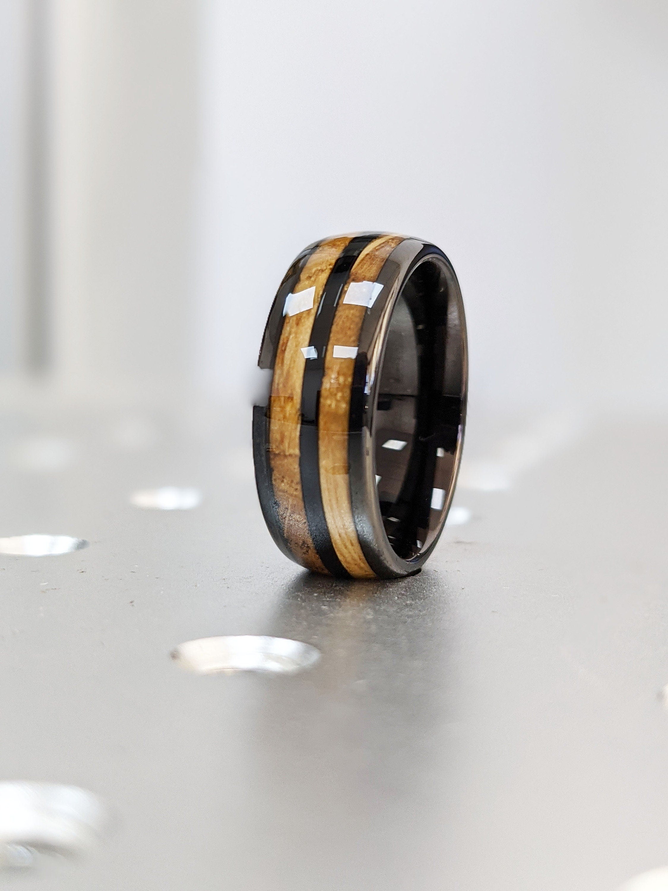 Polished Black Plated Tungsten Male Engagement Ring | Double Koa Wood Inlay Dome Shaped Wedding Band | Black Mens Ring | Rustic Wedding Ring