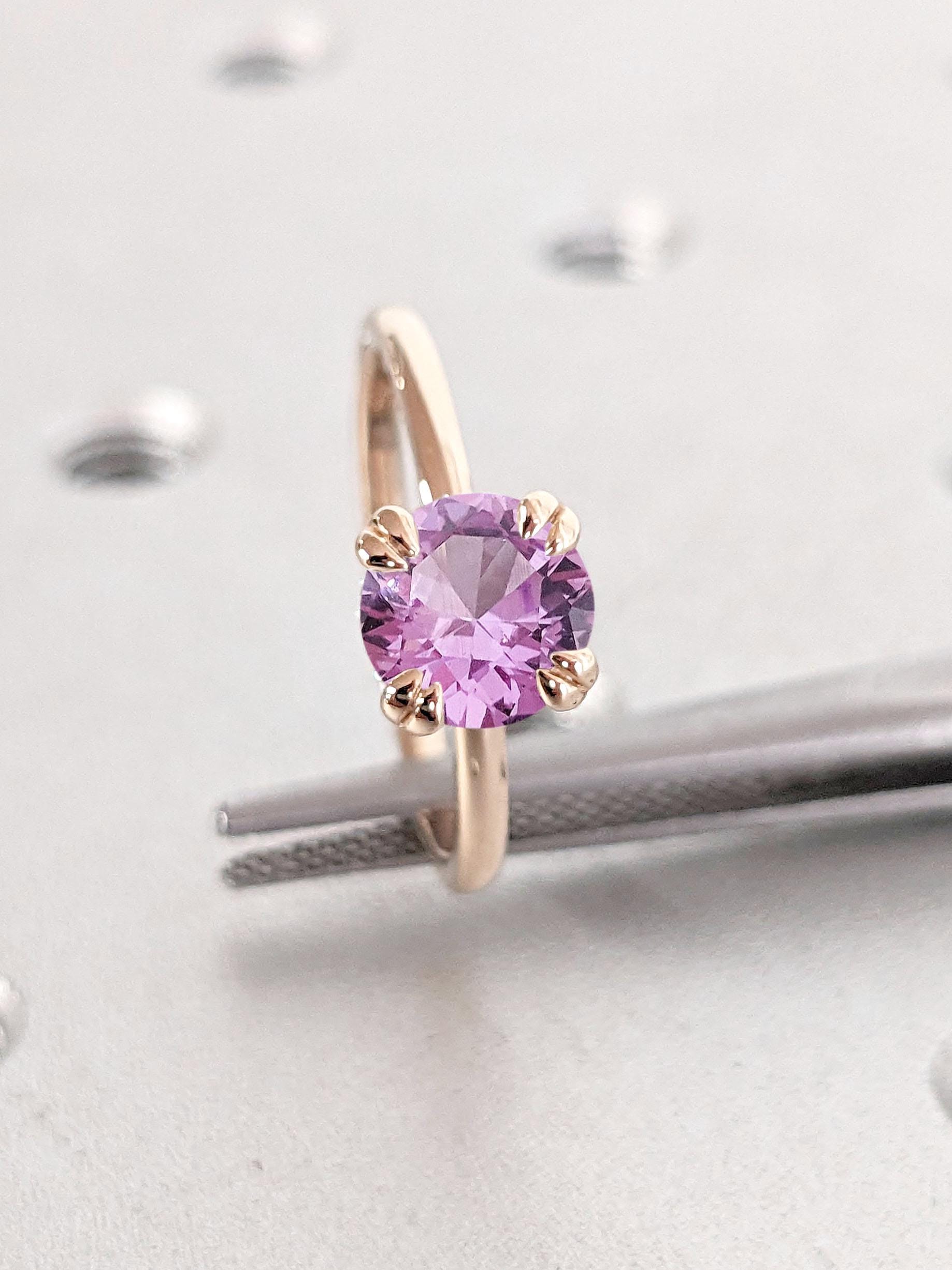 A unique double claws prong ring, features a solitaire round cut Lab Alexandrite center stone, held gently atop a lotus flower basket setting, on a dainty 1.6mm width comfort fit band. Simple yet elegant, makes this handmade jewelry a wonderful gift to be cherished.