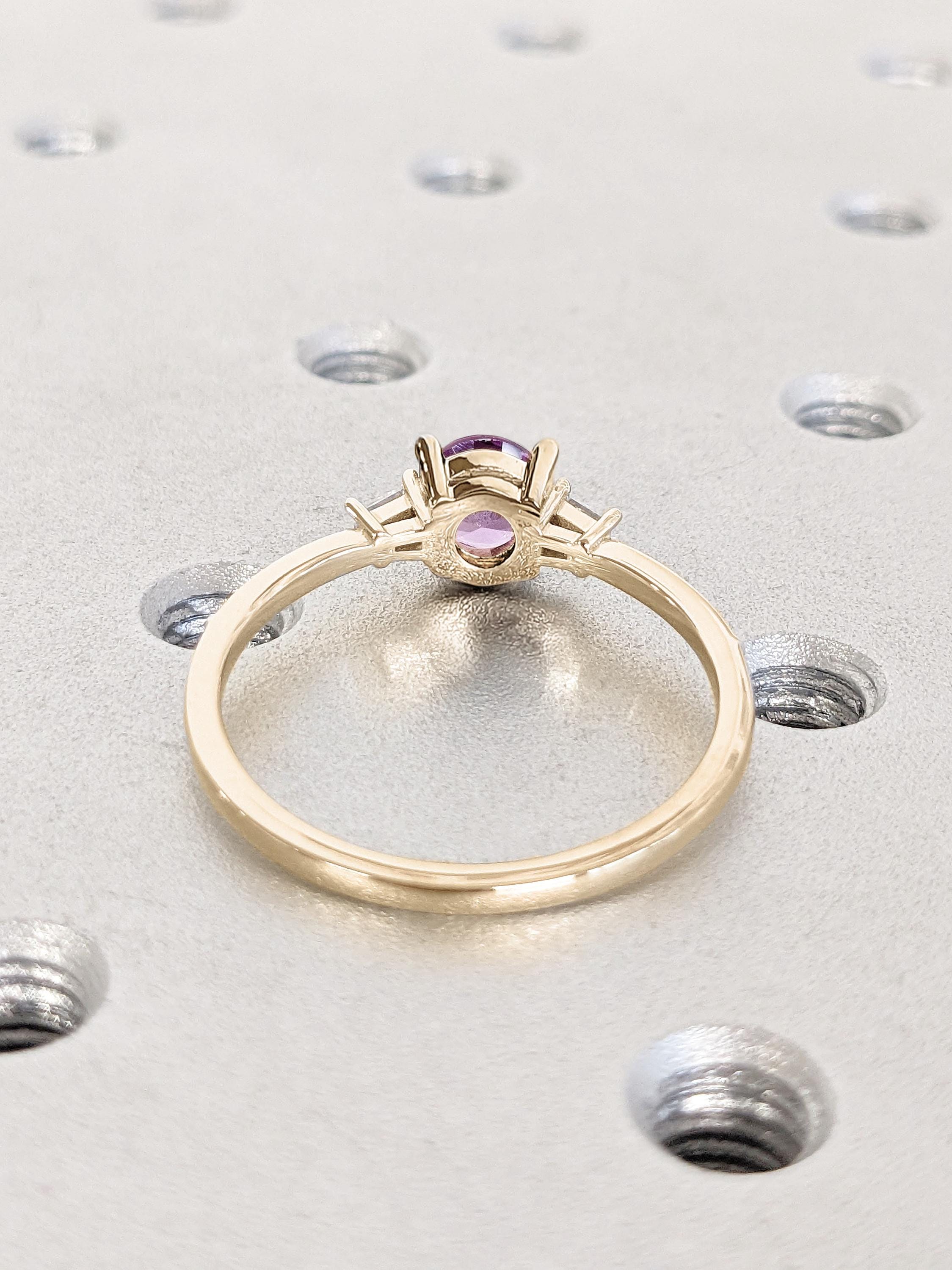 A dainty handmade ring, features a round cut Lab Alexandrite center. Accented by baguette cut side stones in your choice of natural diamonds, lab diamonds or moissanites. With intricate rope pattern engraving on its thin band of 1.6mm width. This unique ring blends classic element with a modern flair.