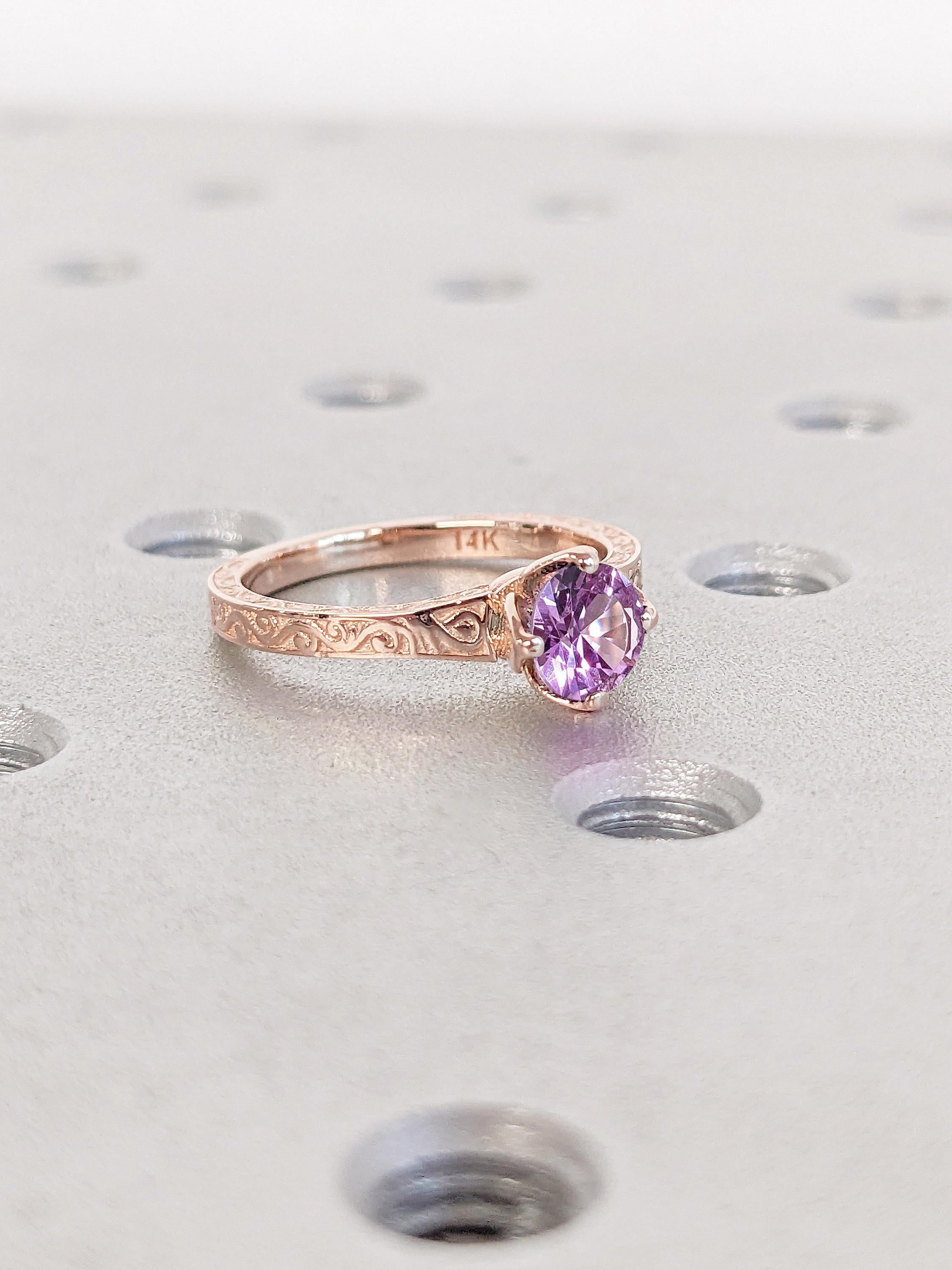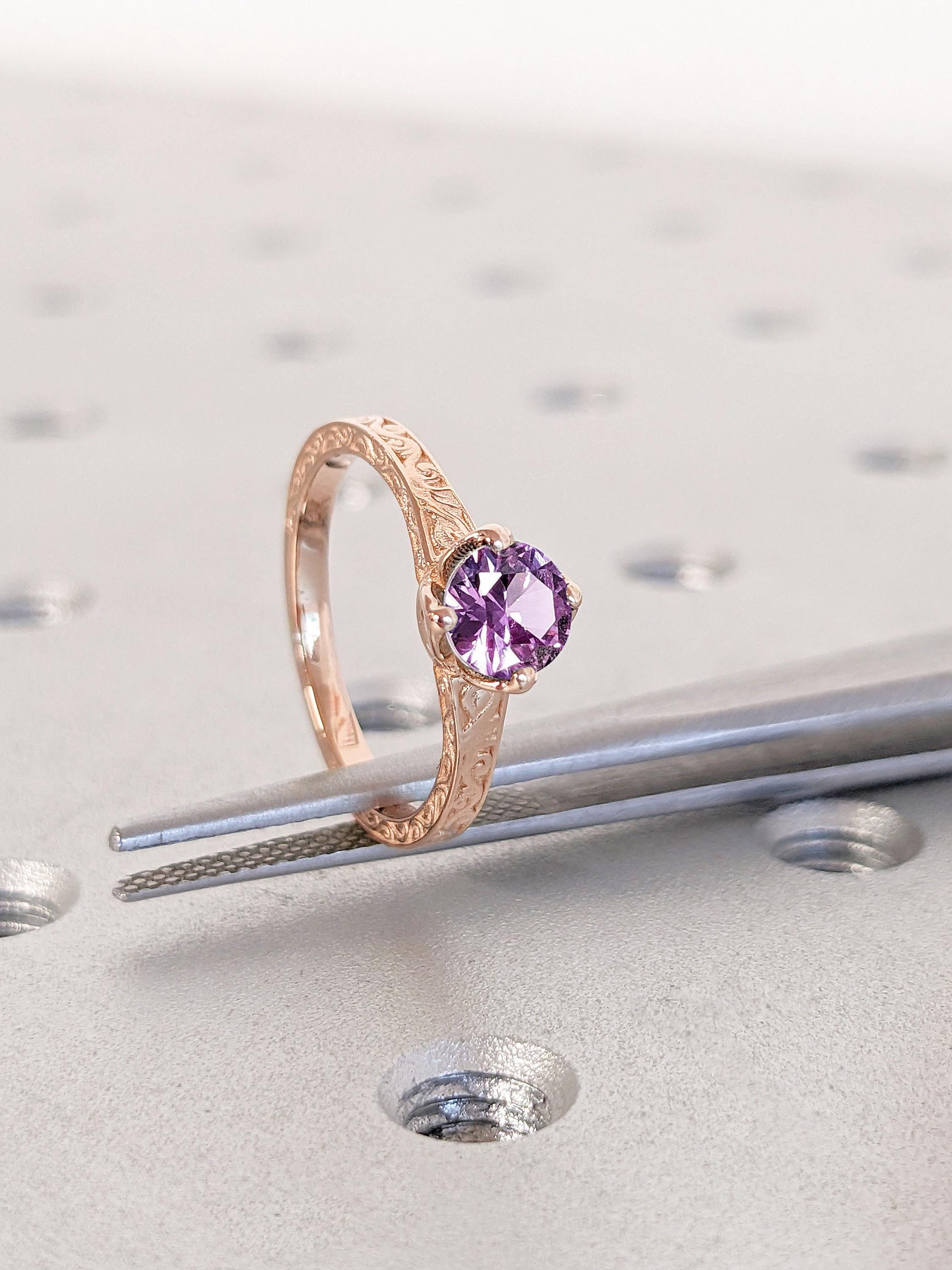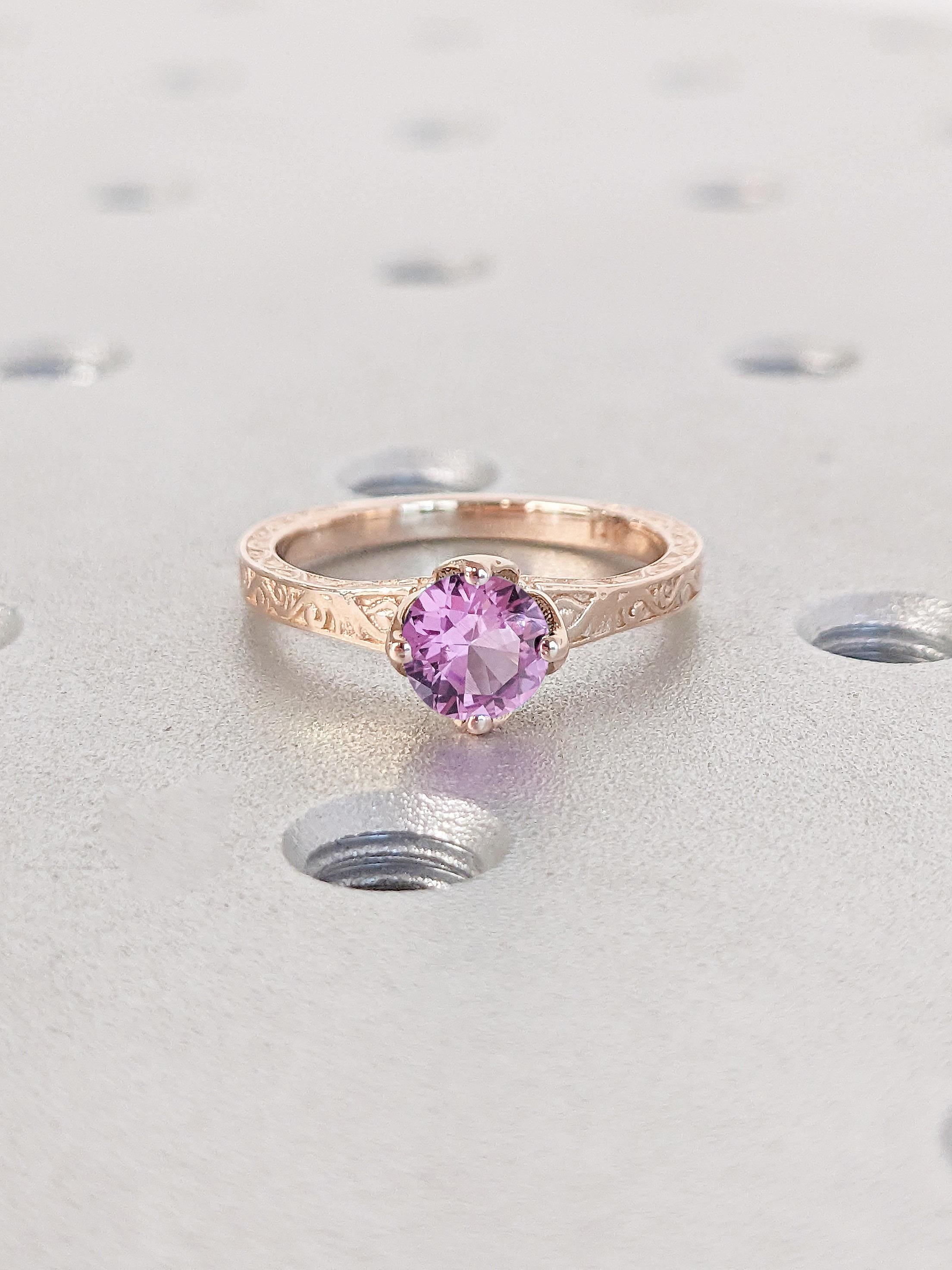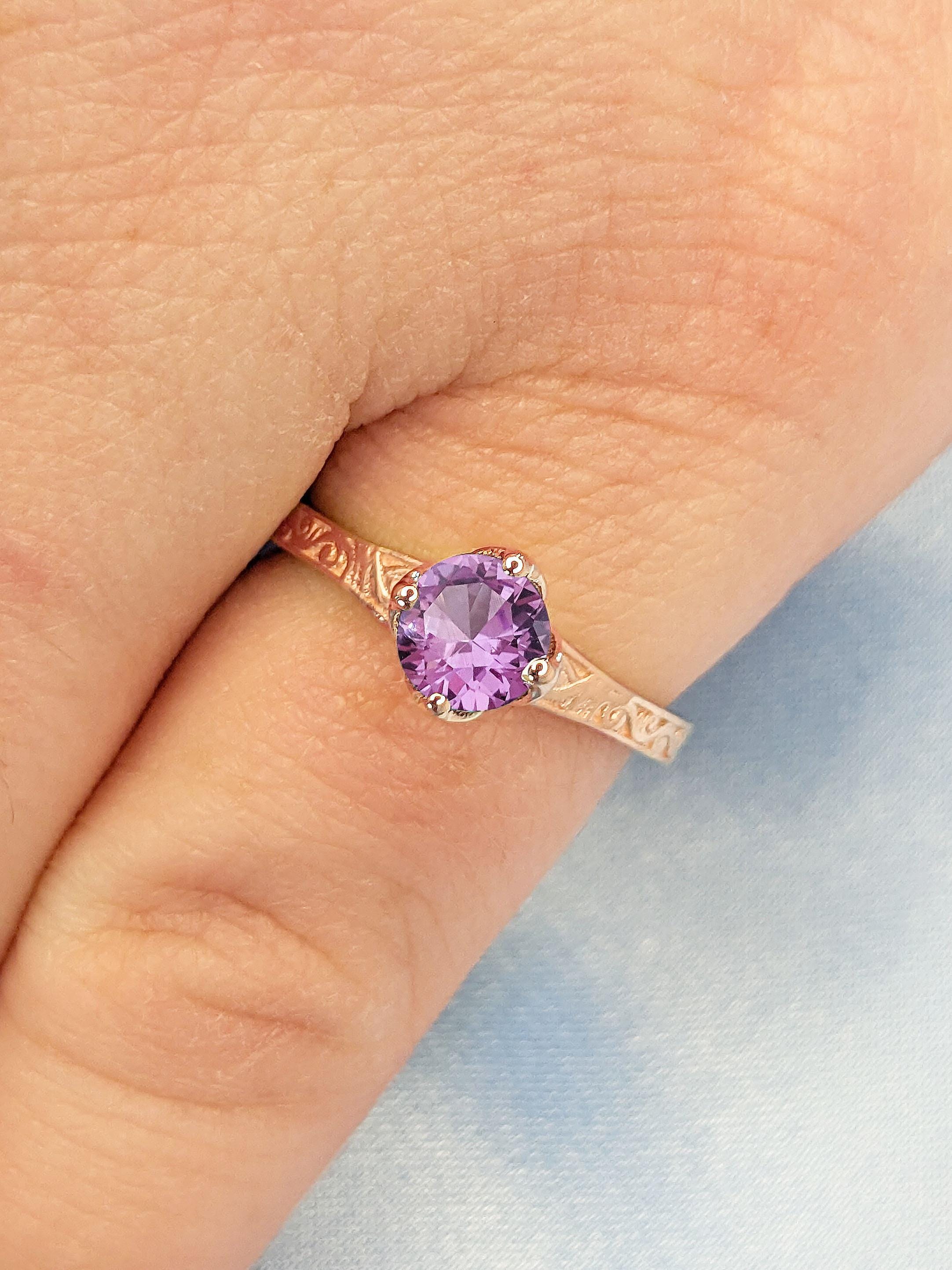 Enchanting and timeless, our vintage-inspired engagement ring features a captivating round cut Lab Alexandrite with a mesmerizing purple hue. Nestled in a secure tulip basket setting on a square-shaped band, the ring is embellished with exquisite undulating wave filigree, creating a perfect representation of your enduring love story.