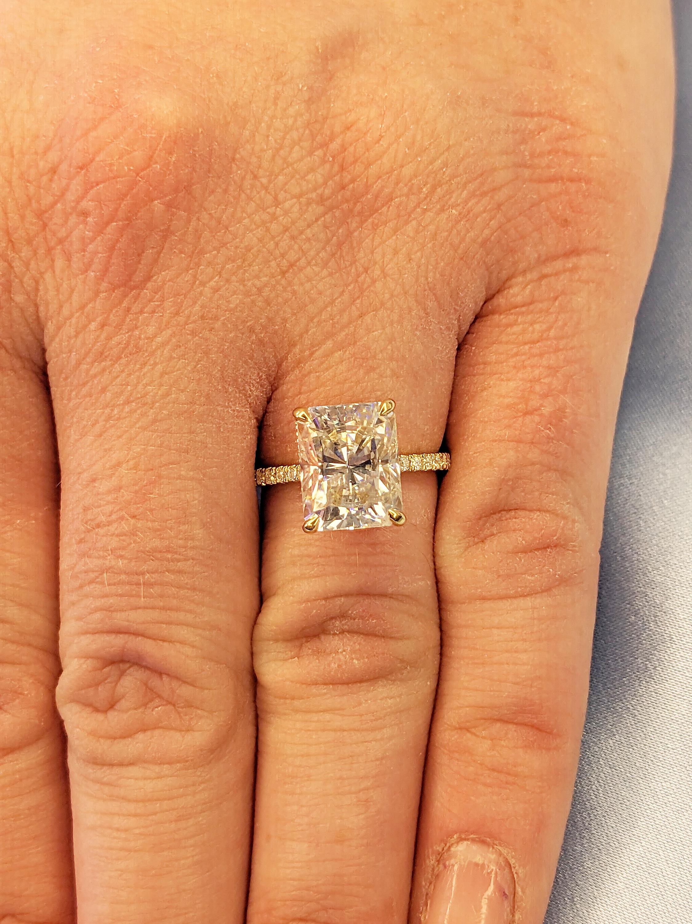 This radiant cut Lab Grown Diamond engagement ring exudes timeless elegance, featuring a dazzling center stone secured in a refined setting. A hidden halo of sparkling gems adds brilliance from every angle, while the half eternity band enhances the design with continuous shimmer. Both the hidden halo and half eternity accents are available in your choice of Natural Diamonds or Moissanite, making this ring a truly customizable symbol of love.