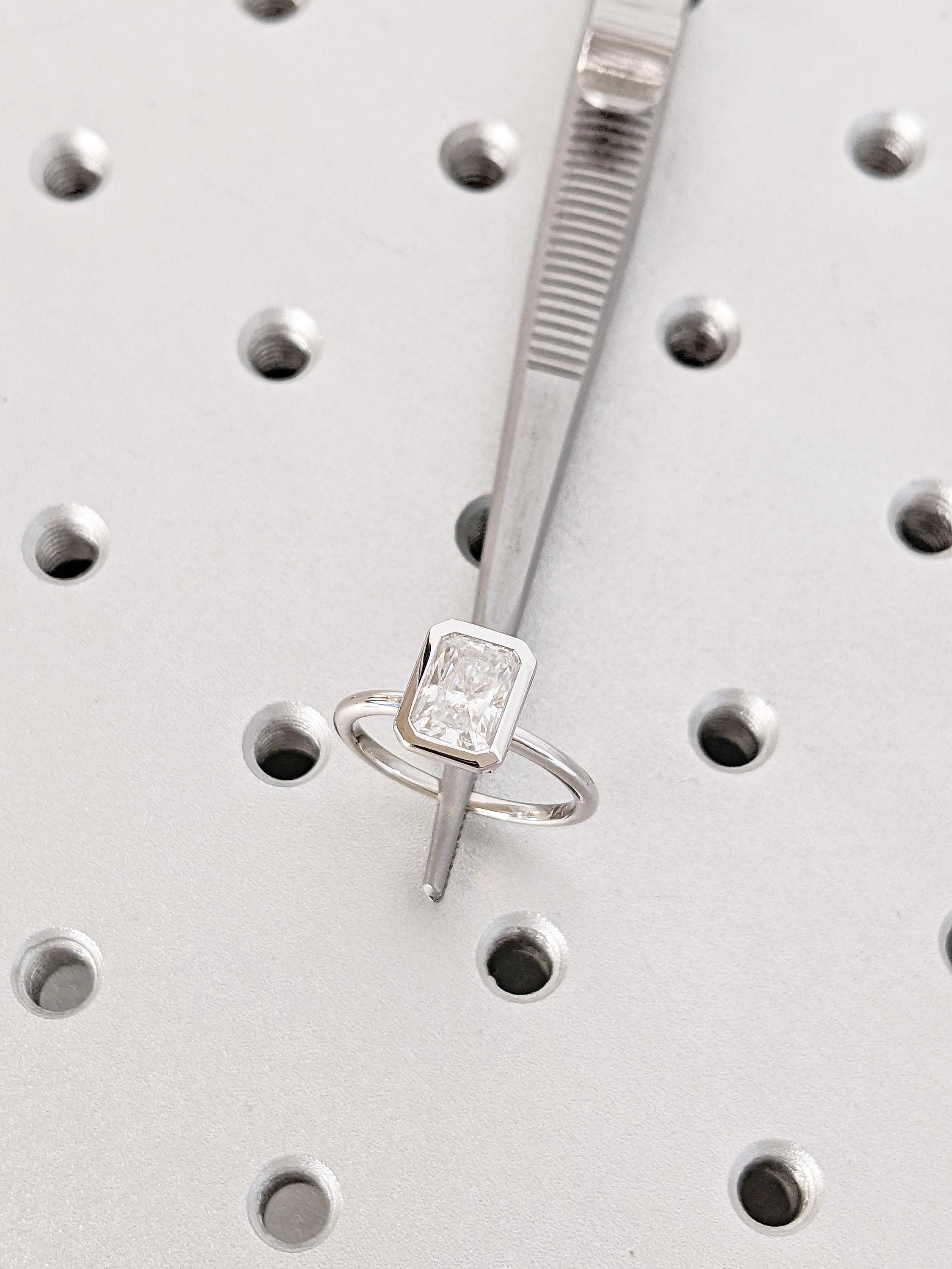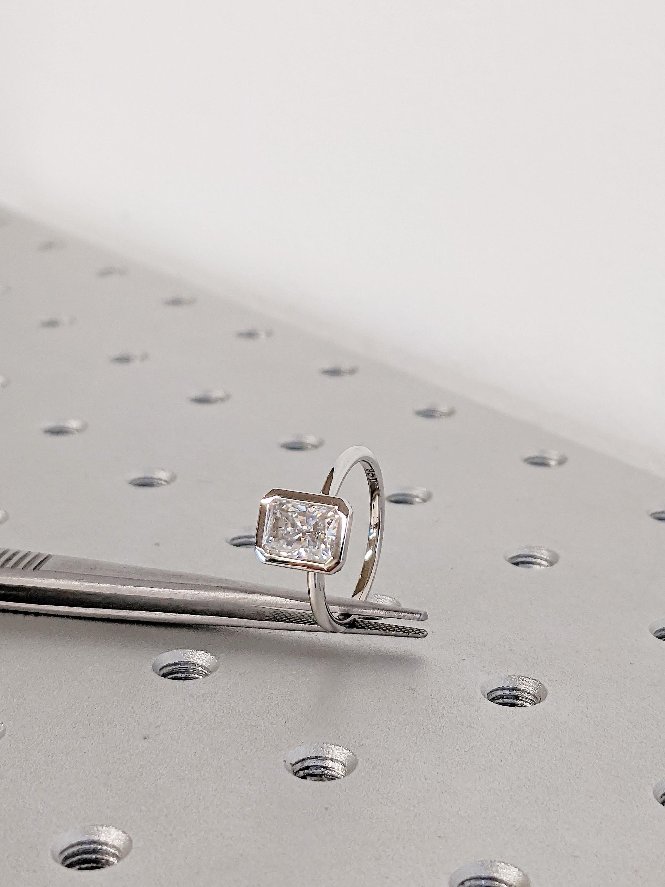 This radiant cut Moissanite ring is designed for brilliance and modern simplicity. The bezel setting frames the stone beautifully, giving it a sleek and secure finish while letting the sparkle shine from every angle. With its clean lines and dainty silhouette, this piece is perfect as an engagement ring, a timeless wedding band, or a minimalist everyday ring. A modern yet classic choice that brings elegance to any jewelry collection.