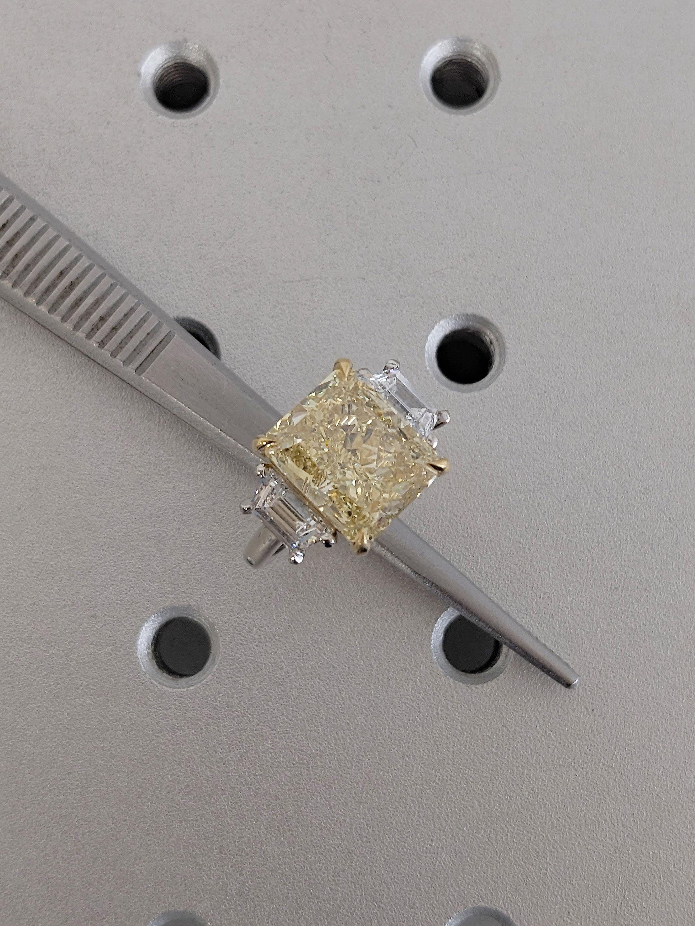 This radiant cut yellow Lab Grown Diamond engagement ring makes a bold yet refined statement. The vivid yellow center stone is beautifully framed by sleek trapezoid-cut lab grown diamond side stones that enhance its brilliance and symmetry. Finished in an elegant two-tone design, the contrasting head and shank add depth and sophistication, creating a timeless ring that feels both modern and luxurious.