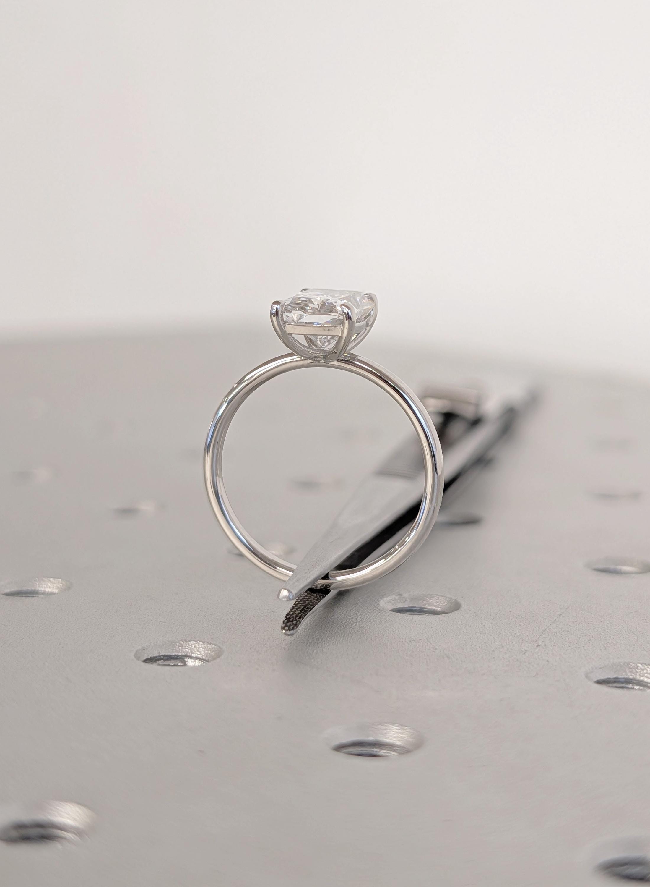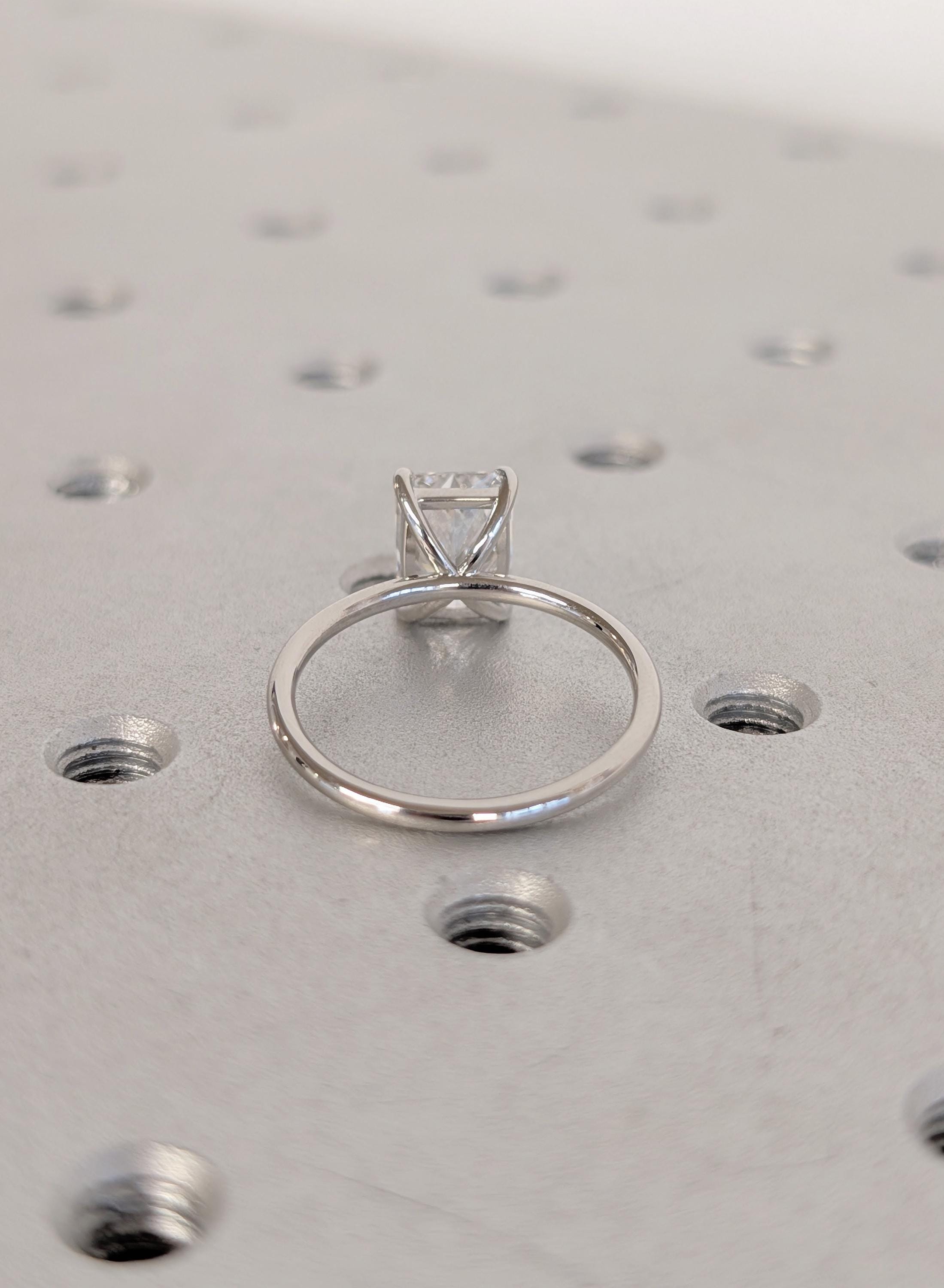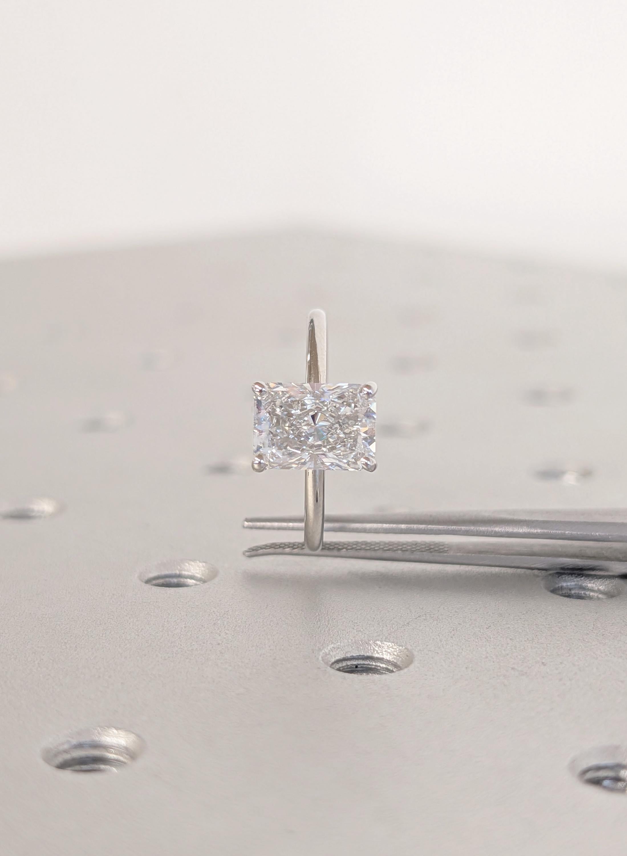 This radiant cut Moissanite ring features a sleek prong setting for a blend of modern brilliance and timeless elegance. Perfectly durable for everyday jewelry, this versatile piece is an ideal bridal ring, anniversary band, or ethical promise ring.