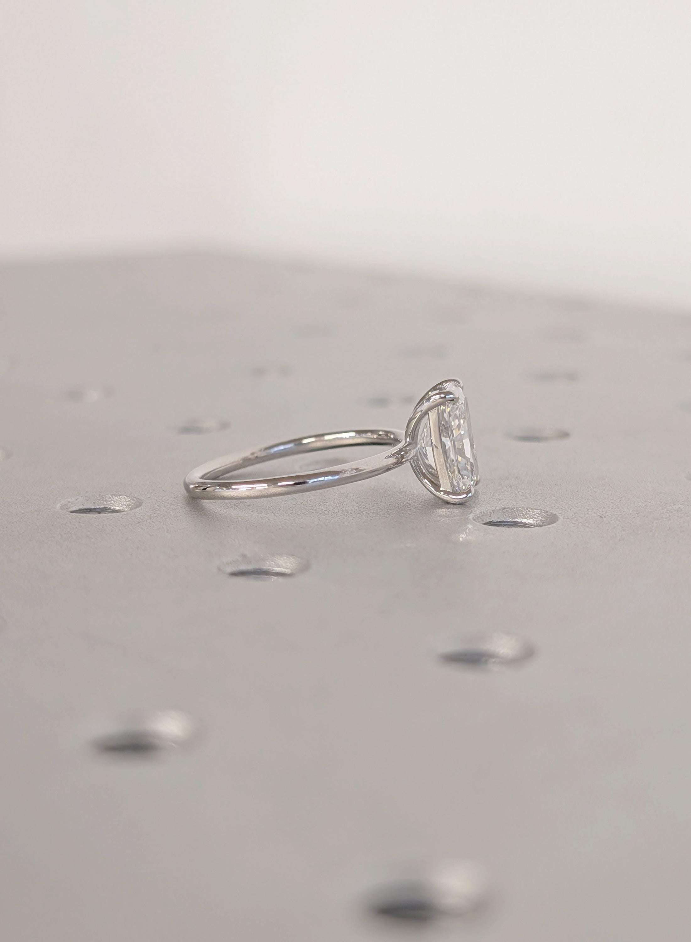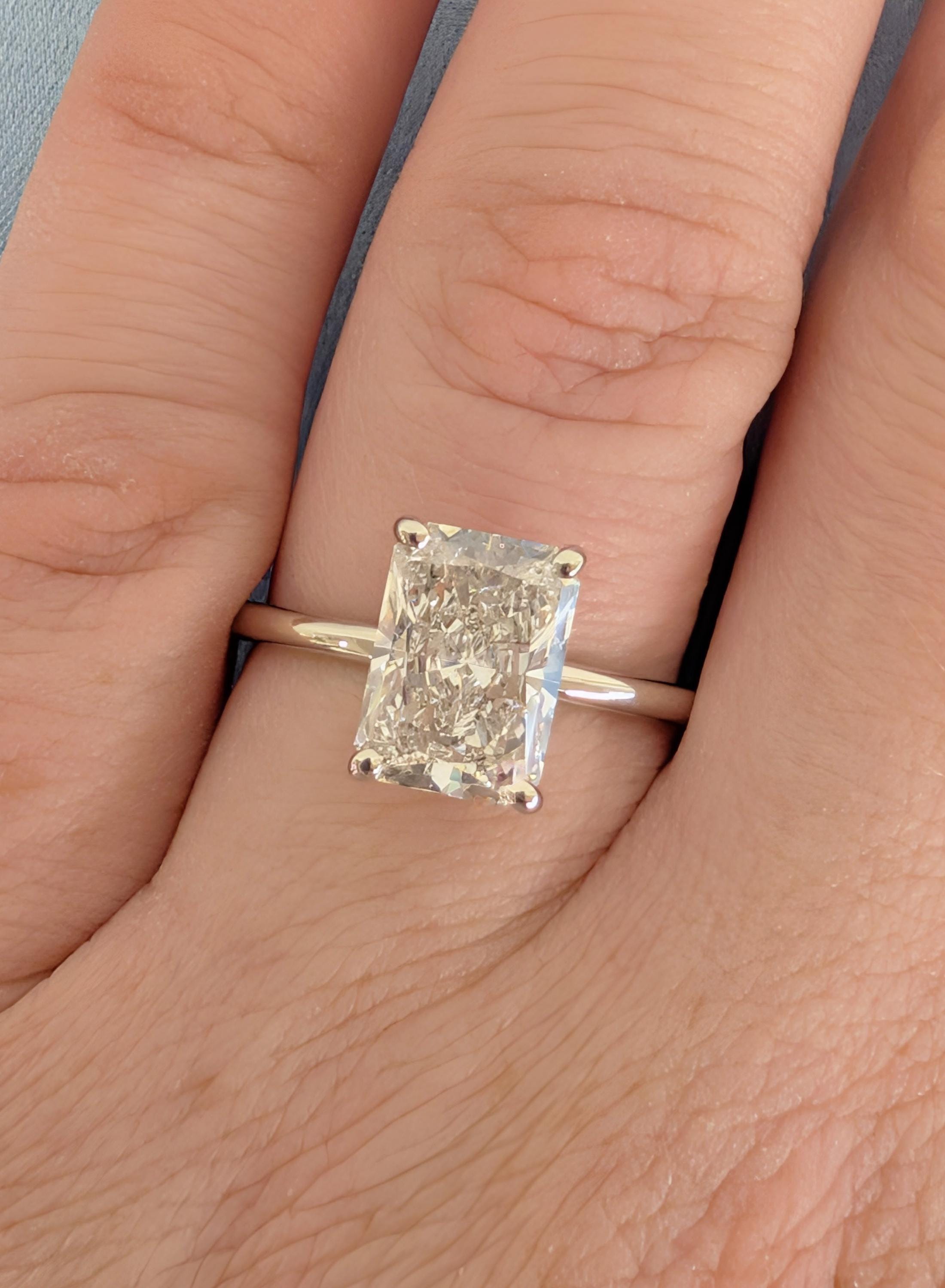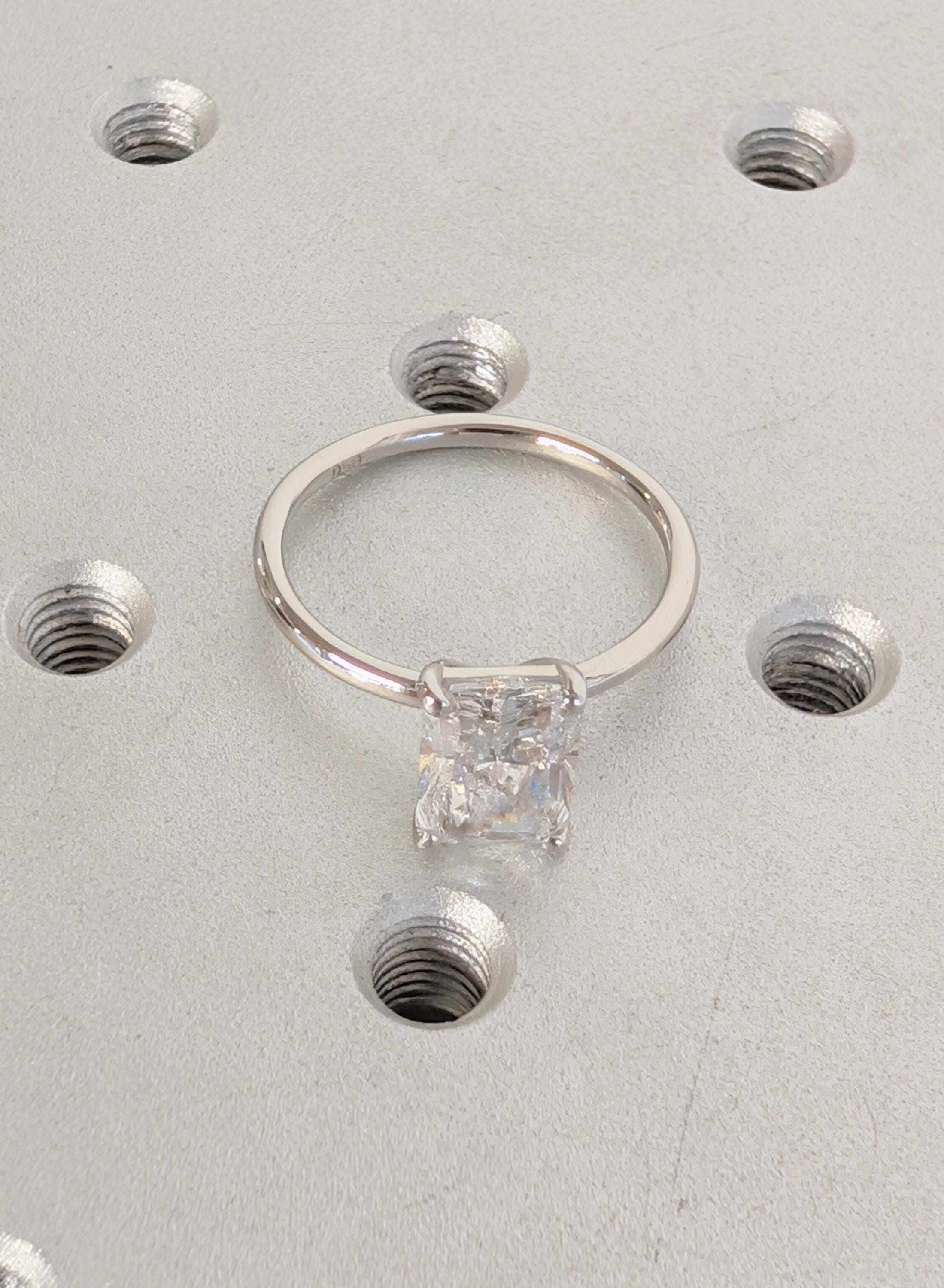 This radiant cut Moissanite ring features a sleek prong setting for a blend of modern brilliance and timeless elegance. Perfectly durable for everyday jewelry, this versatile piece is an ideal bridal ring, anniversary band, or ethical promise ring.