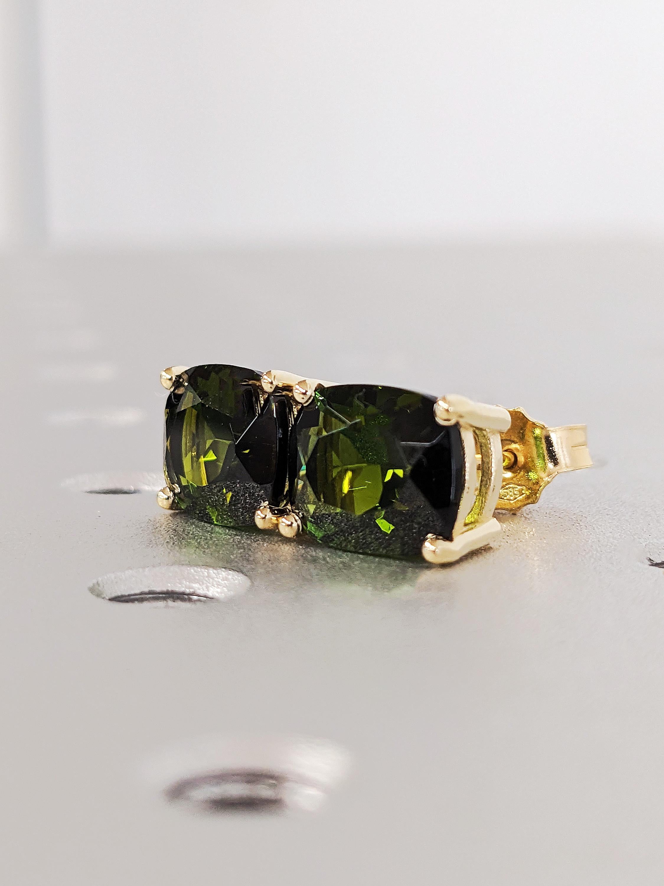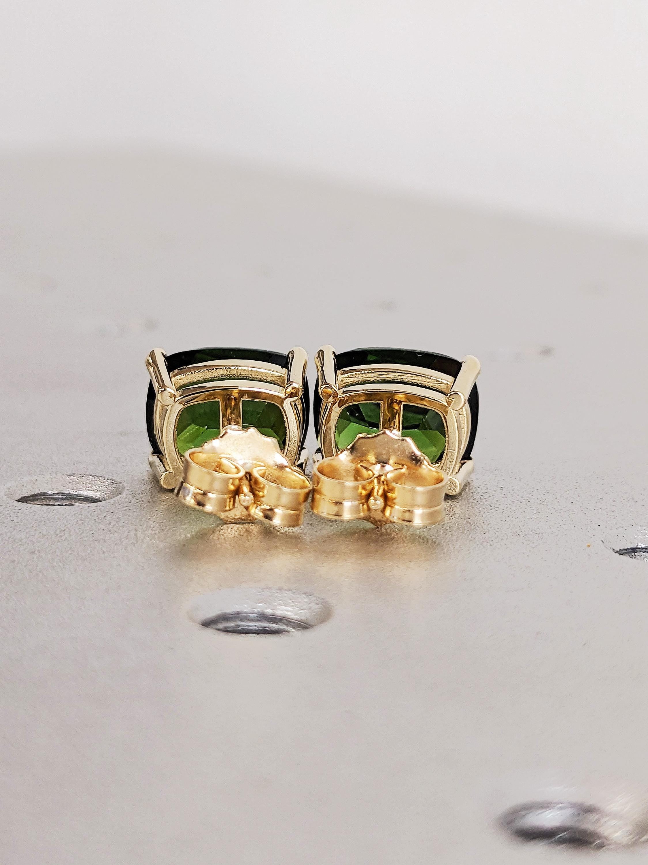 Rare Gold Tourmaline Studs Earrings, Cushion Cut Green Birthstone Studs, 14K Yellow Gold Screw Back Earrings