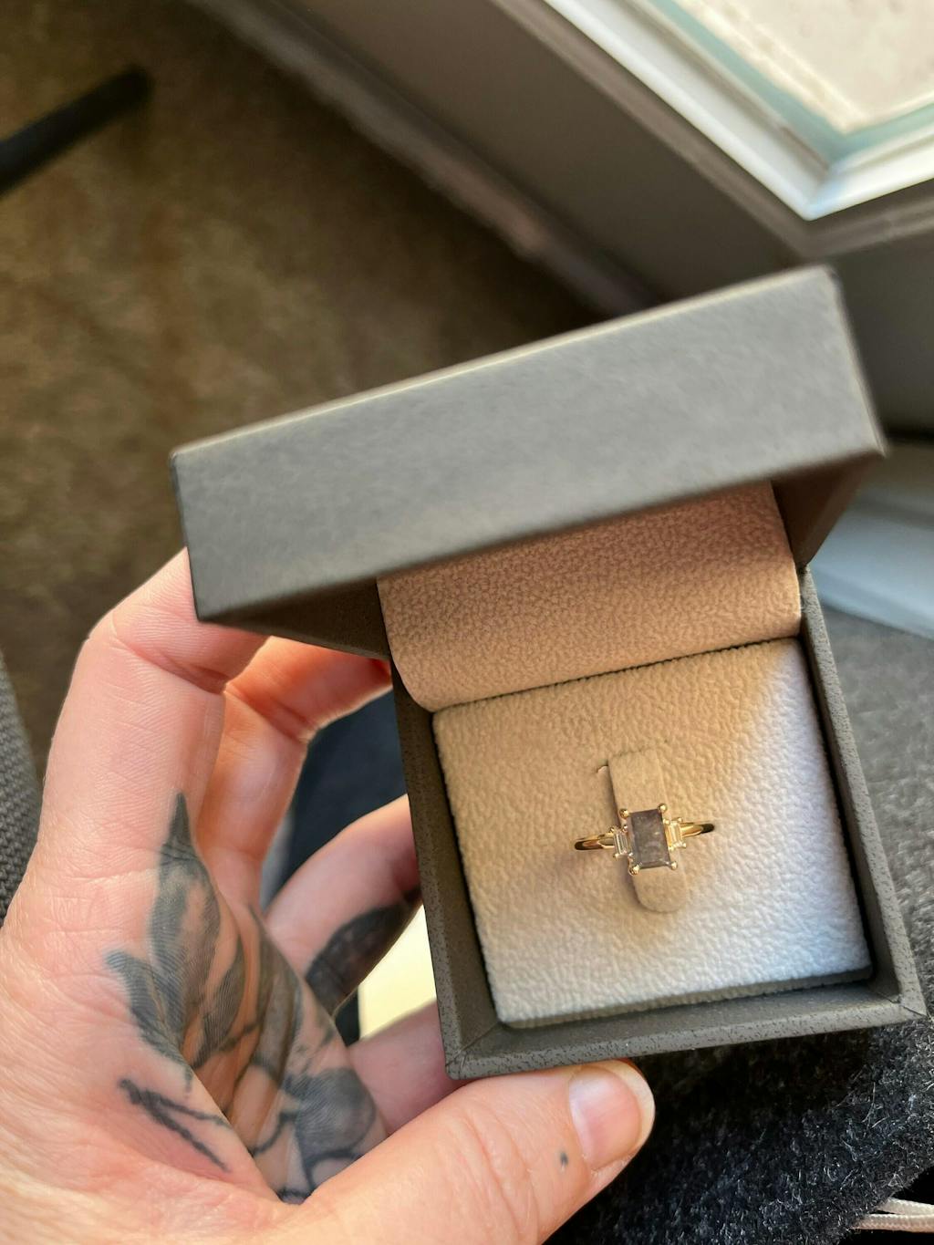 Raw Diamond baguette Diamond, Salt and Pepper, Unique Bridal Engagement, Rose Cut Geometric Diamond Ring, Custom Handmade