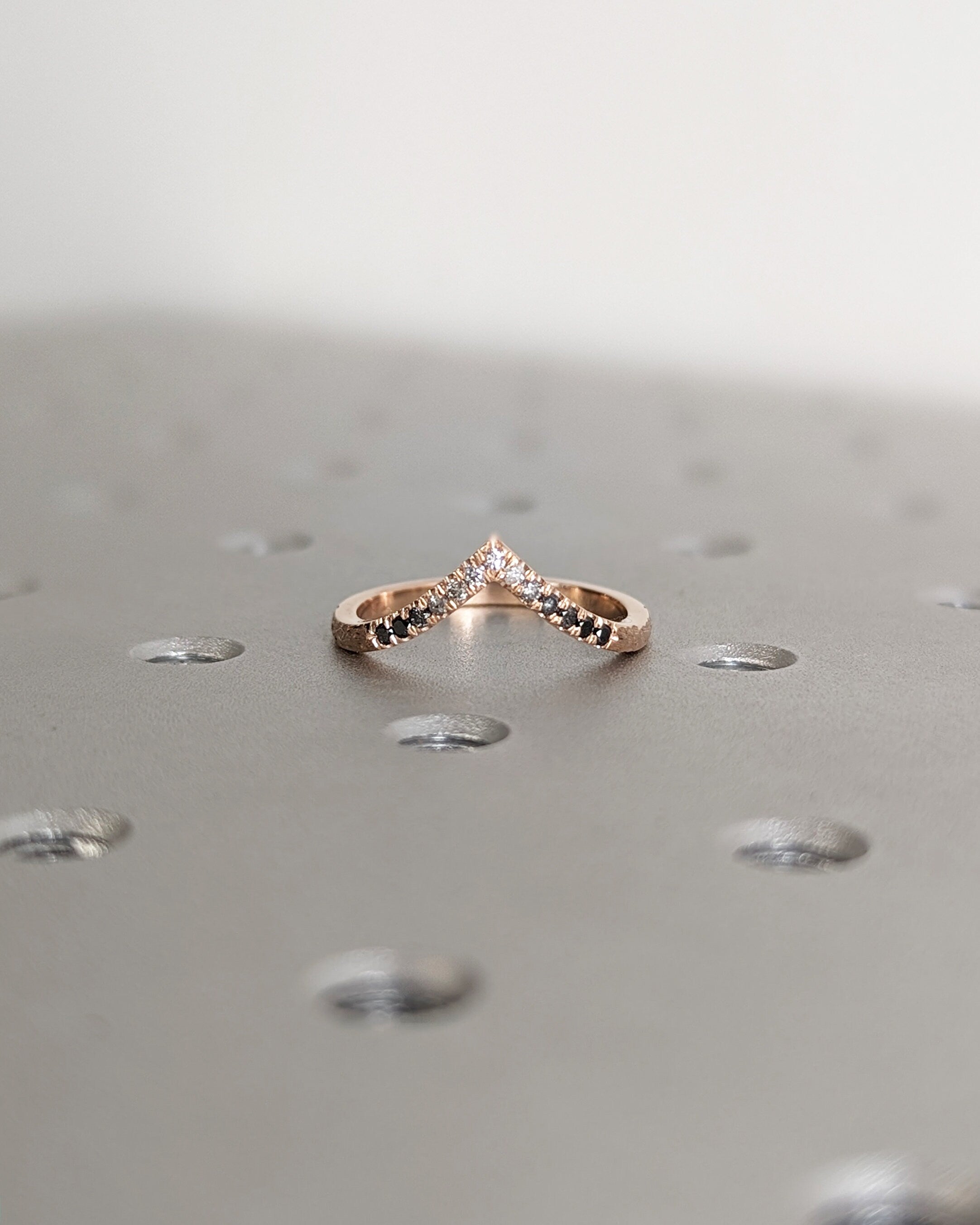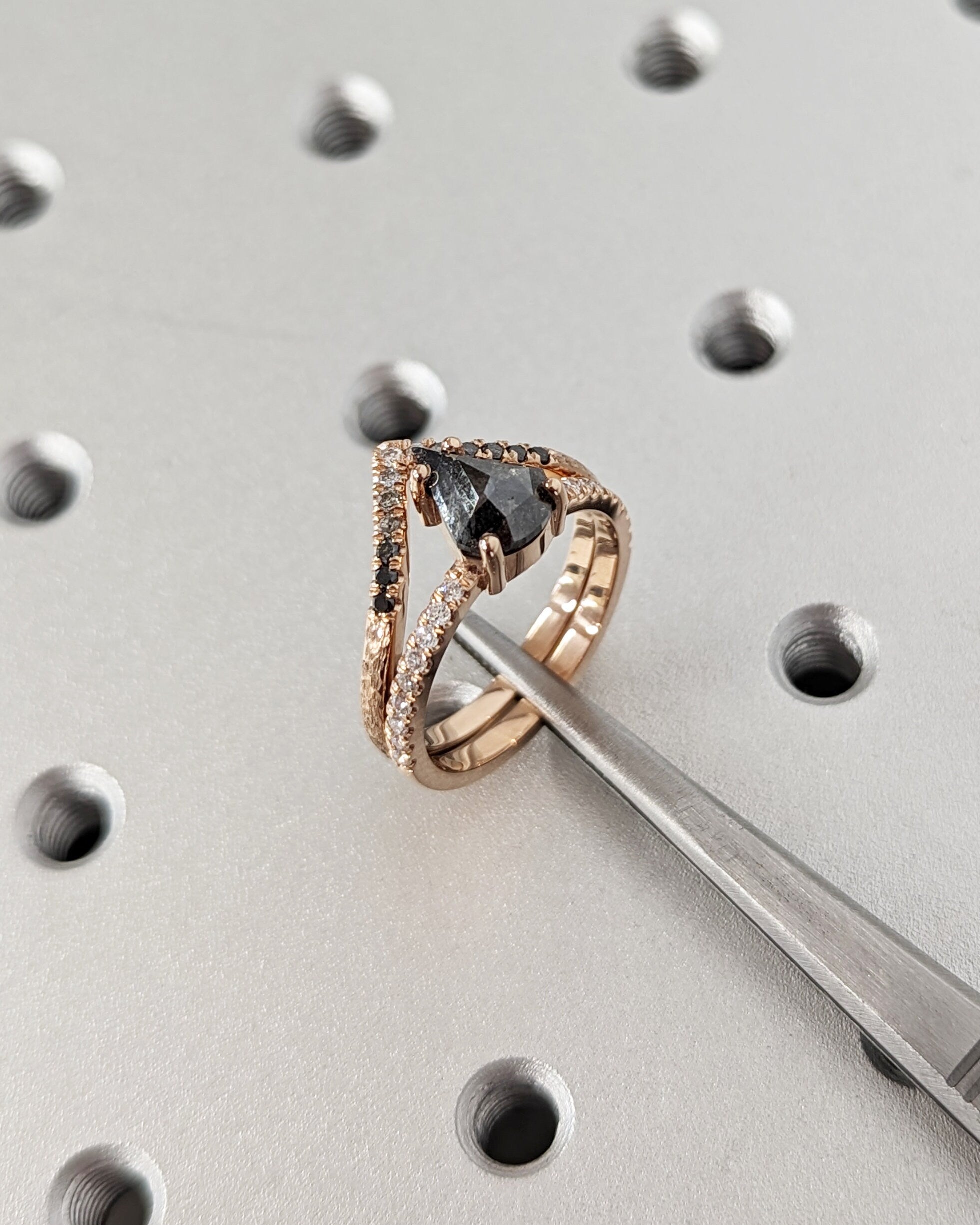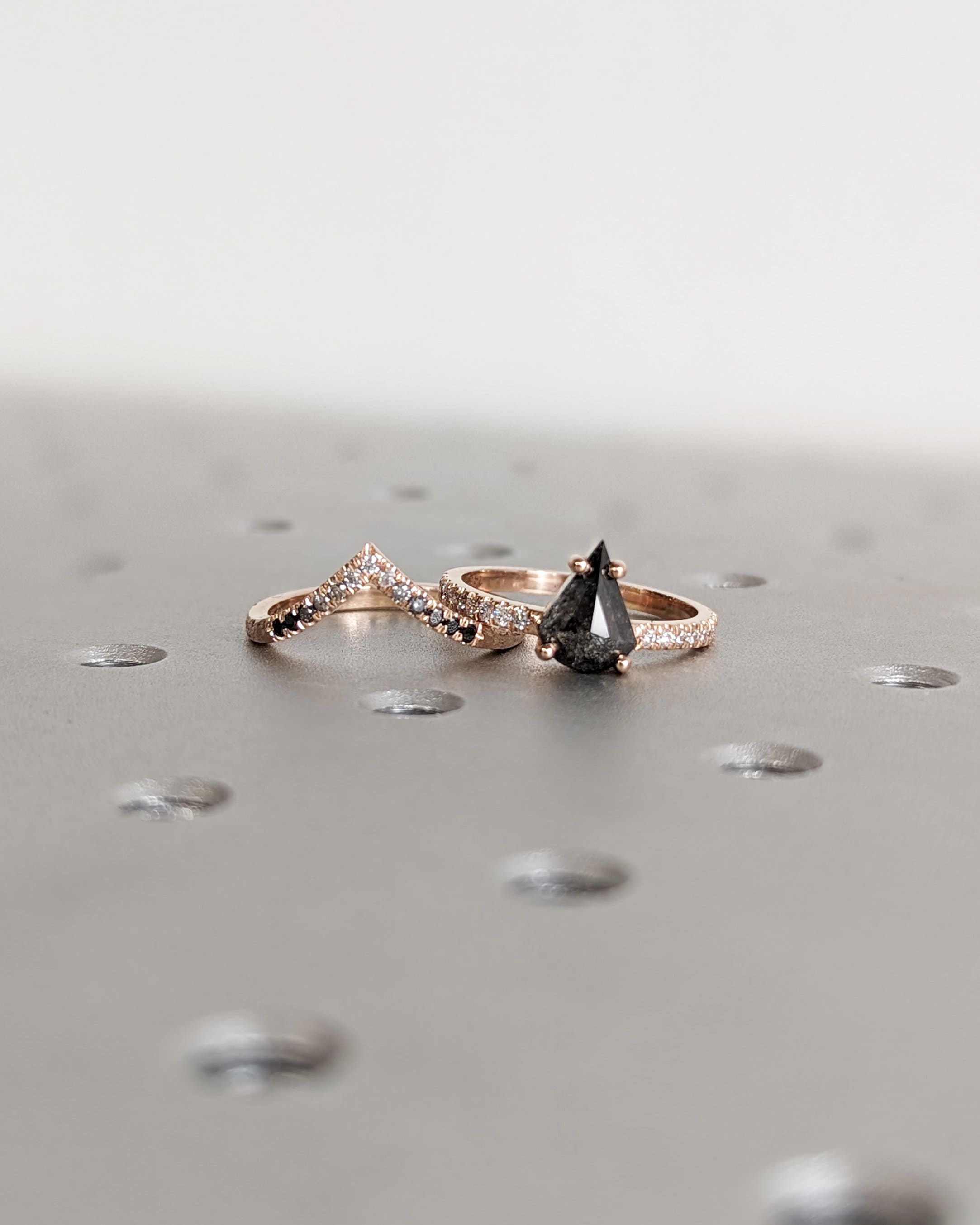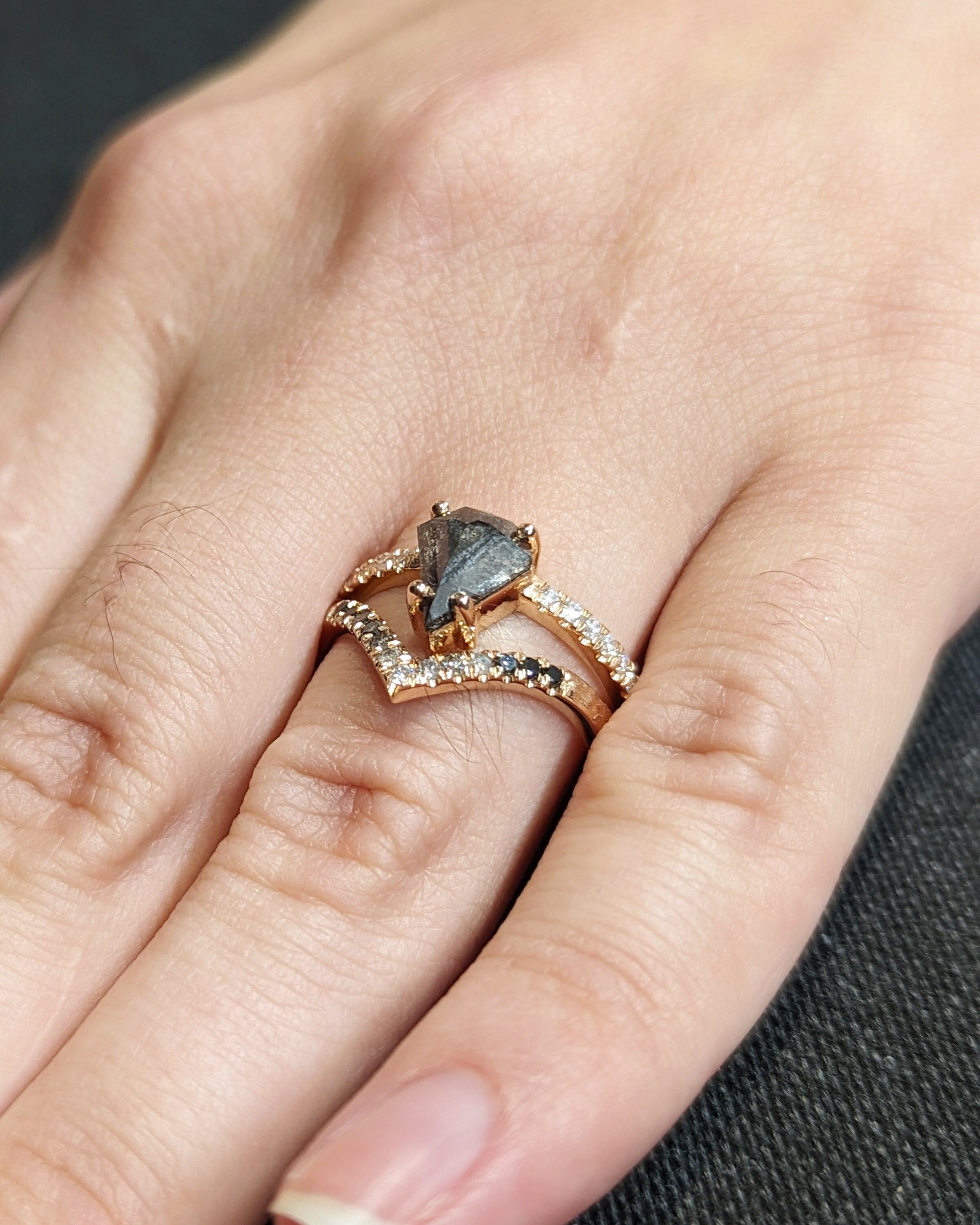 Radiate romance with our Fan Cut Salt and Pepper Diamond Engagement Ring, featuring a meticulously paved 2mm band accented with natural diamonds. Complete the love story by combining it effortlessly with our hammered ombre chevron wedding ring for a truly enchanting pairing.