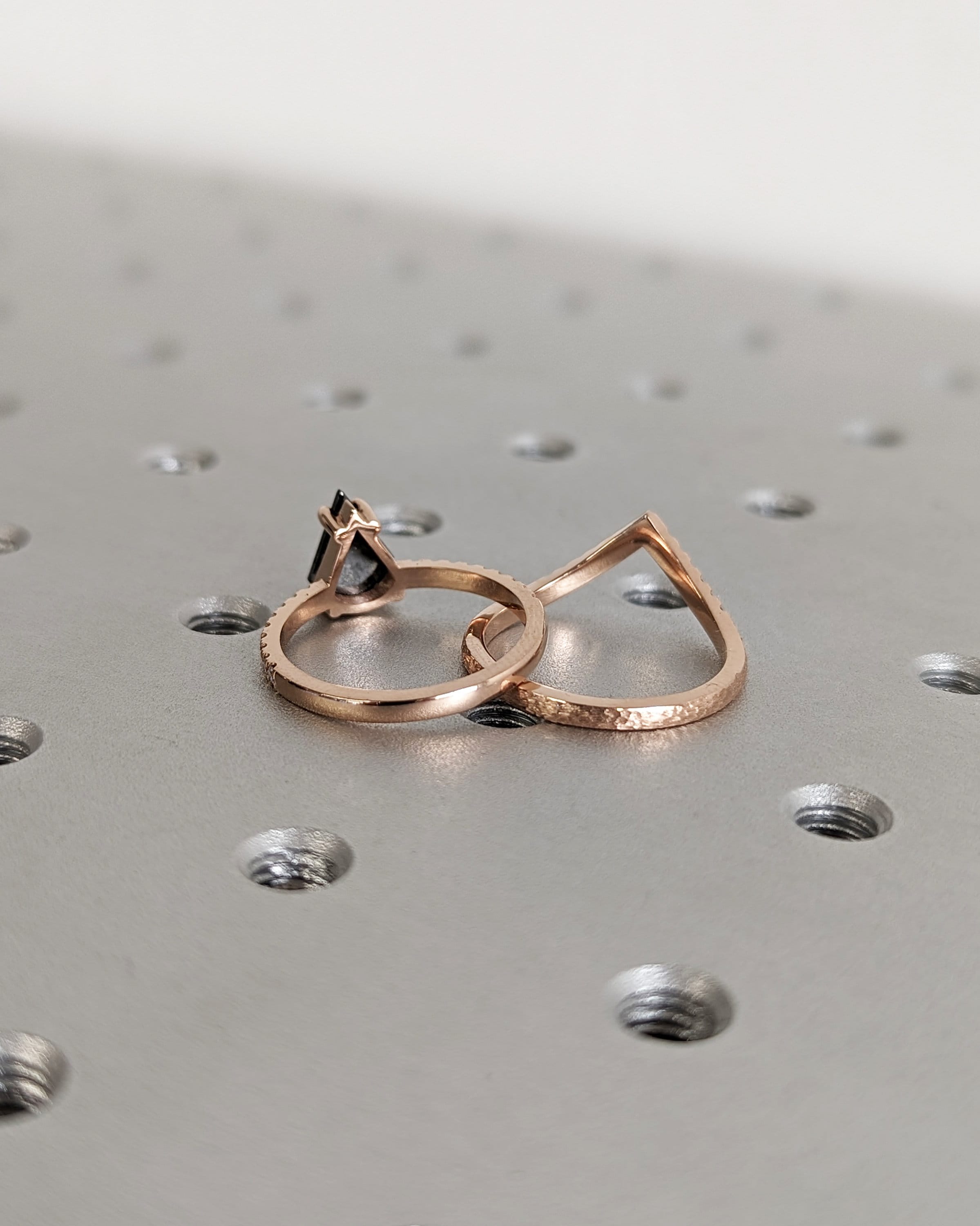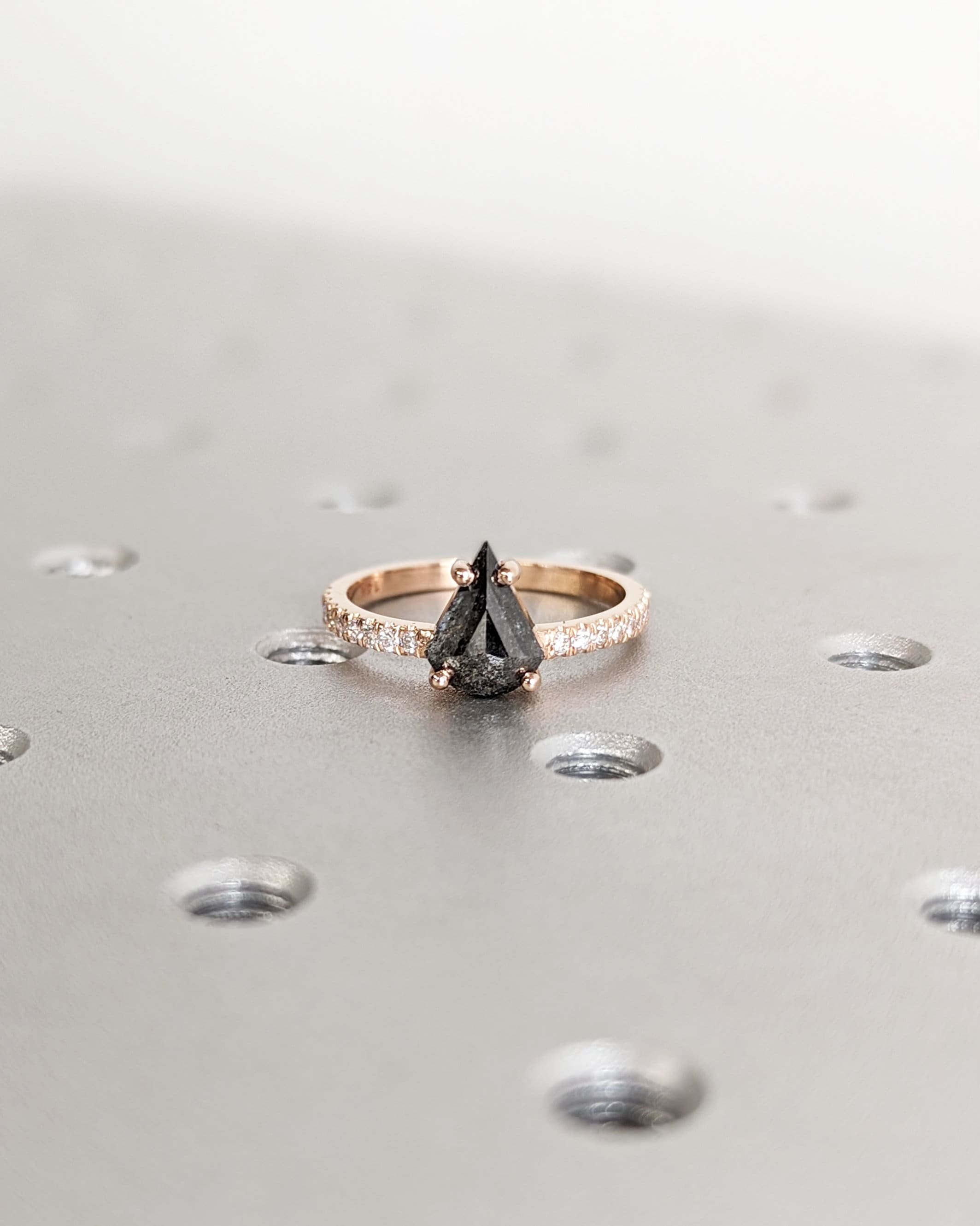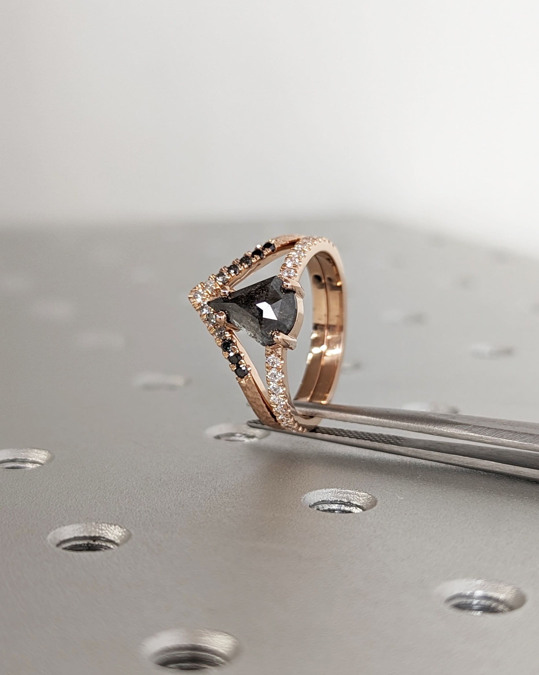 Raw Diamond Fan Cut Diamond, Salt and Pepper, Unique Engagement Ring, Rose Gold Geometric Diamond Ring, 14k Gold, Custom Handmade, Hammered