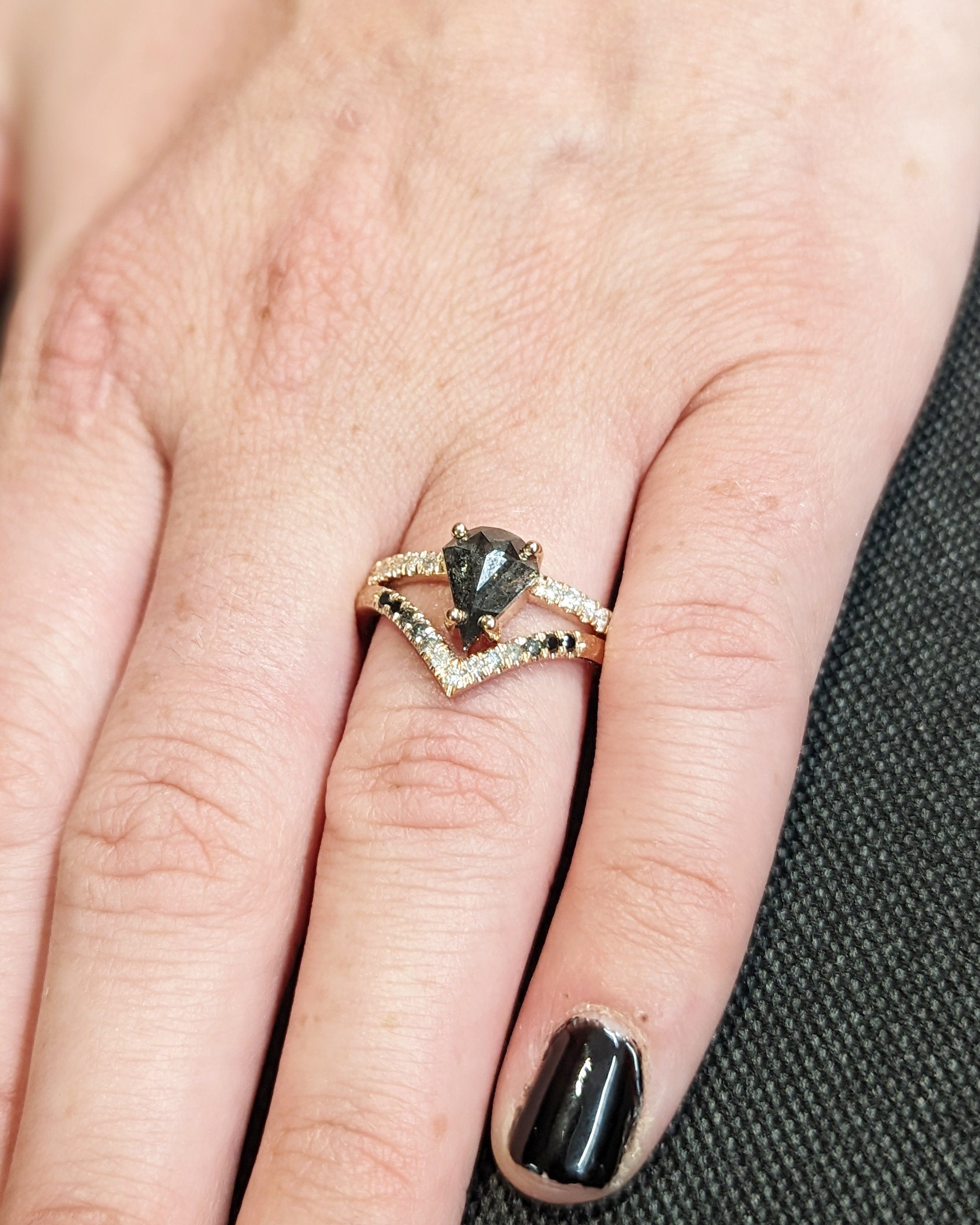 Embark on a journey of love with our Fan Cut Salt and Pepper Diamond Engagement Ring, a symbol of timeless elegance. The 2mm hammered gold band, adorned with moissanites, radiates sophistication, and when paired with our ombre diamond chevron ring, it creates a harmonious melody of style and grace.