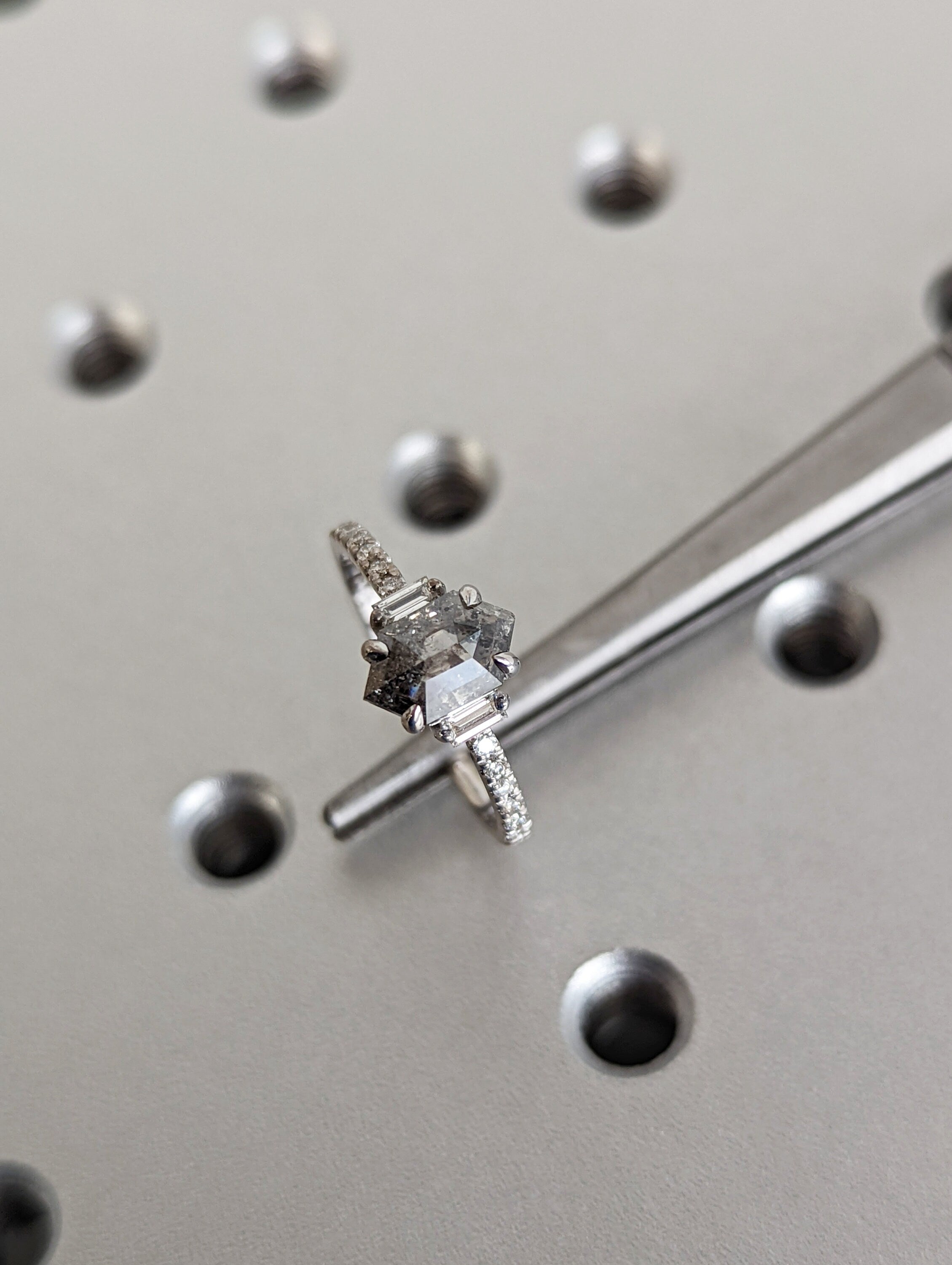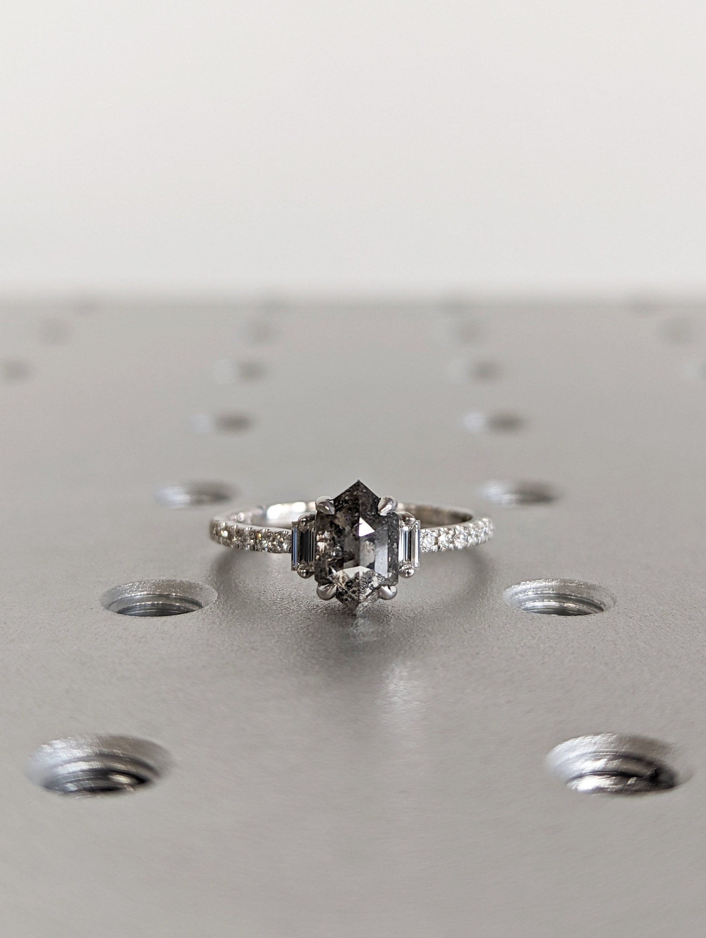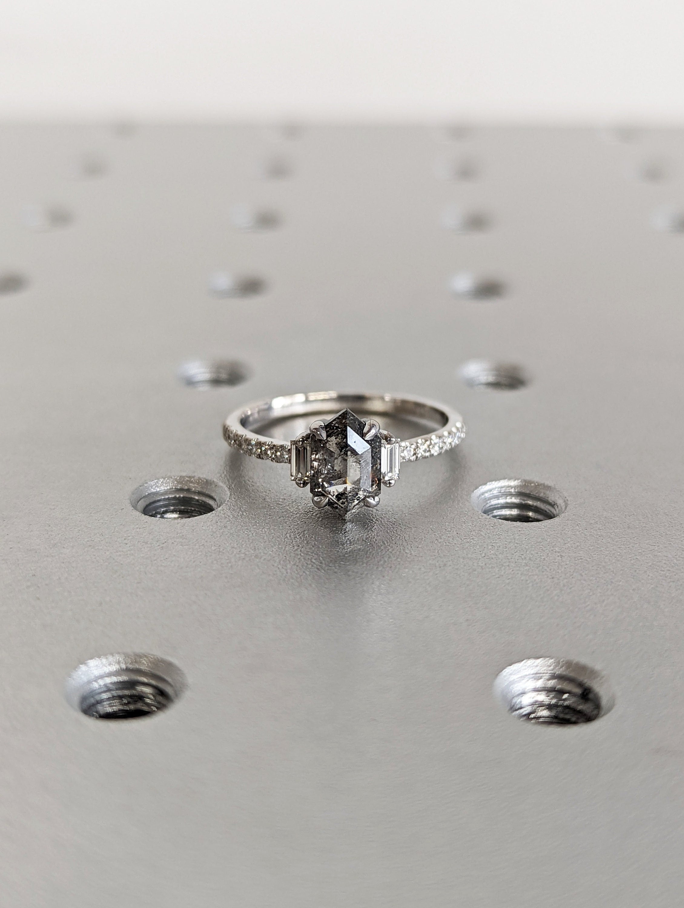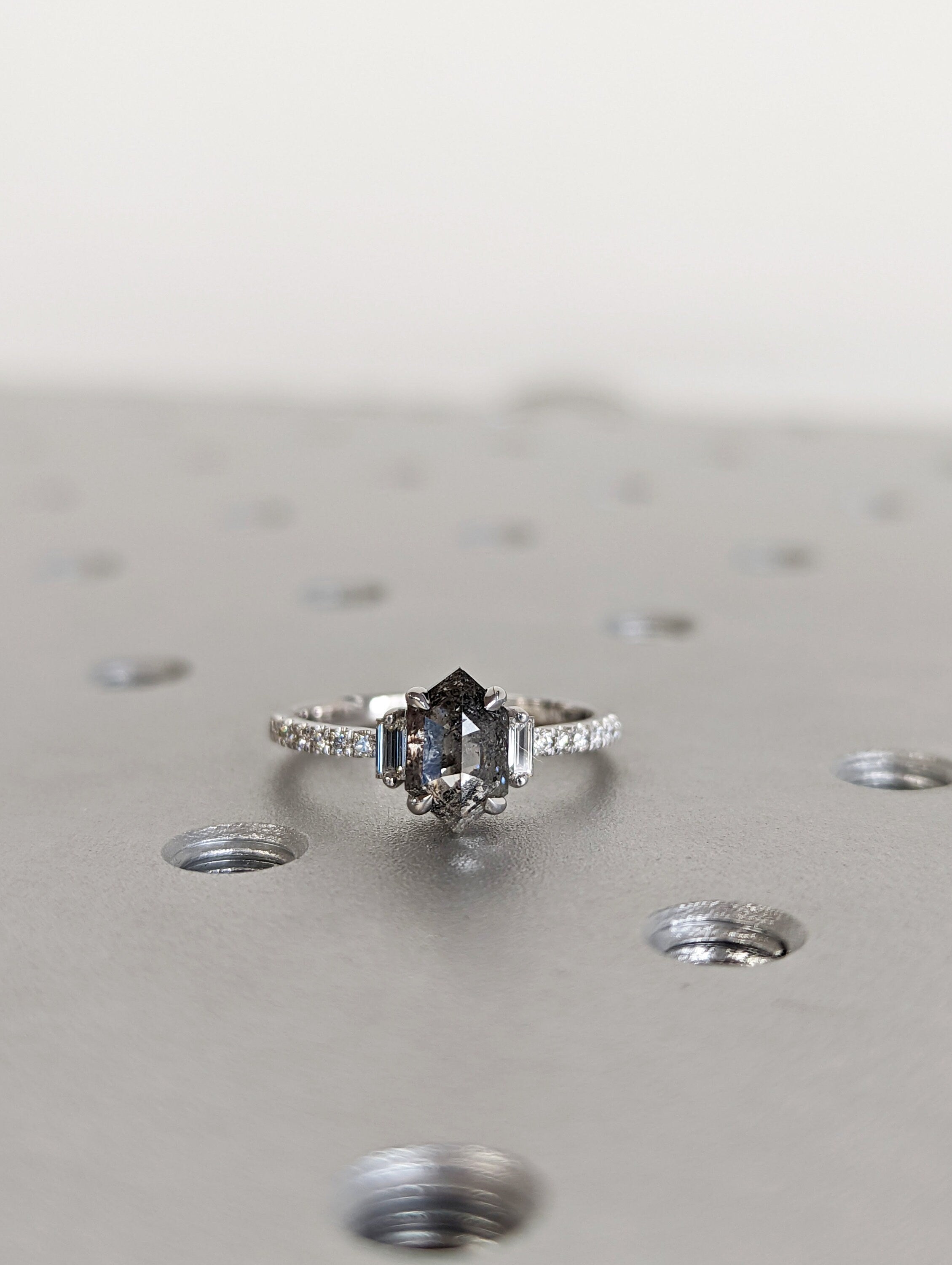 ONE-OF-A-KIND Hexagon salt and pepper diamond, a baguette enhanced diamond ring that is just pure uniqueness, nothing that has ever been seen before.