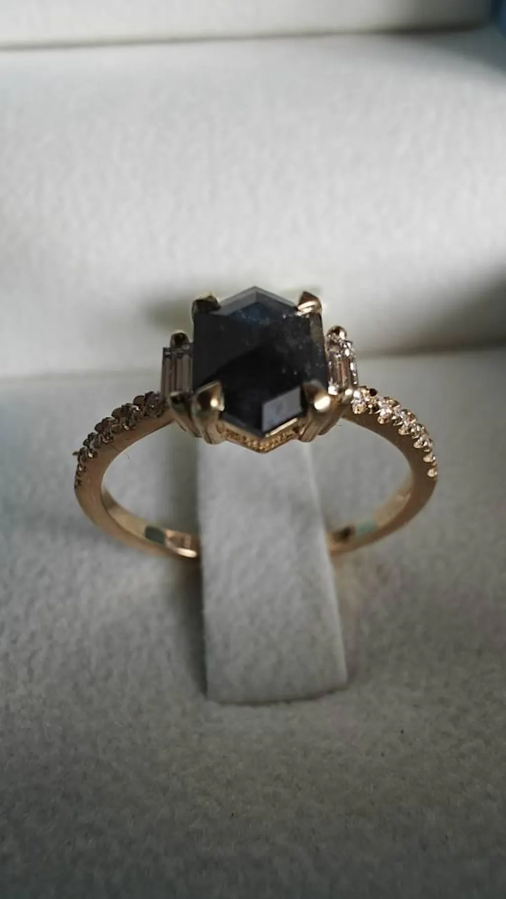 ONE-OF-A-KIND Hexagon salt and pepper diamond, a baguette enhanced diamond ring that is just pure uniqueness, nothing that has ever been seen before.