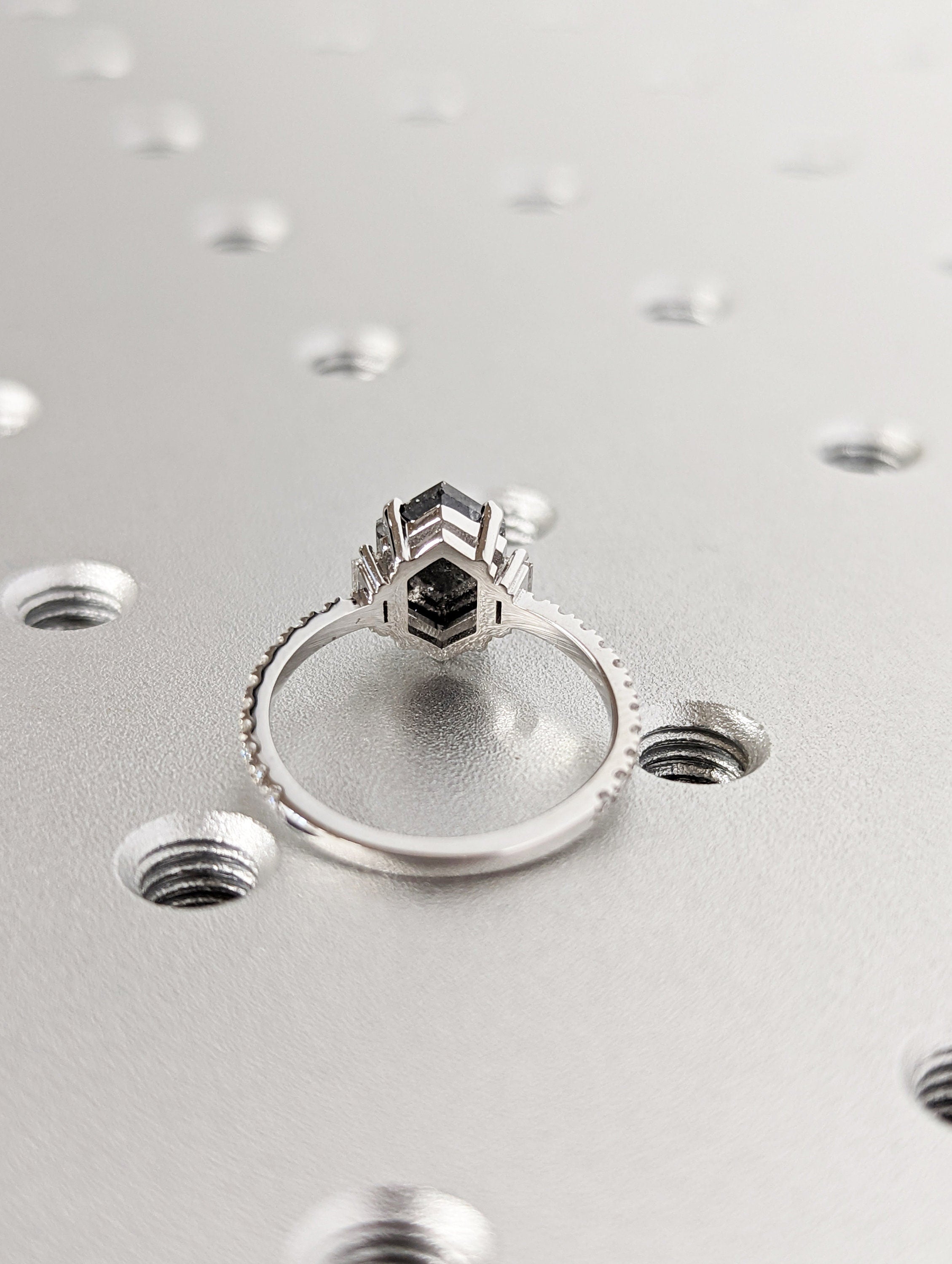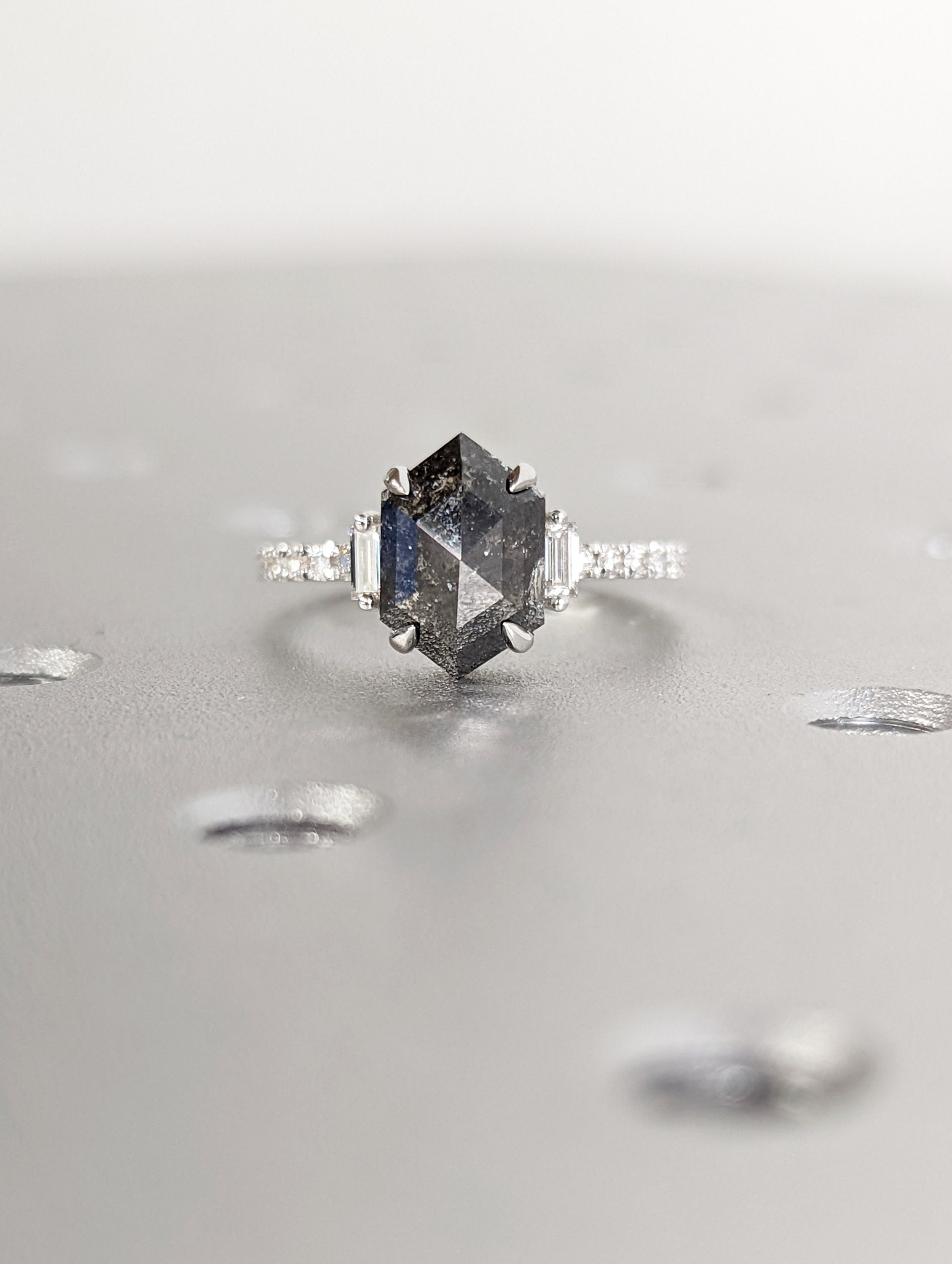 Raw Diamond Hexagon Baguette Diamond, Salt and Pepper, Unique Engagement Ring, Rose Cut Geometric Diamond Ring, 14k Gold, Custom Handmade
