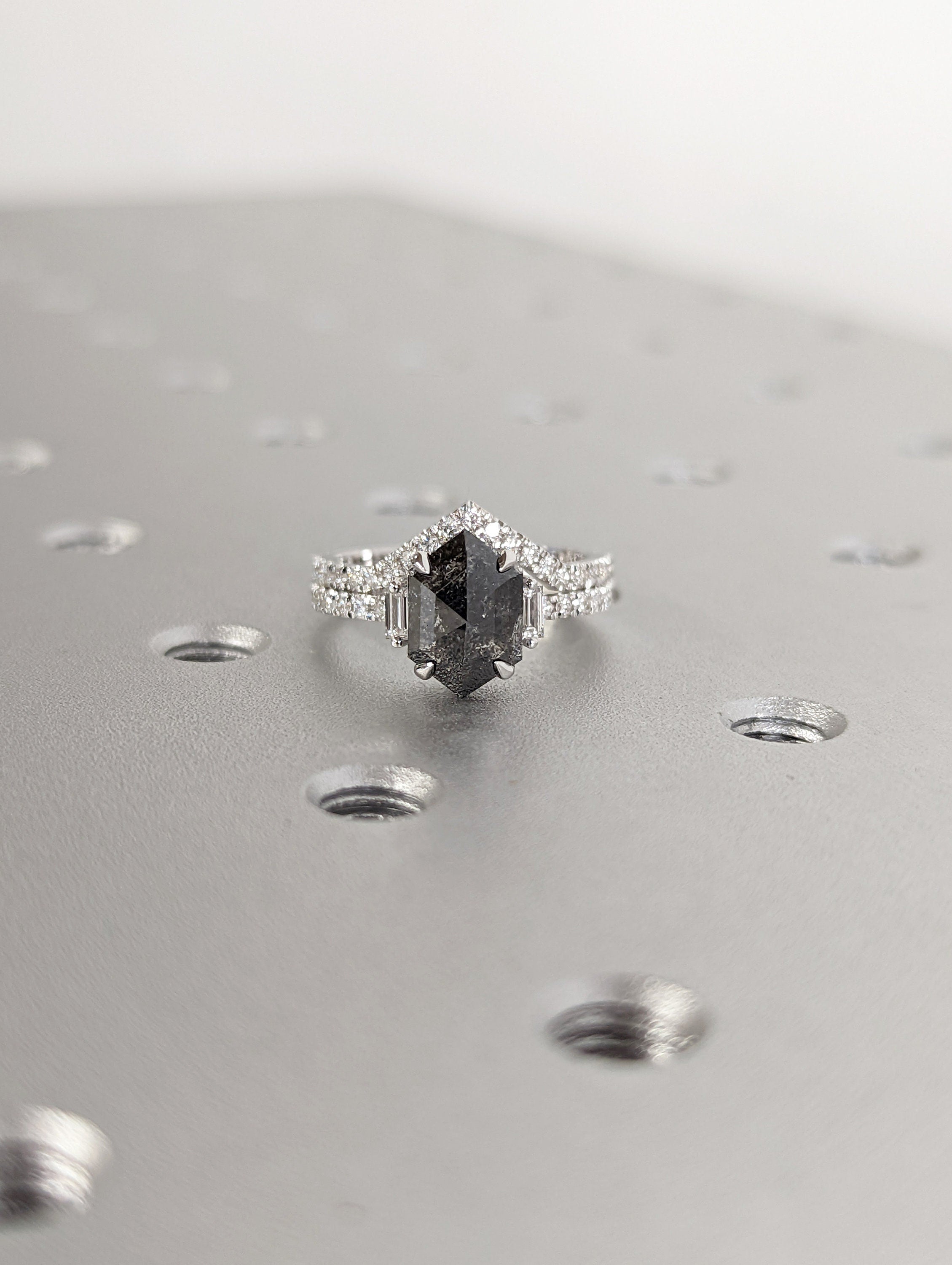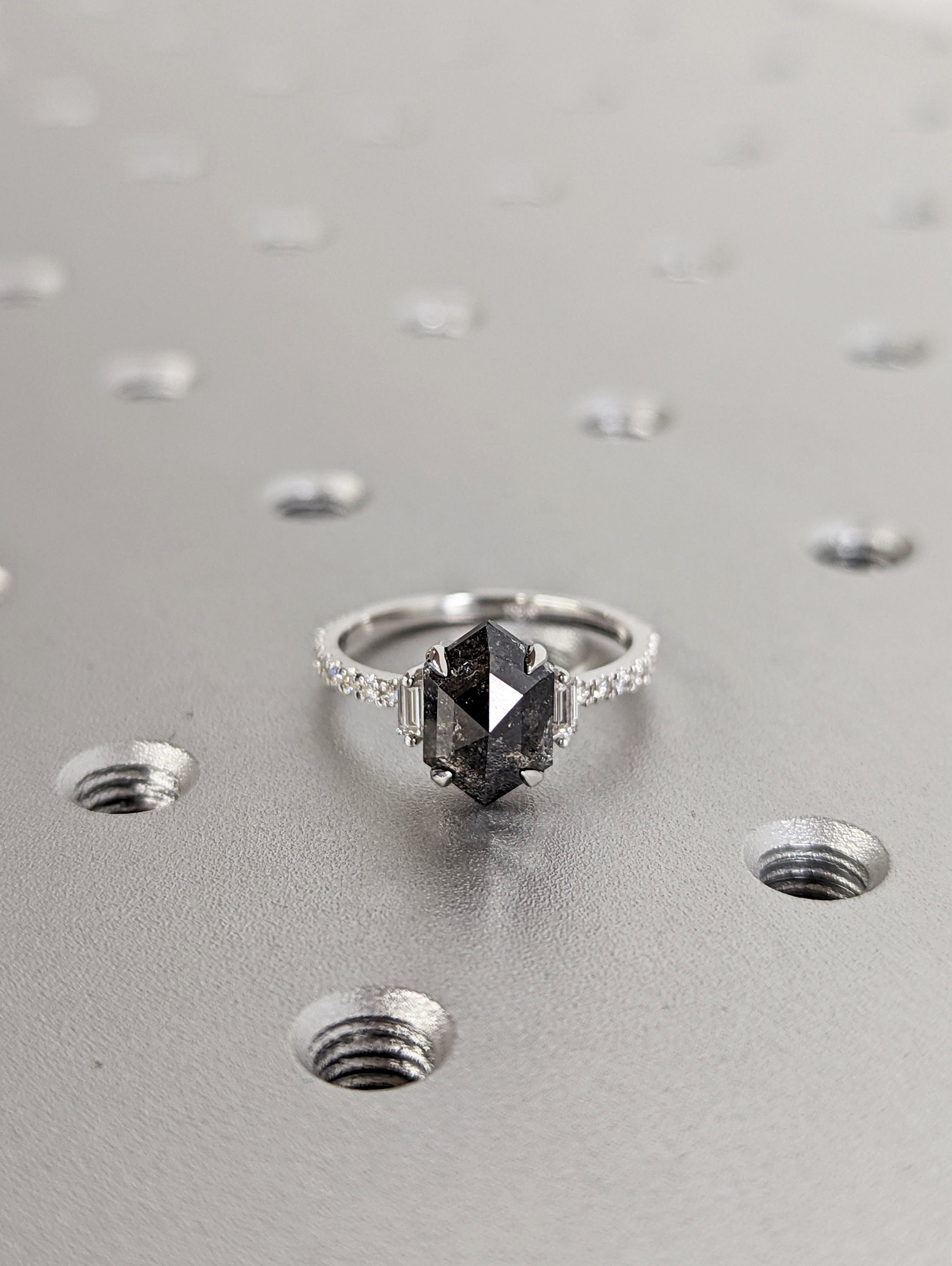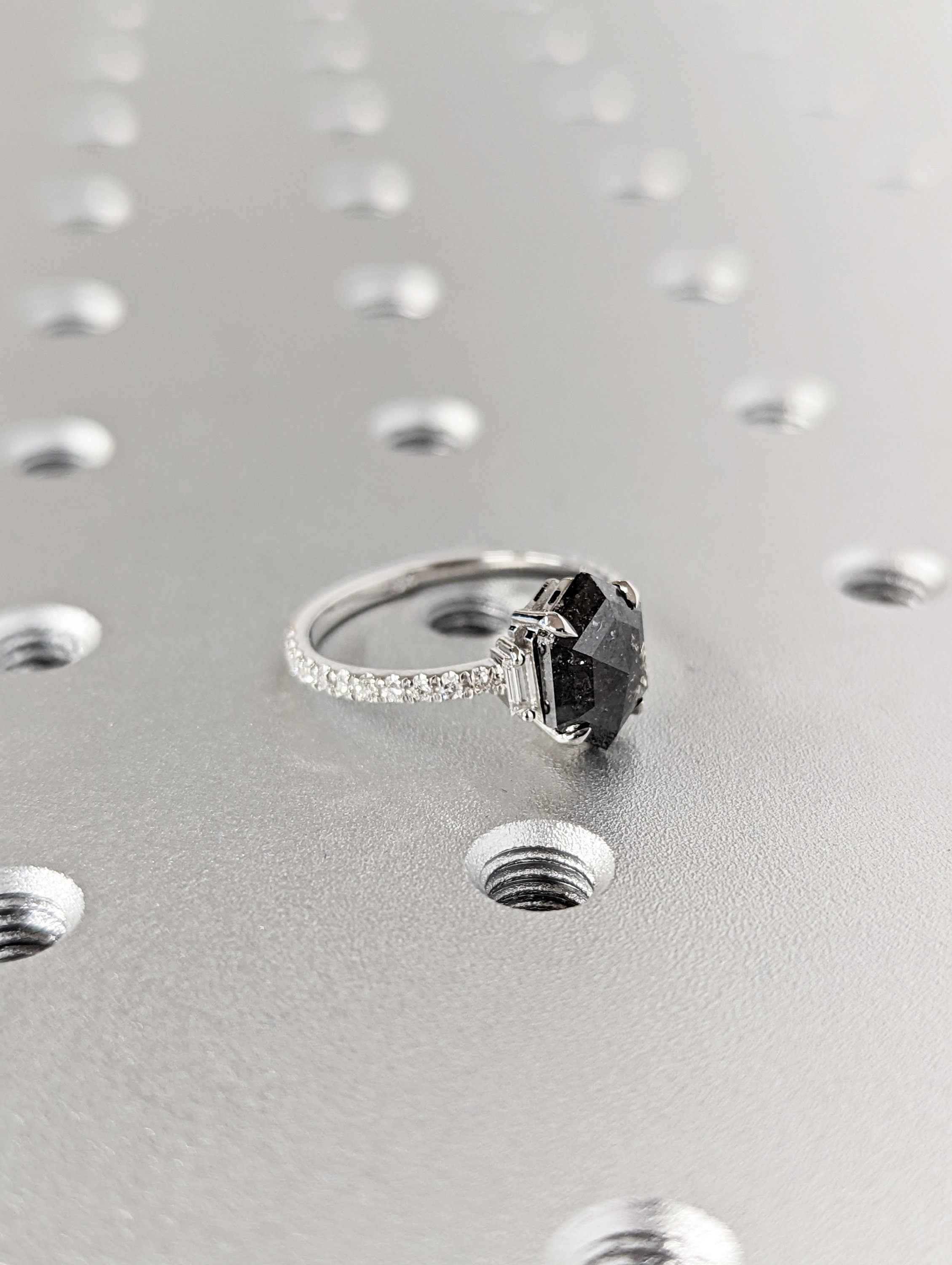 ONE-OF-A-KIND Hexagon salt and pepper diamond, a baguette enhanced diamond ring that is just pure uniqueness, nothing that has ever been seen before.