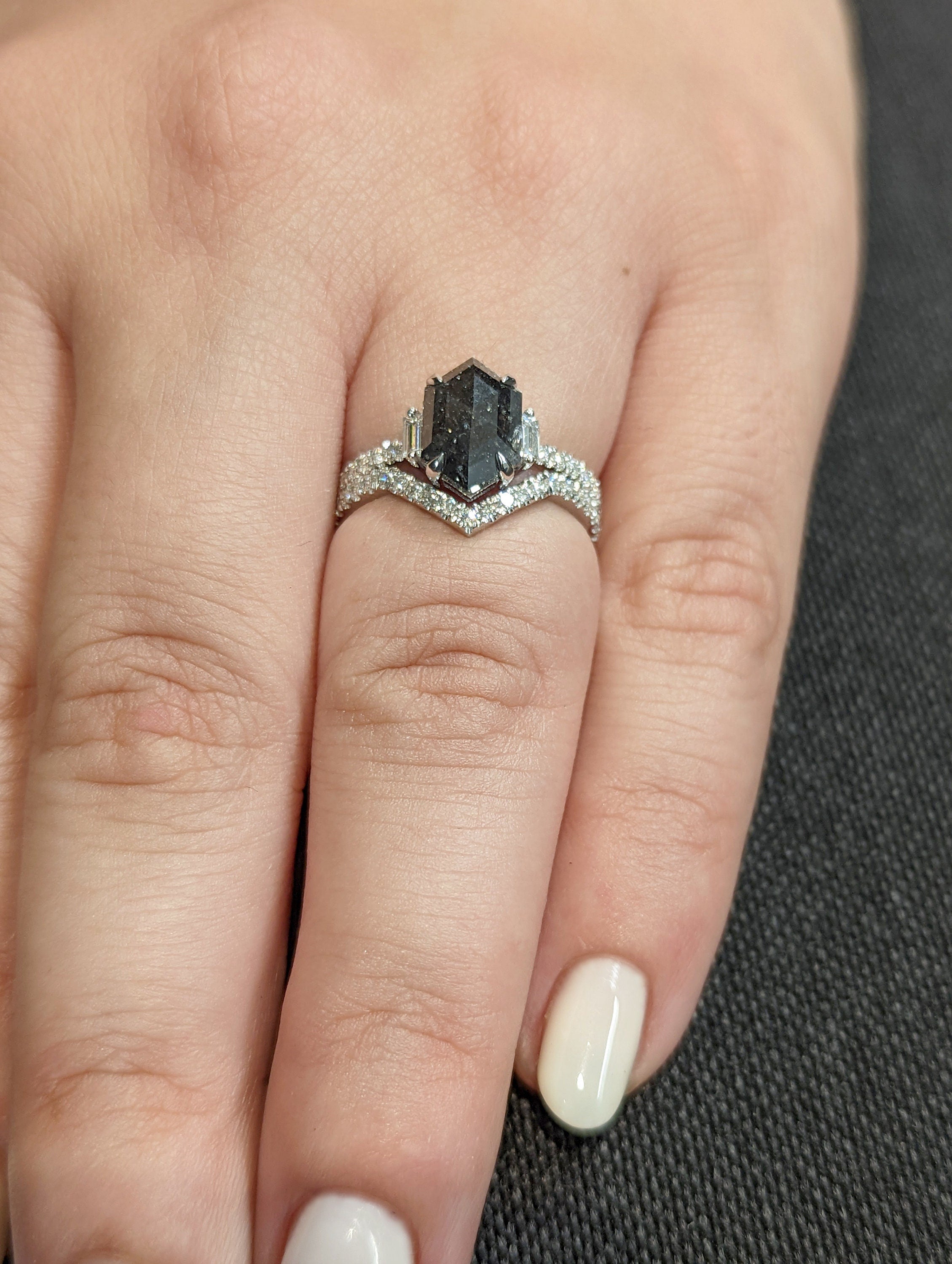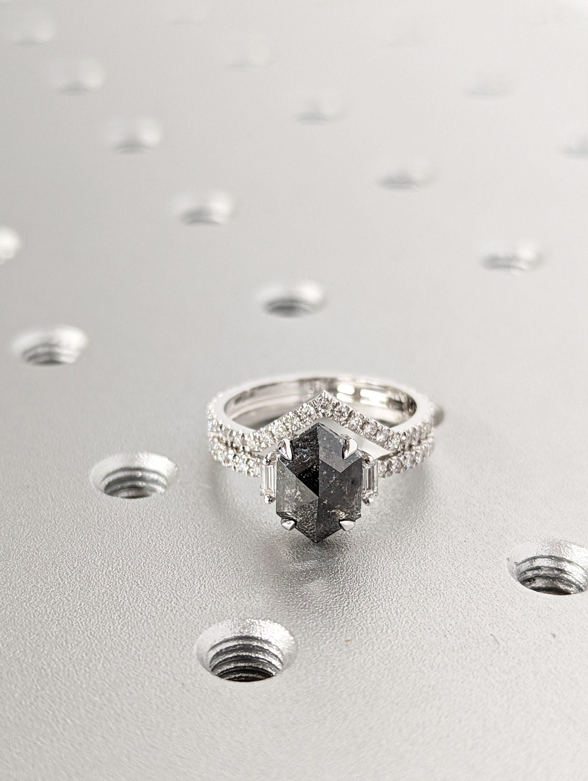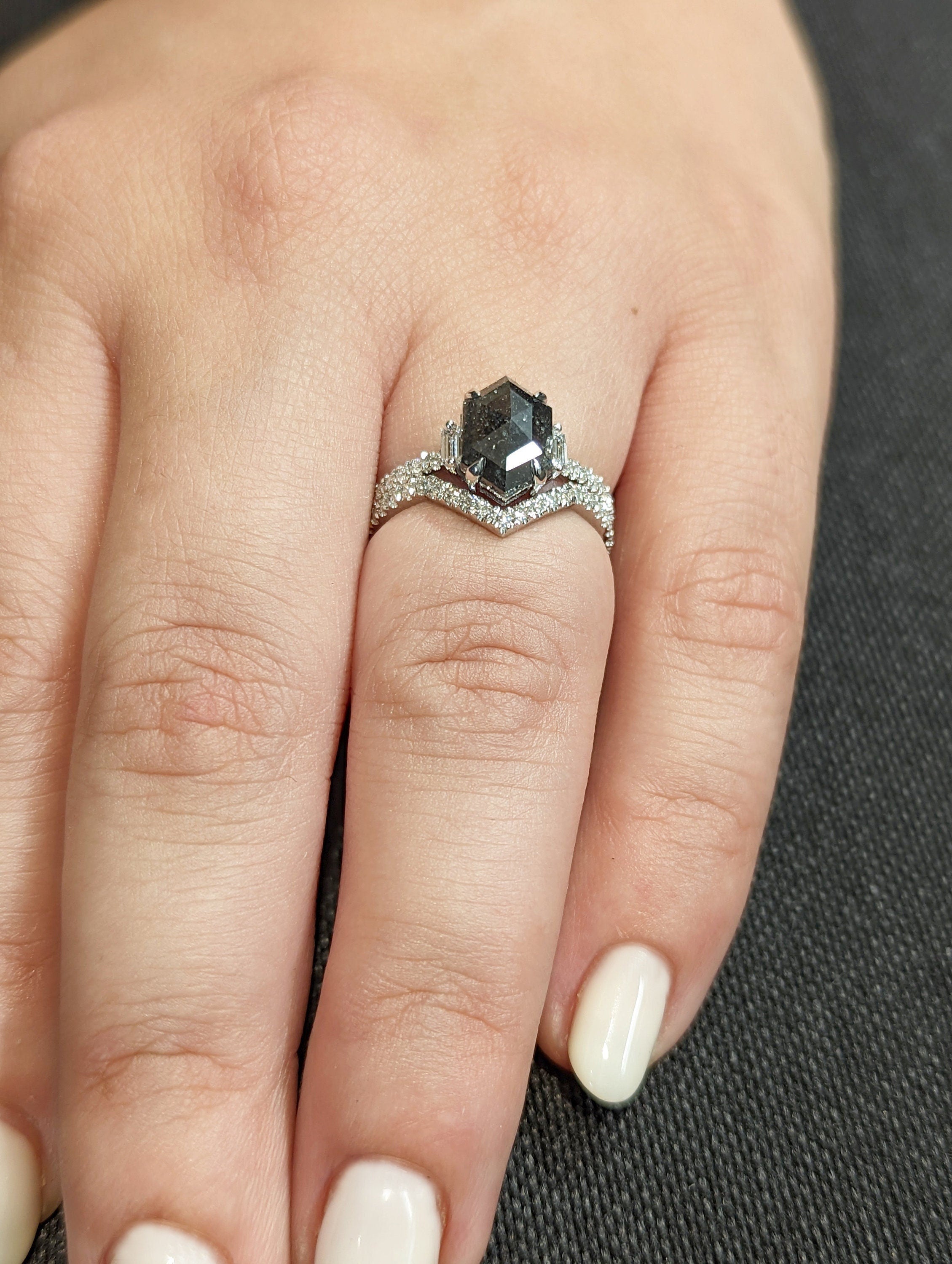 ONE-OF-A-KIND Hexagon salt and pepper diamond, a baguette enhanced diamond ring that is just pure uniqueness, nothing that has ever been seen before.