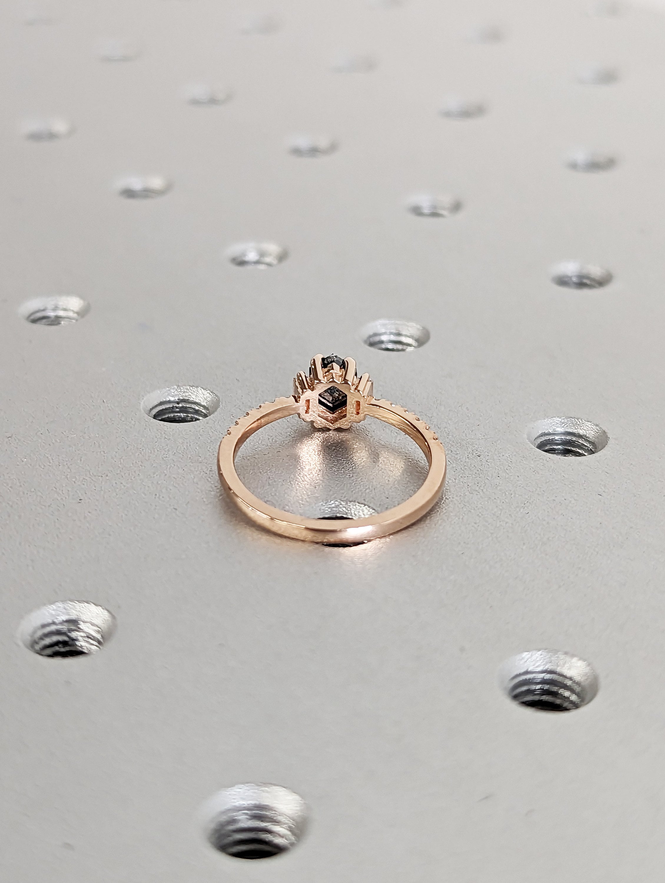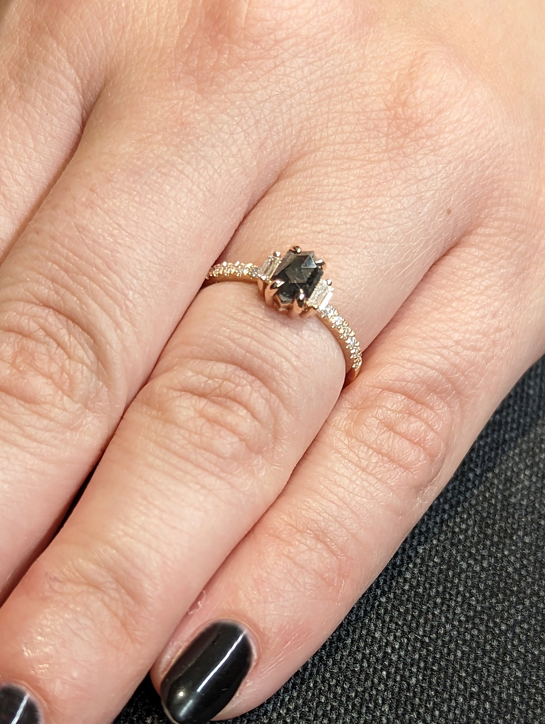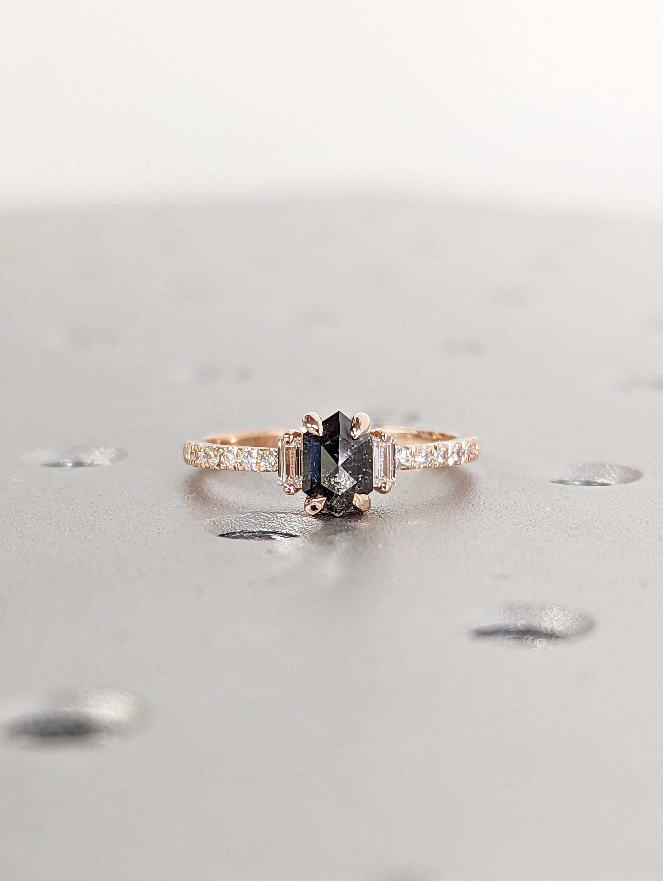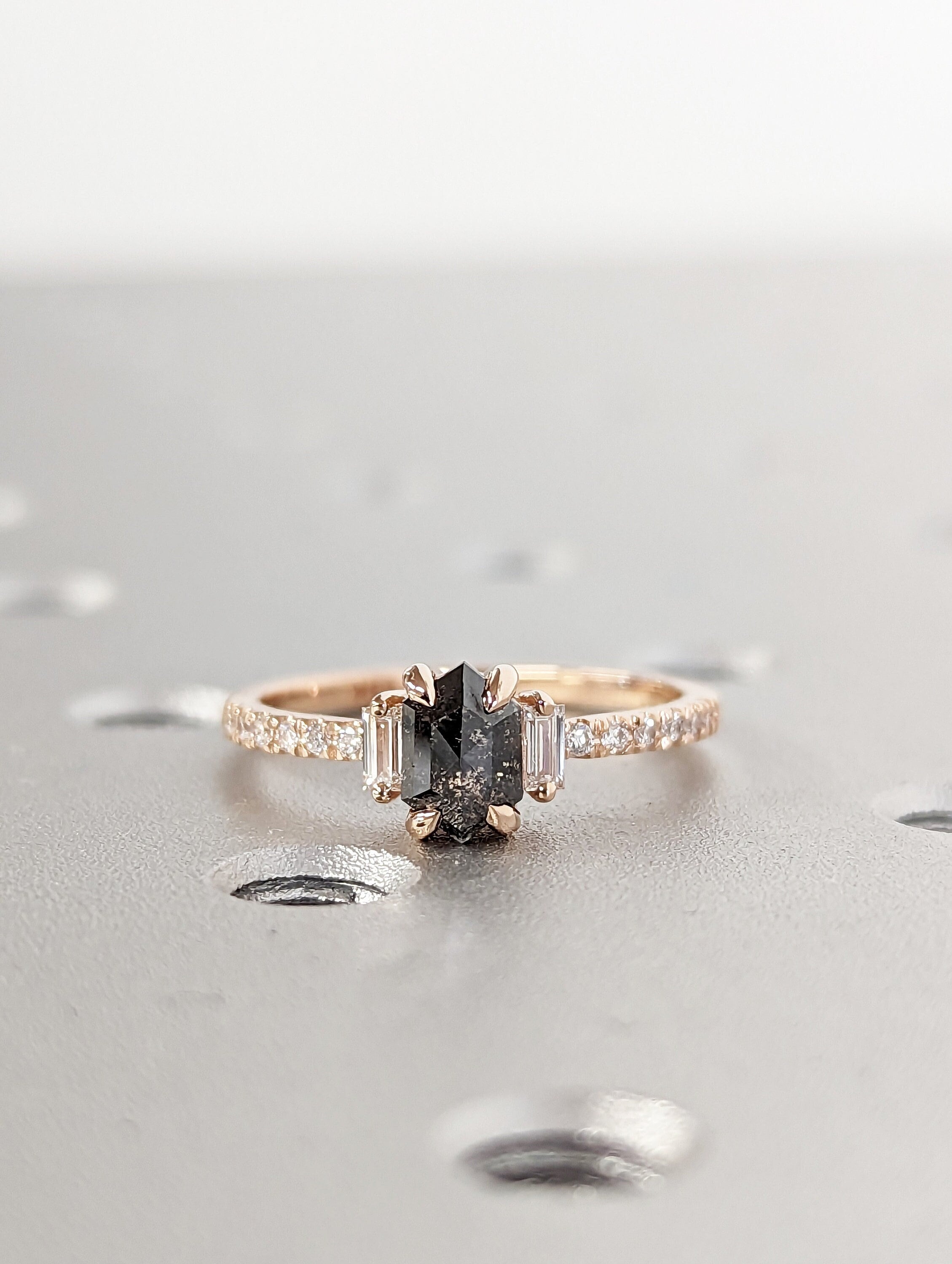 Raw Diamond Hexagon Baguette Diamond, Salt and Pepper, Unique Engagement Ring, Rose Cut Geometric Diamond Ring, 14k Gold, Custom Handmade