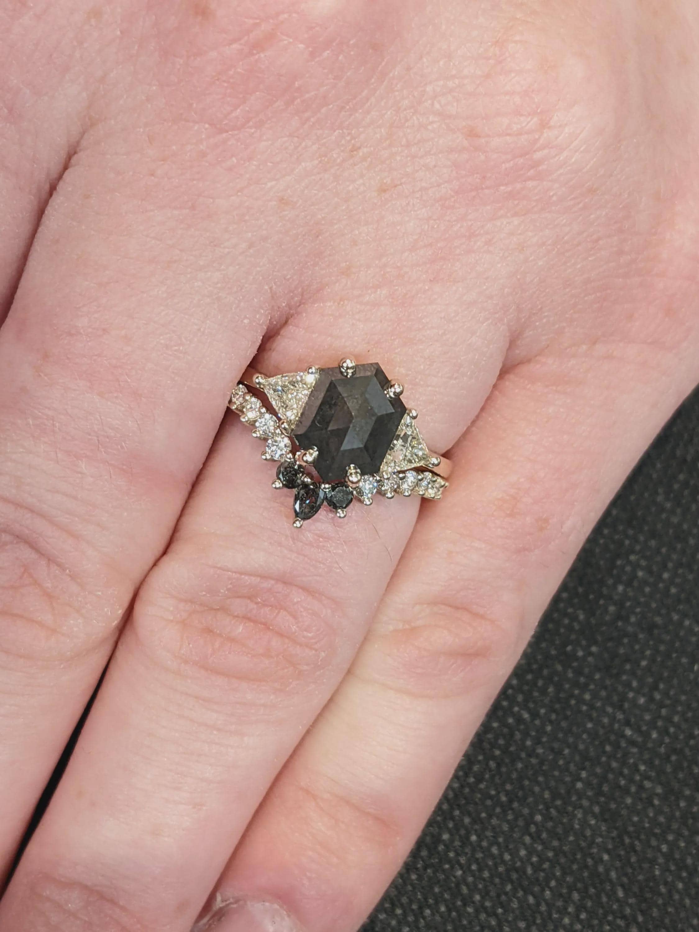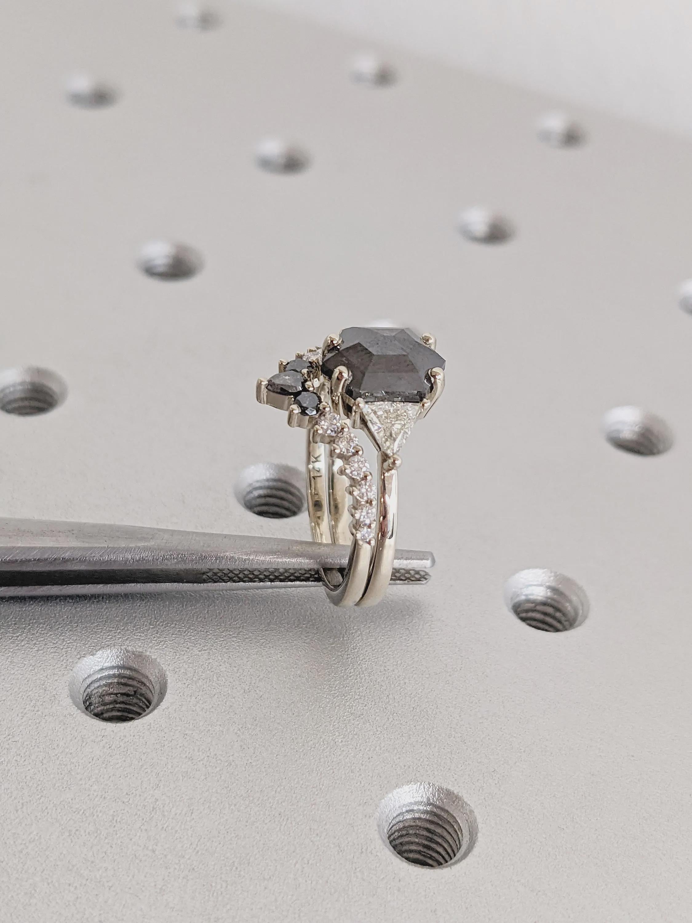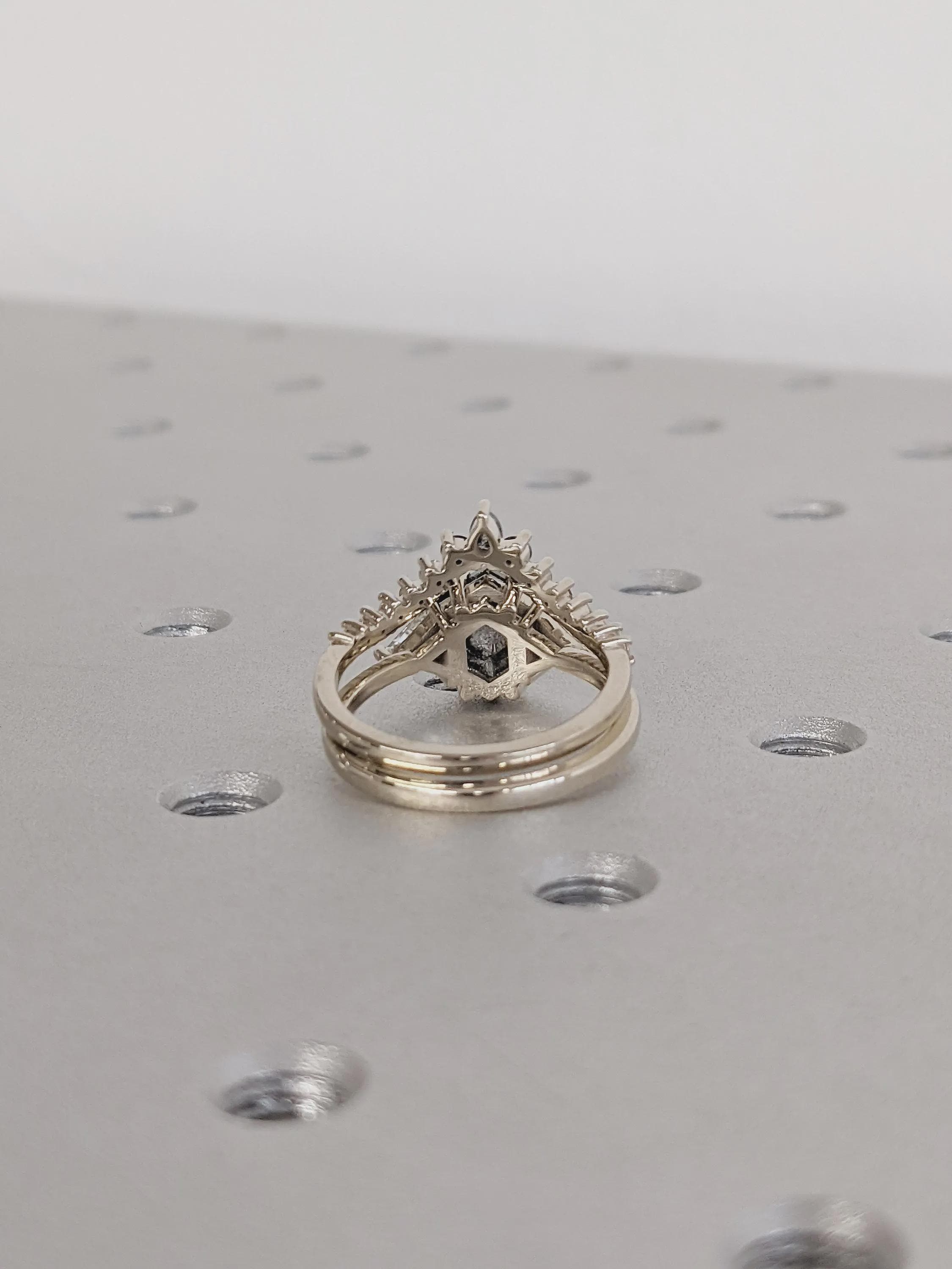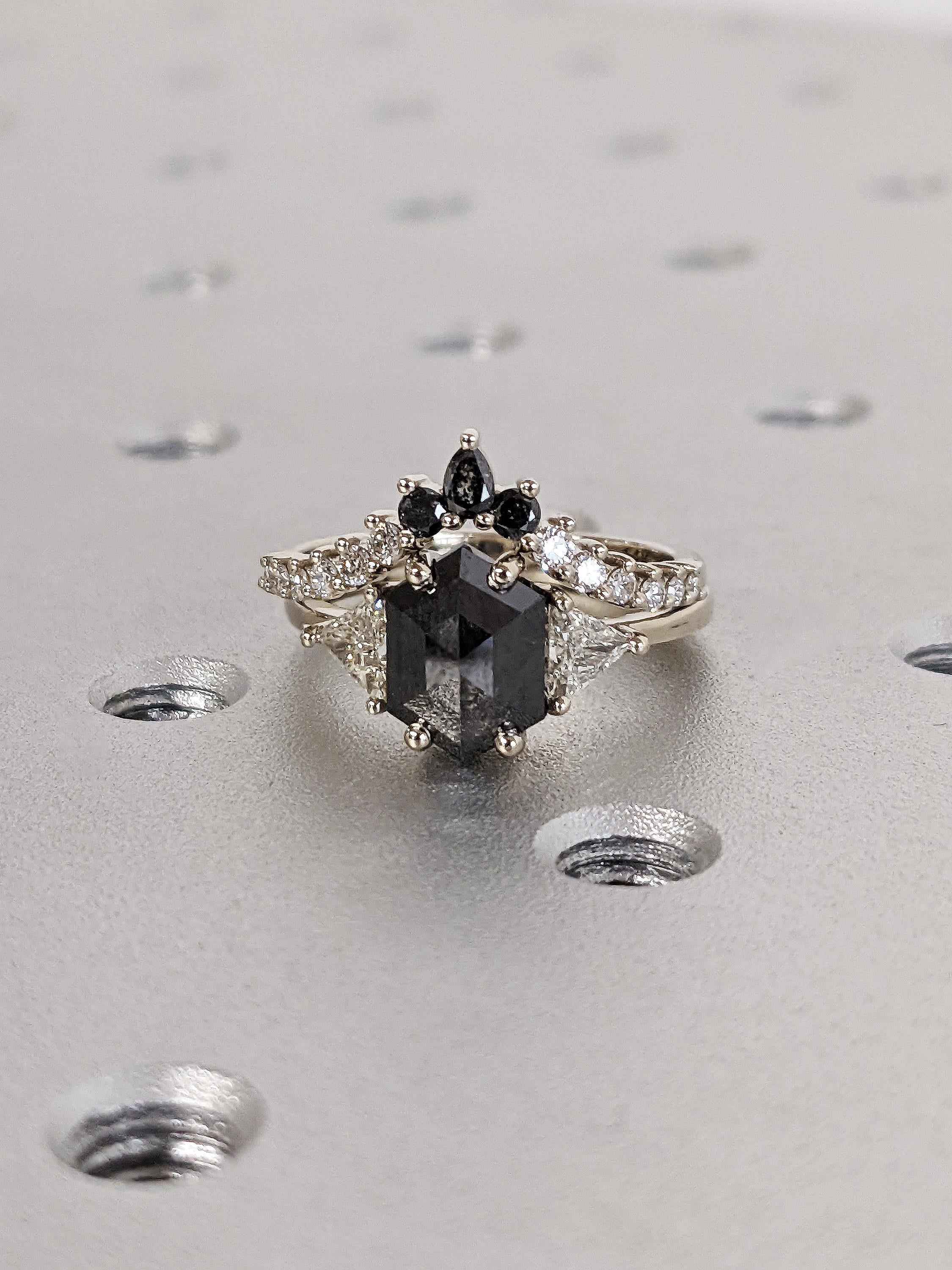 A striking hexagon cut Salt and Pepper diamond defines this modern bridal set, its natural inclusions giving each piece a one-of-a-kind character. Designed with a geometric silhouette and stackable style, this ring set offers a perfect balance of elegance and individuality for any special occasion.