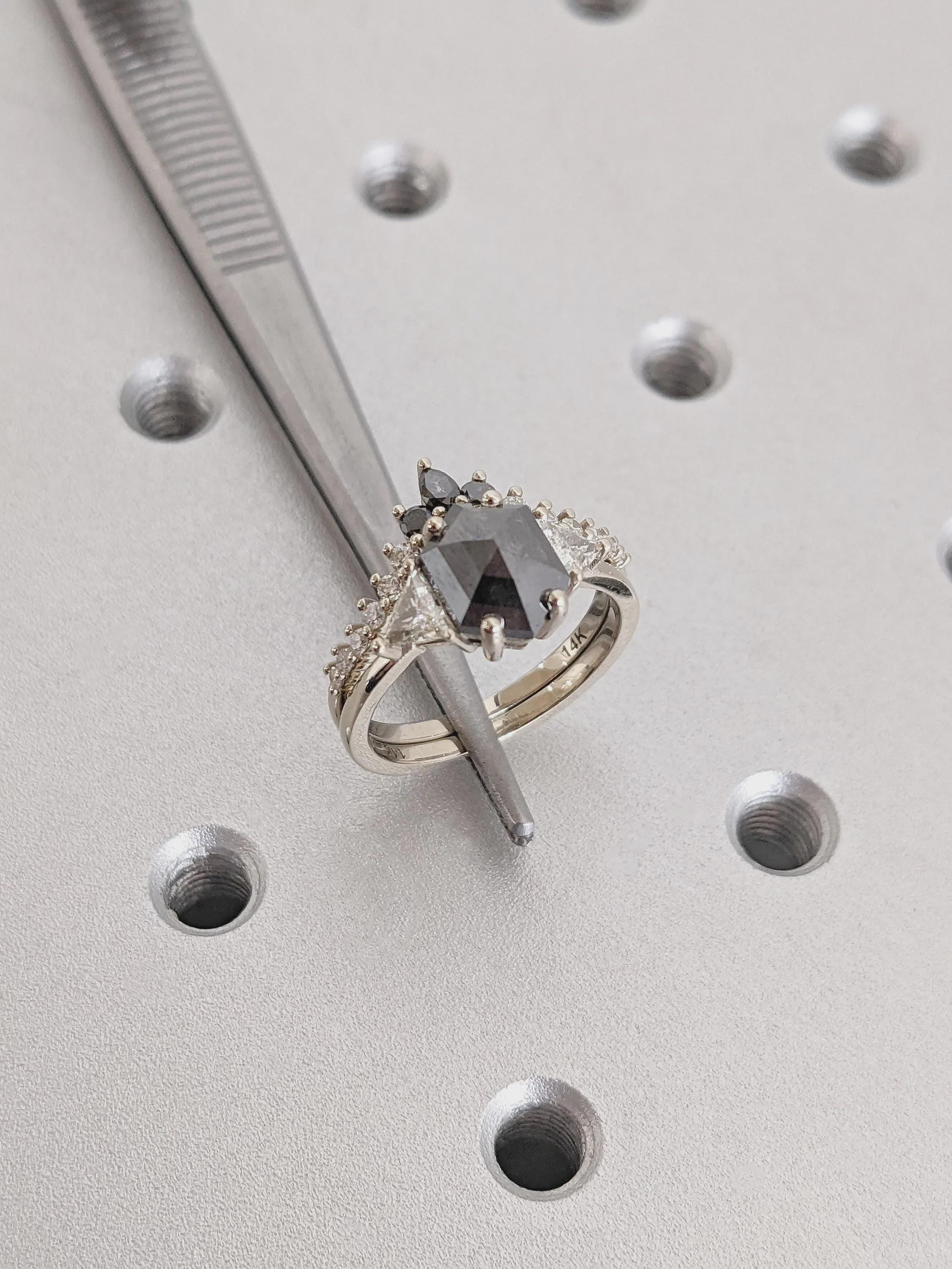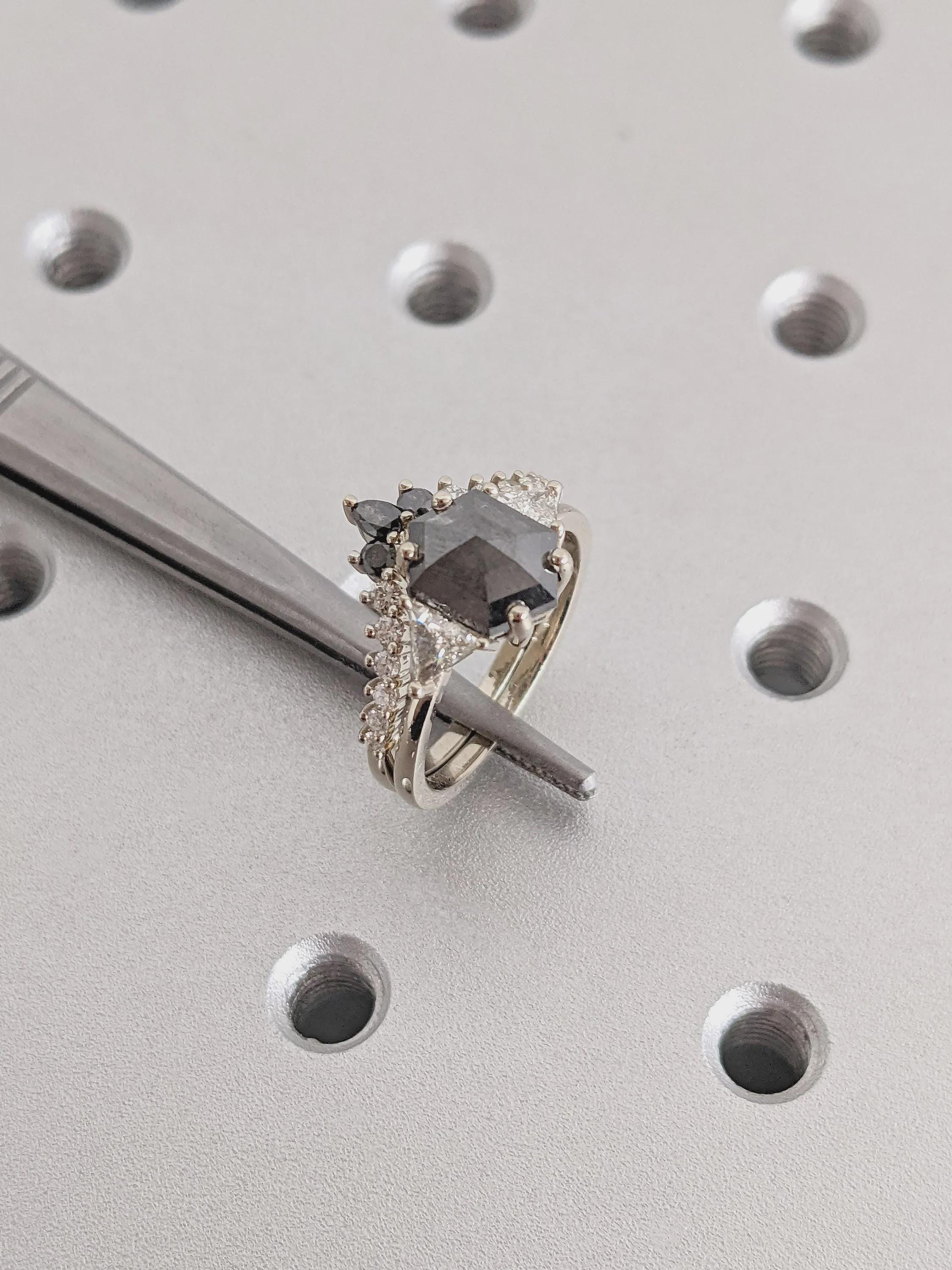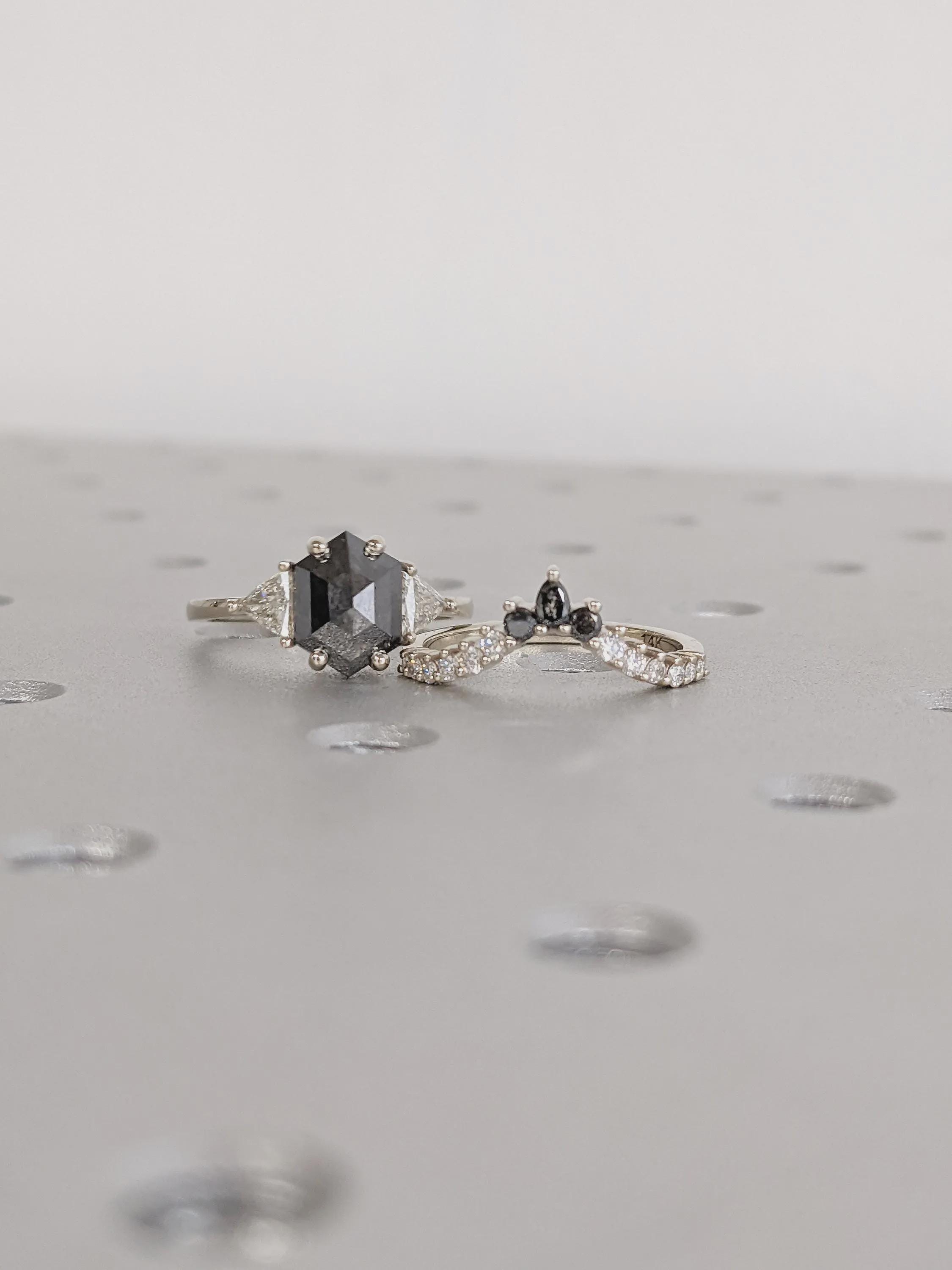Raw Diamond Hexagon Cut Salt & Pepper Diamond Bridal Engagement Ring, 14K White Gold Geometric Ring Set, Custom Galaxy Diamond Stacking Ring