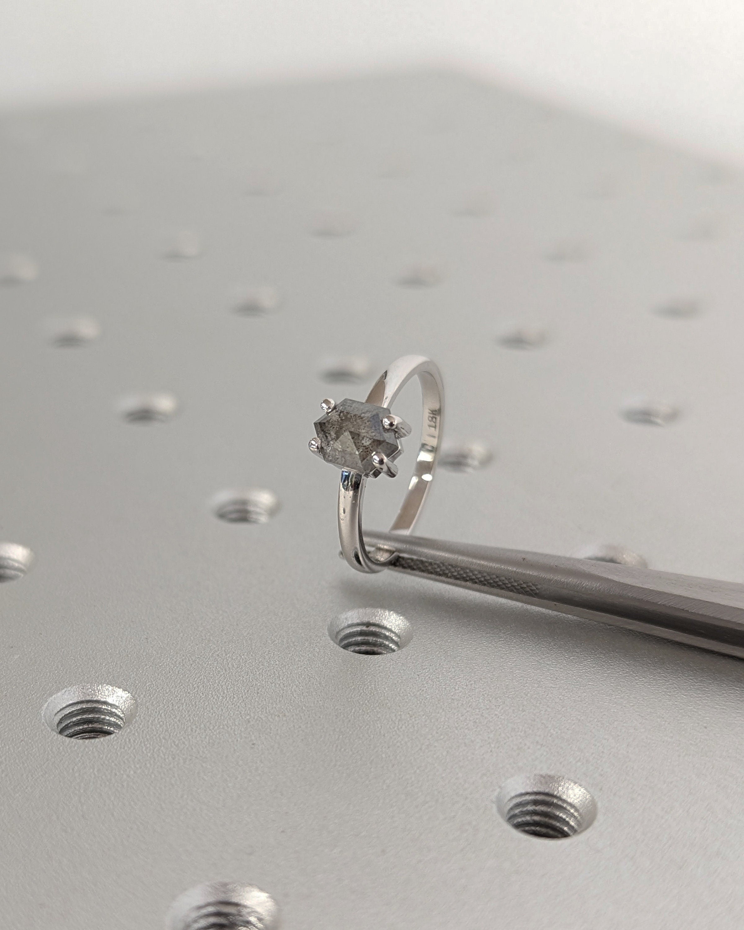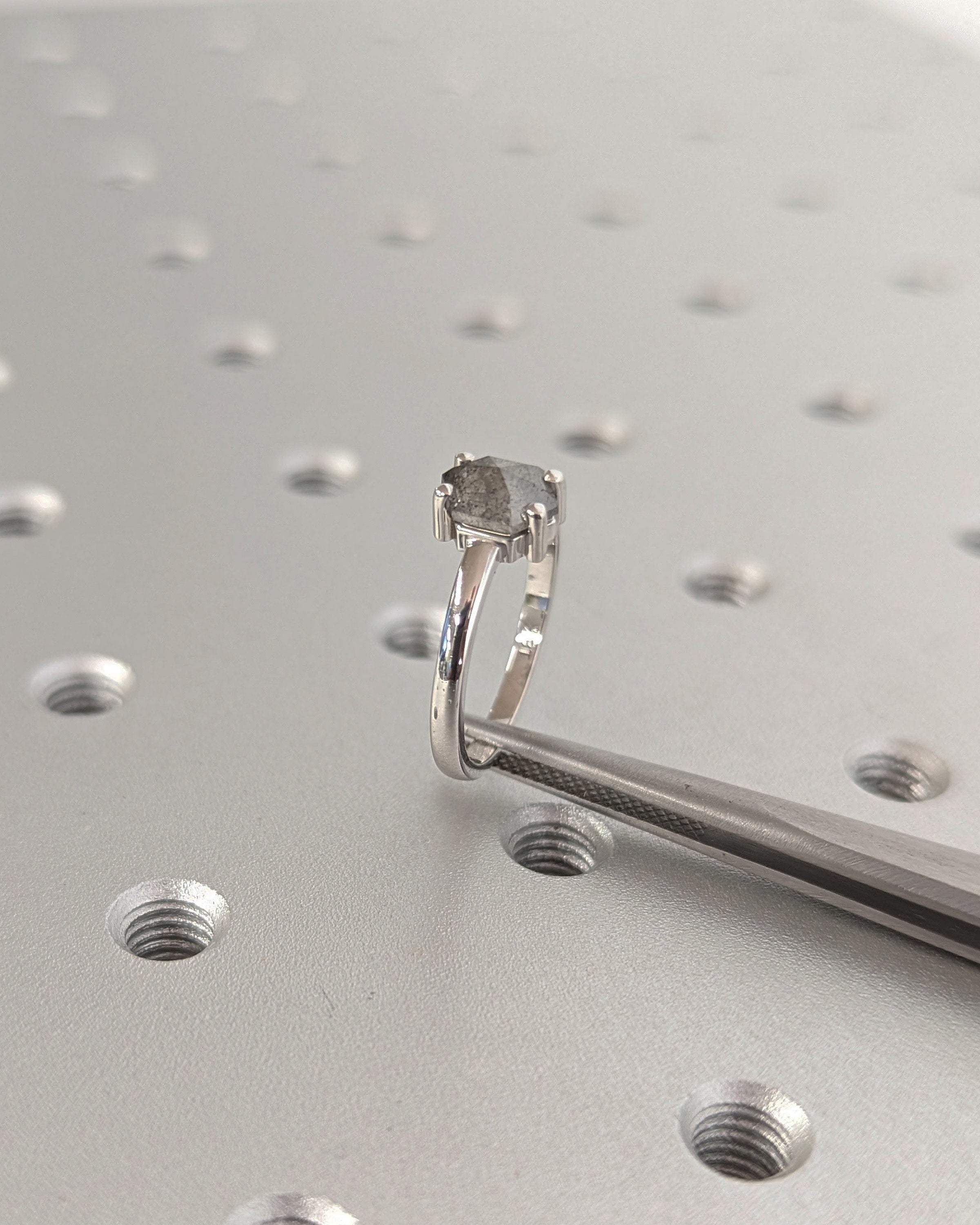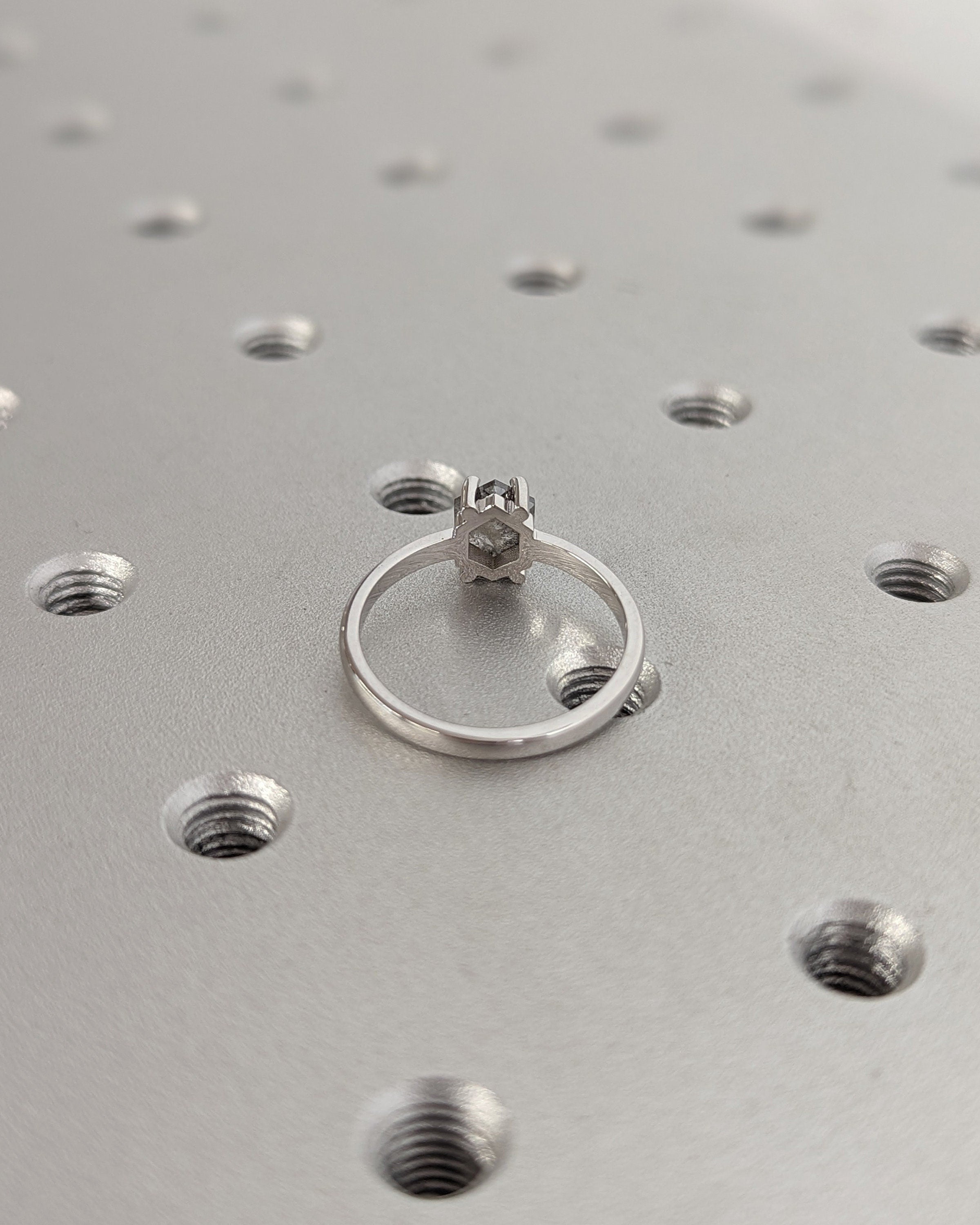 Redefine classic beauty with our geometric solitaire engagement ring, featuring a hexagon-cut salt and pepper diamond for a contemporary twist. The slender 2mm gold band enhances the ring's elegance, making it a timeless and personal expression of your love.