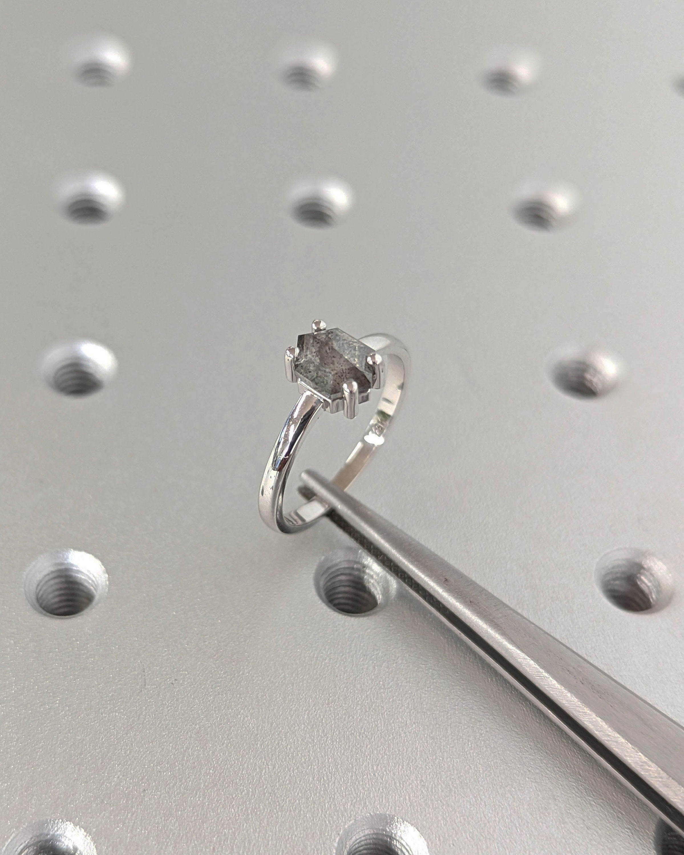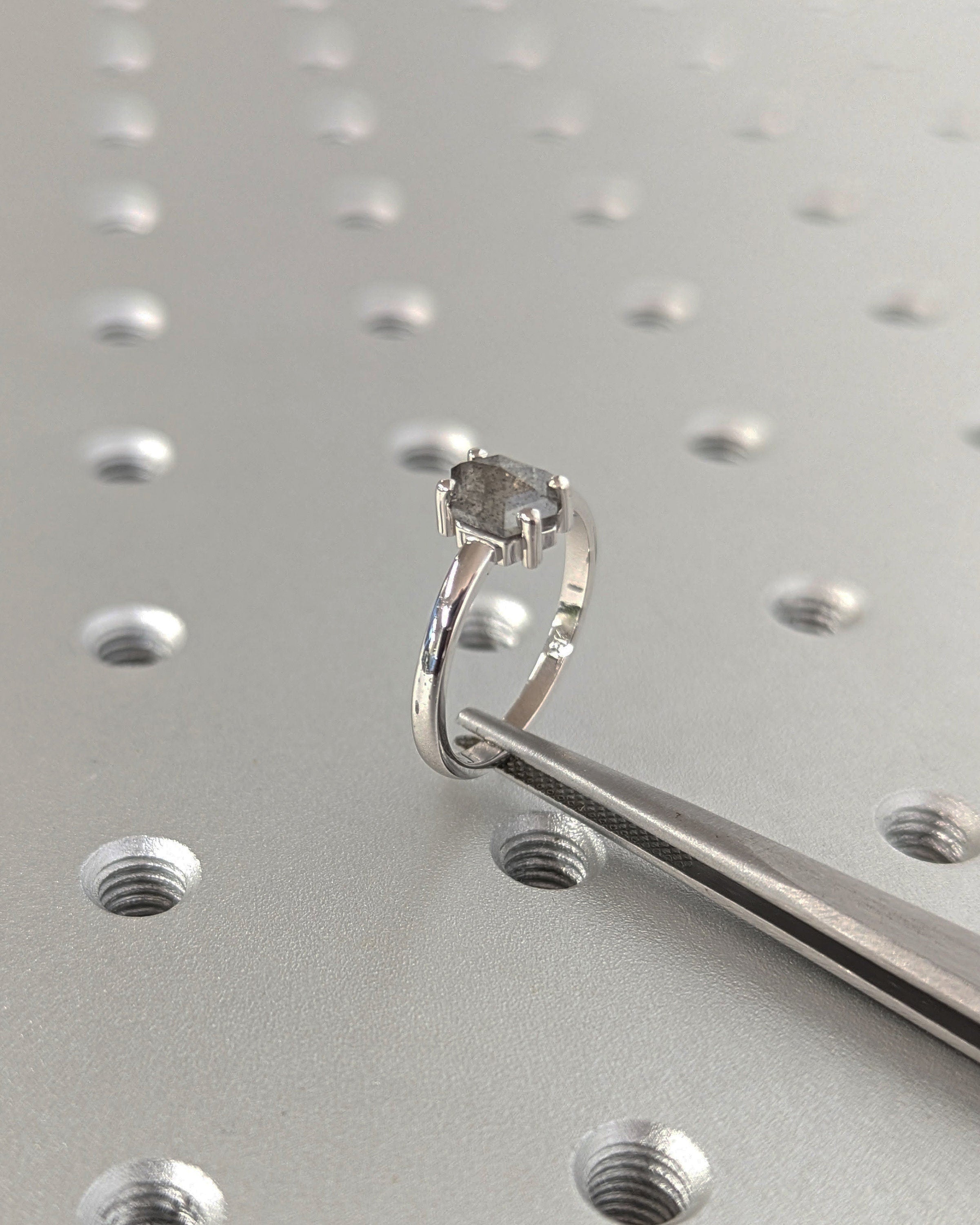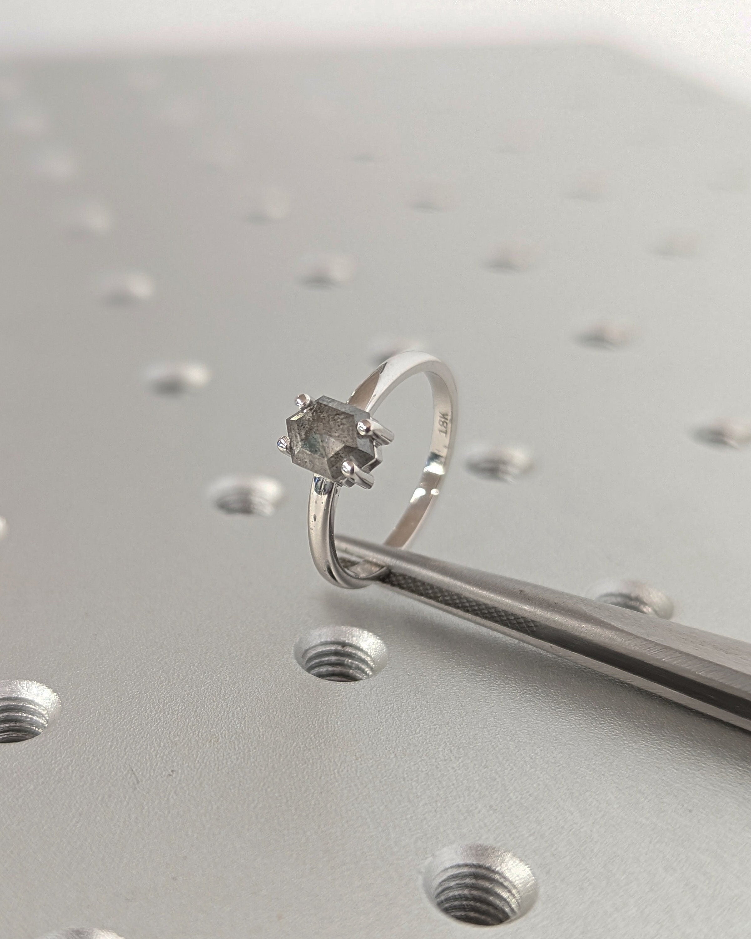 Redefine classic beauty with our geometric solitaire engagement ring, featuring a hexagon-cut salt and pepper diamond for a contemporary twist. The slender 2mm gold band enhances the ring's elegance, making it a timeless and personal expression of your love.