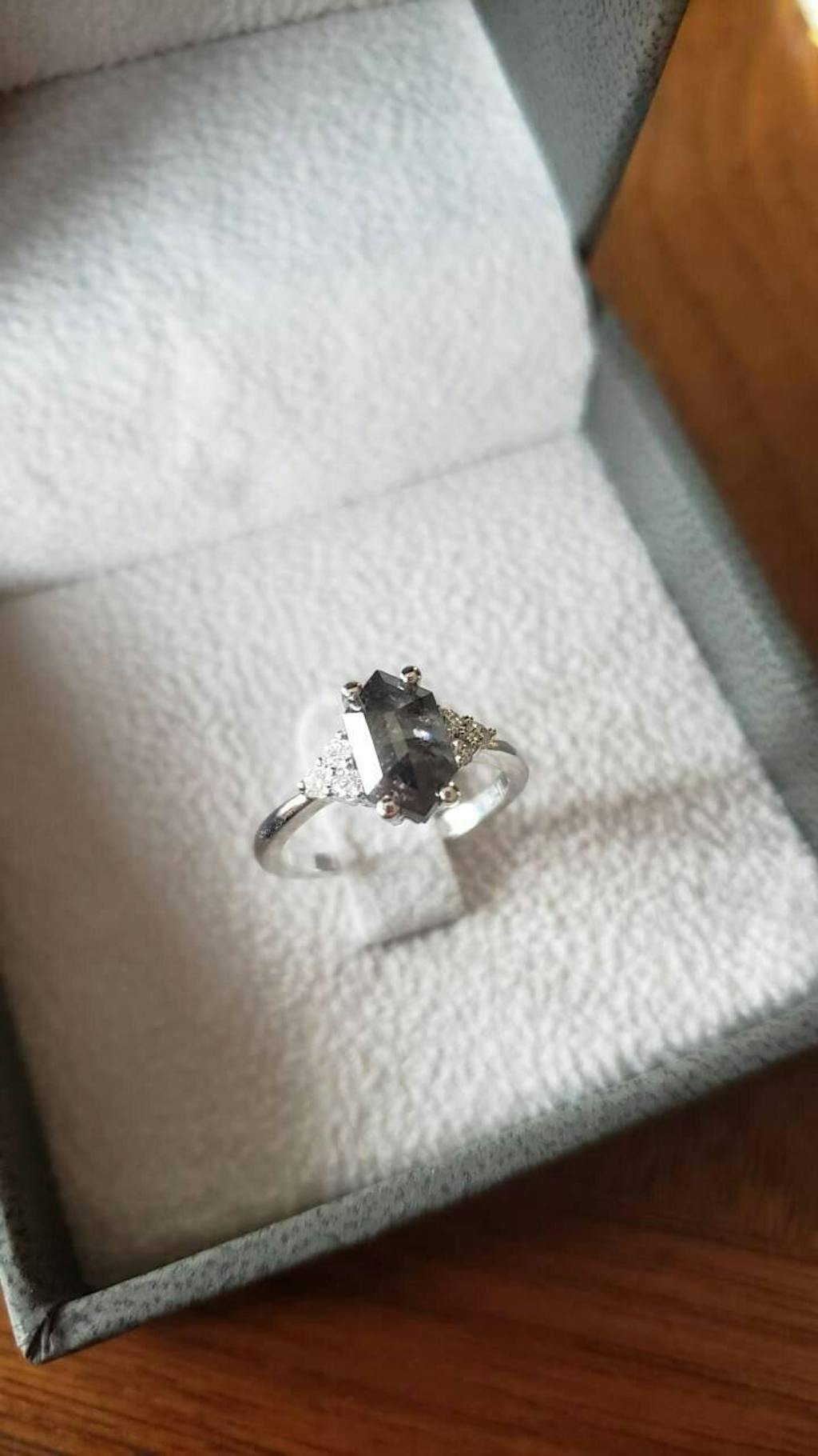 Raw Diamond Hexagon Round Diamond, Salt and Pepper, Unique Engagement Ring, Rose Cut Geometric Diamond Ring, 14k Gold, Custom Handmade