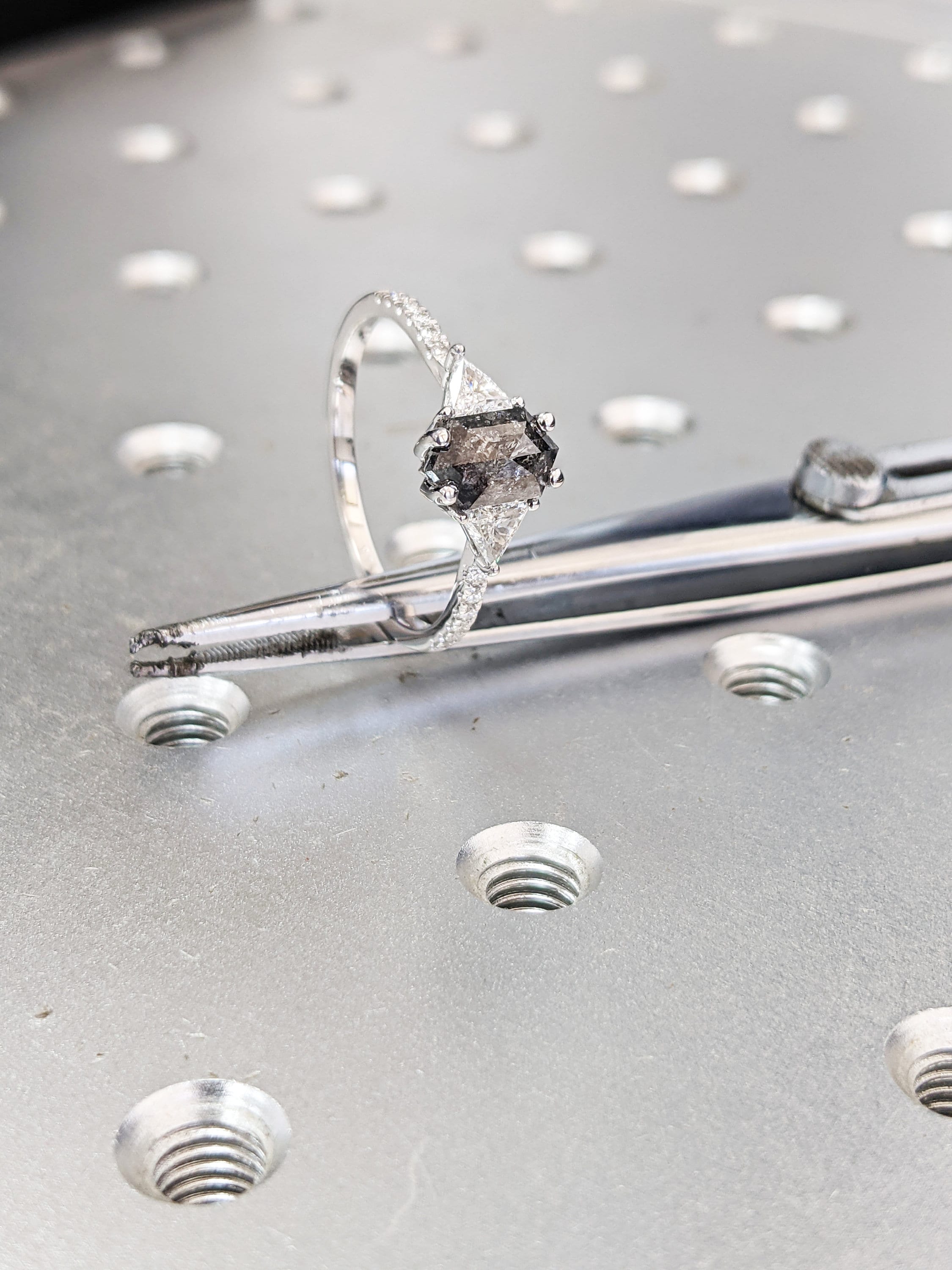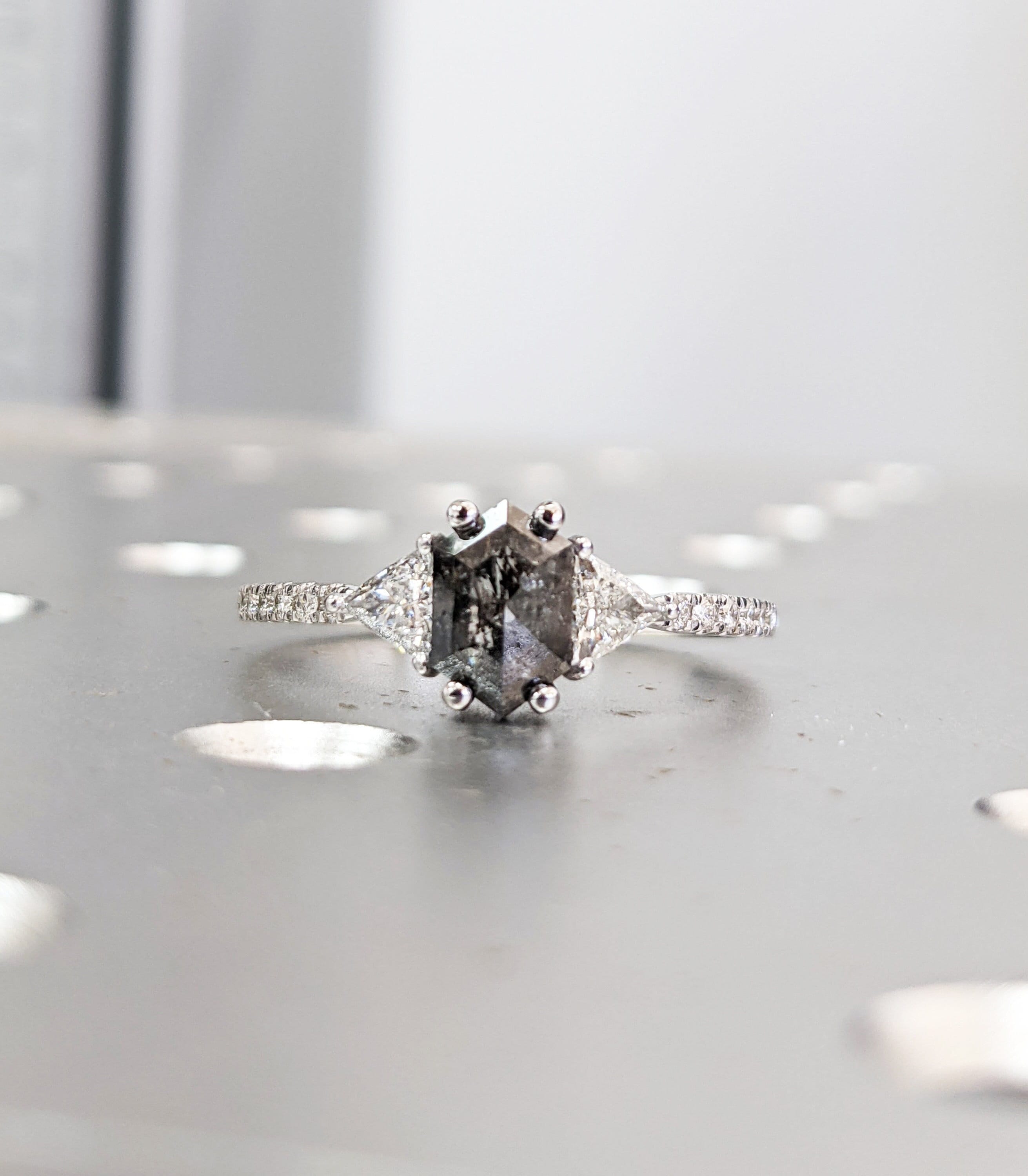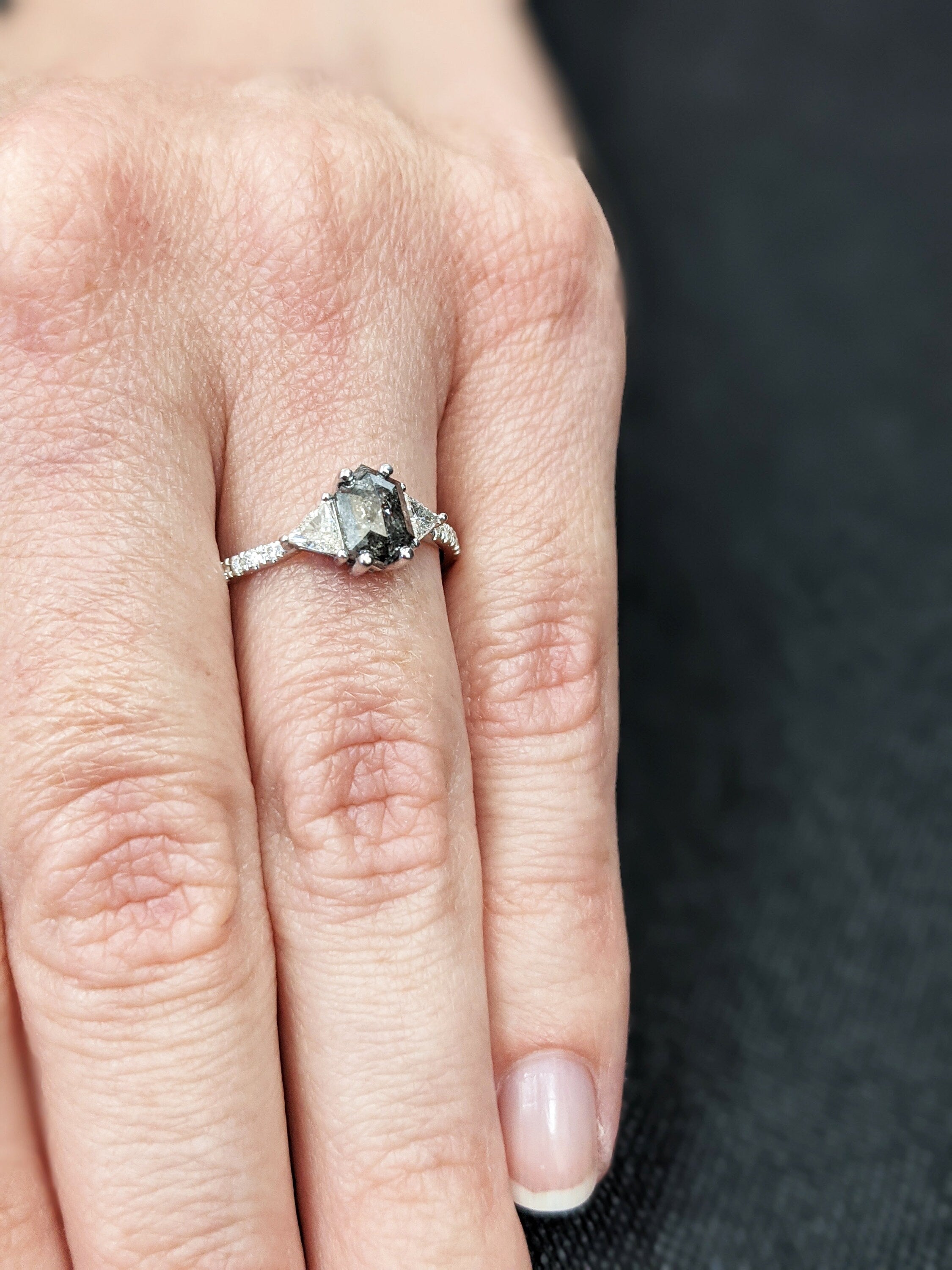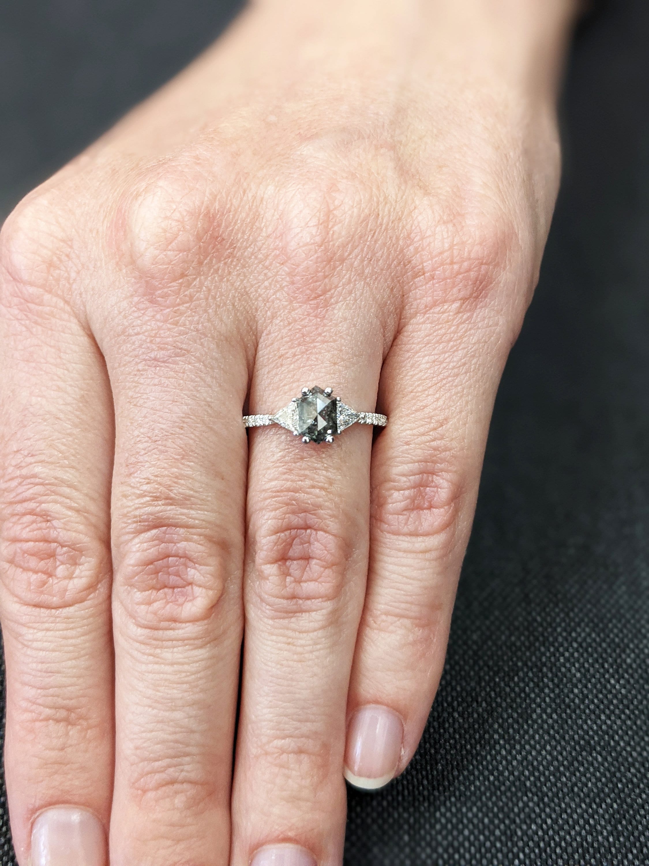 ONE-OF-A-KIND Hexagon salt and pepper diamond, a trillion enhanced diamond ring that is just pure uniqueness, nothing that has ever been seen before.