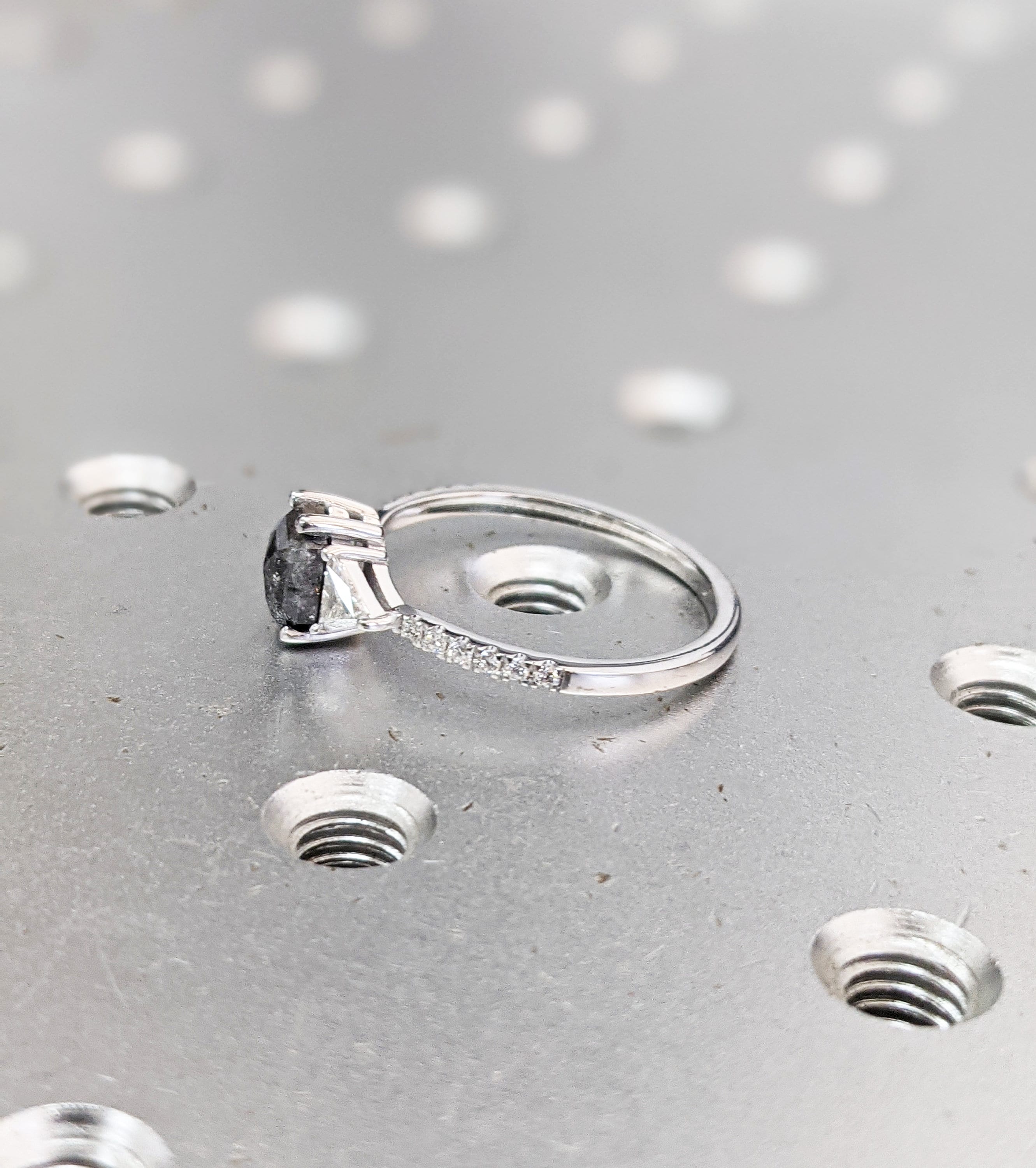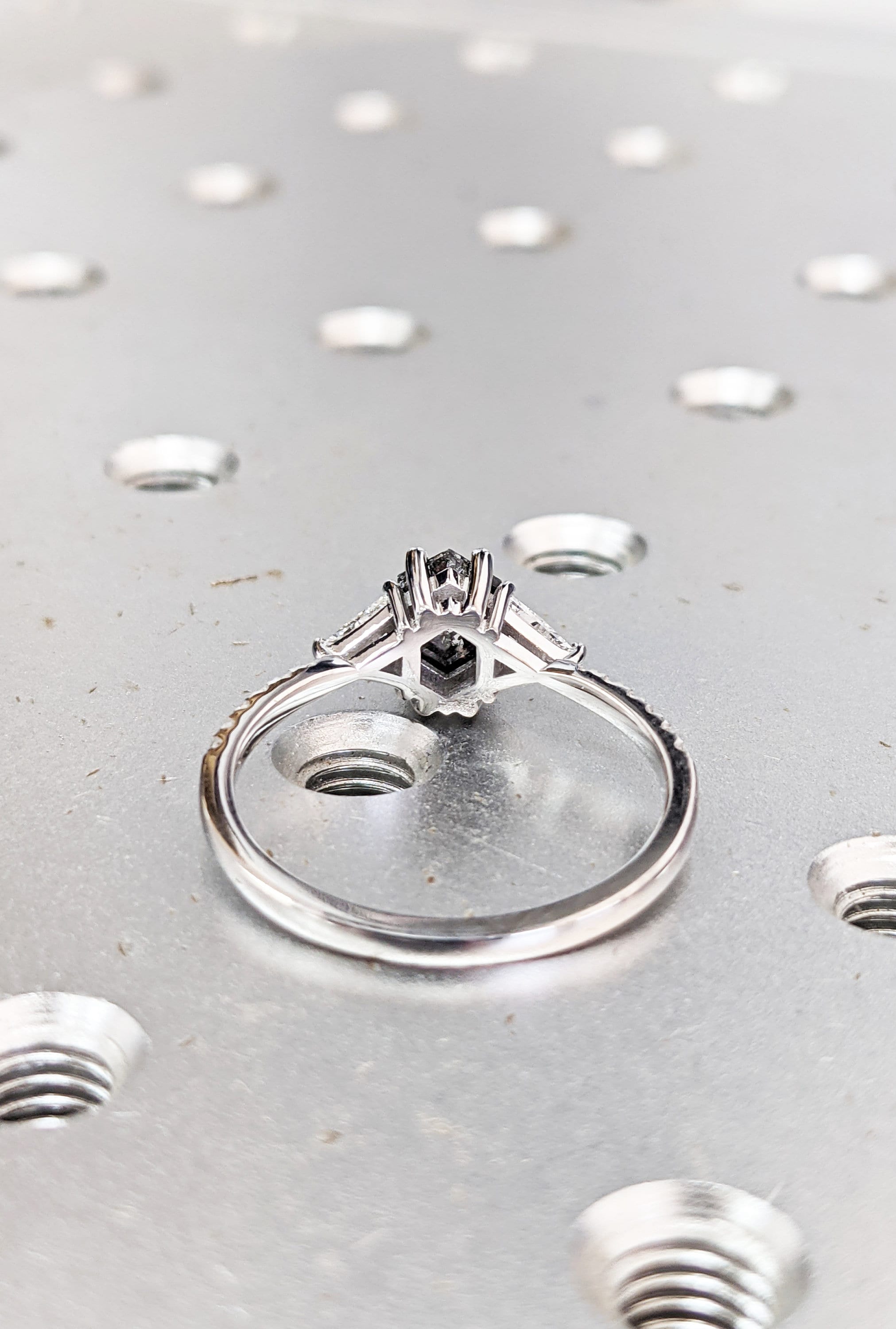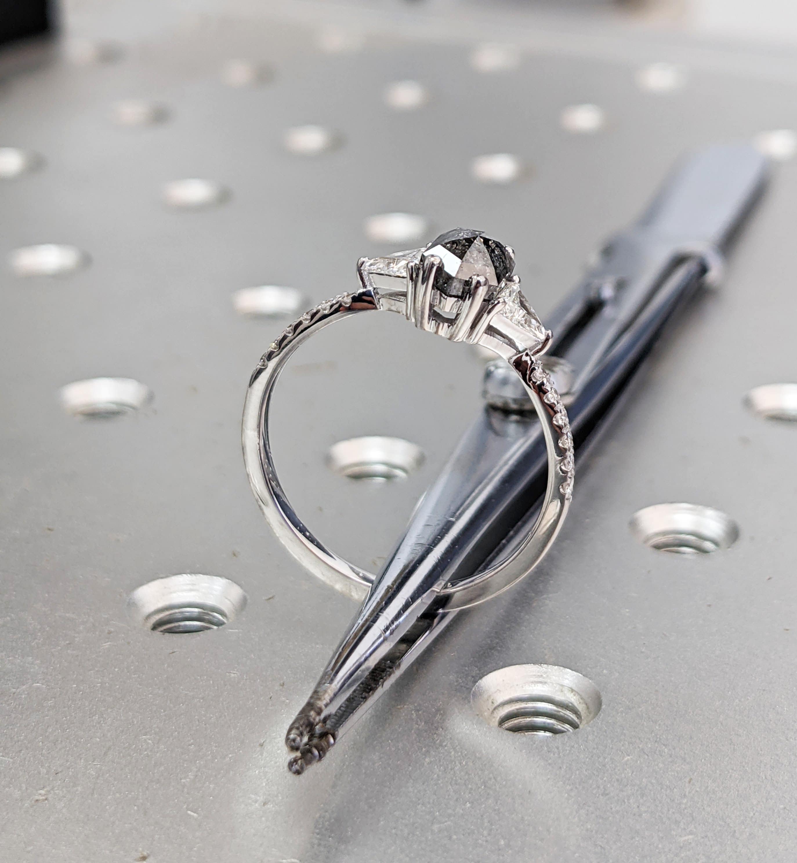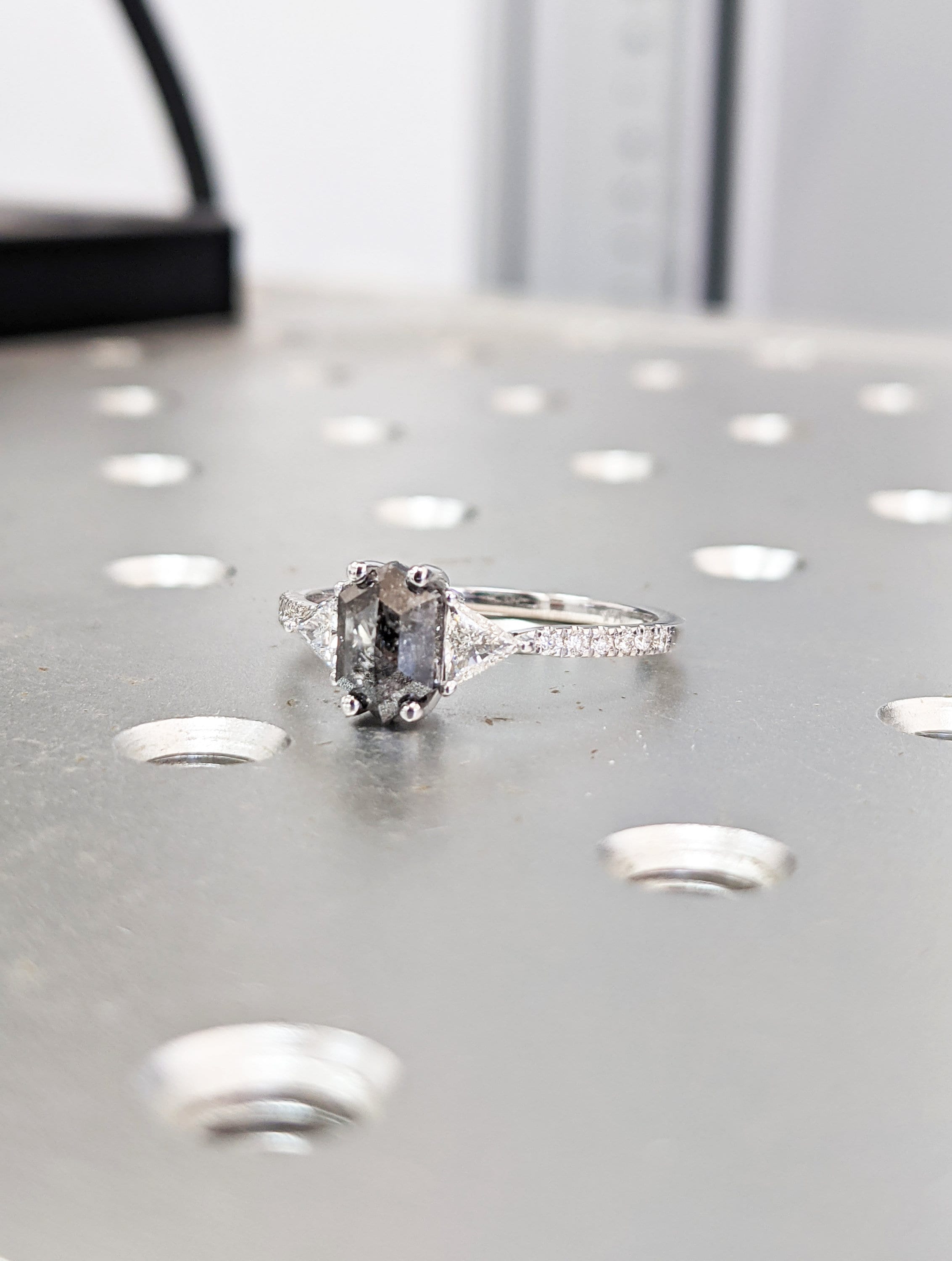 ONE-OF-A-KIND Hexagon salt and pepper diamond, a trillion enhanced diamond ring that is just pure uniqueness, nothing that has ever been seen before.