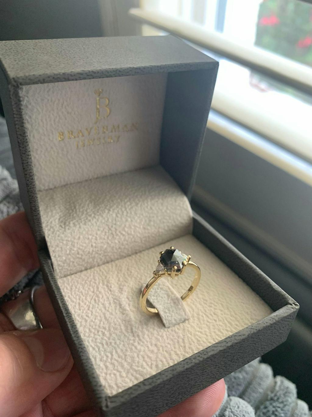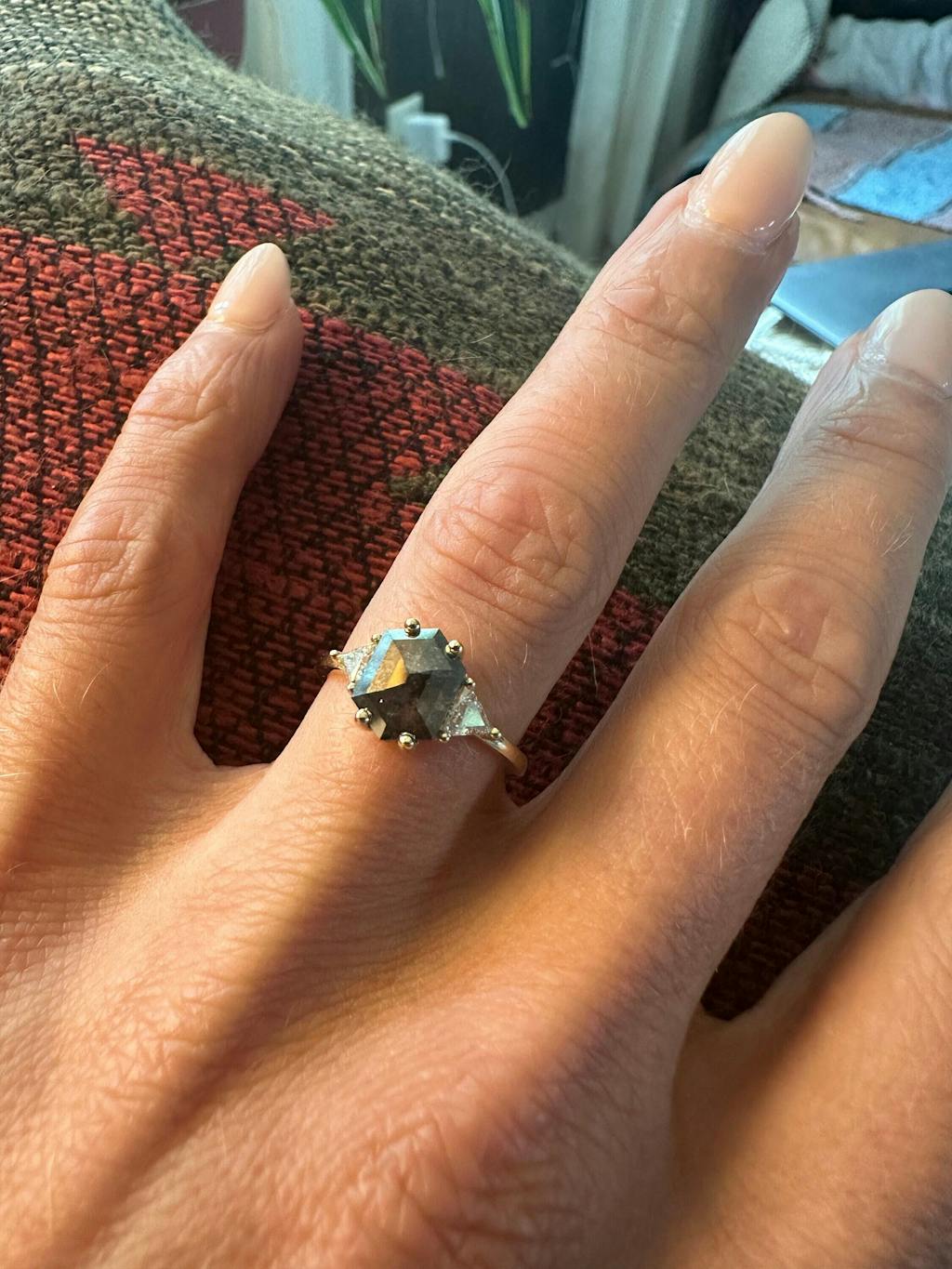 ONE-OF-A-KIND Hexagon salt and pepper diamond, a trillion enhanced diamond ring that is just pure uniqueness, nothing that has ever been seen before.