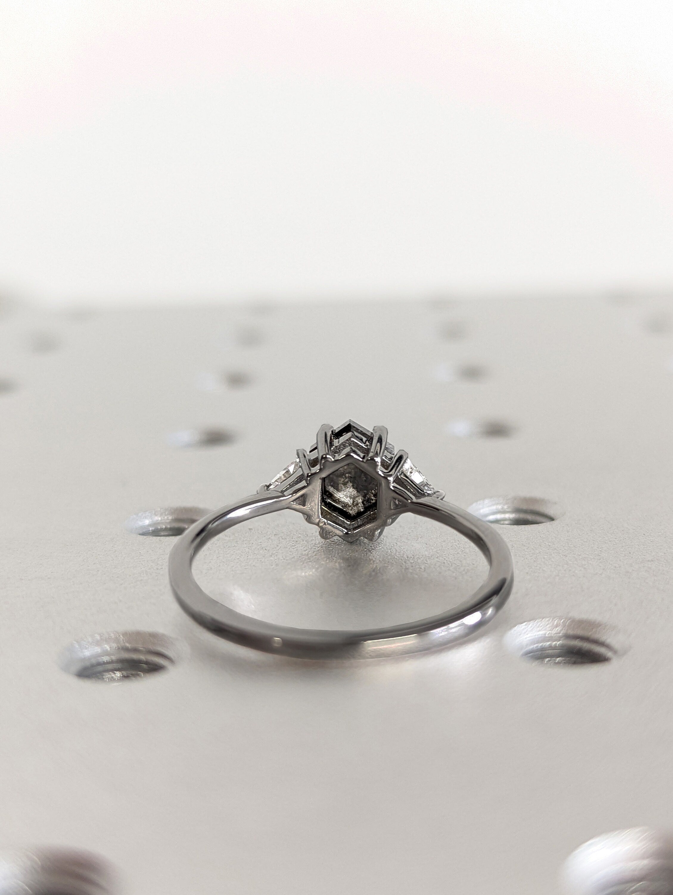 ONE-OF-A-KIND Hexagon salt and pepper diamond, a trillion enhanced diamond ring that is just pure uniqueness, nothing that has ever been seen before. Can match with a gold wedding band.