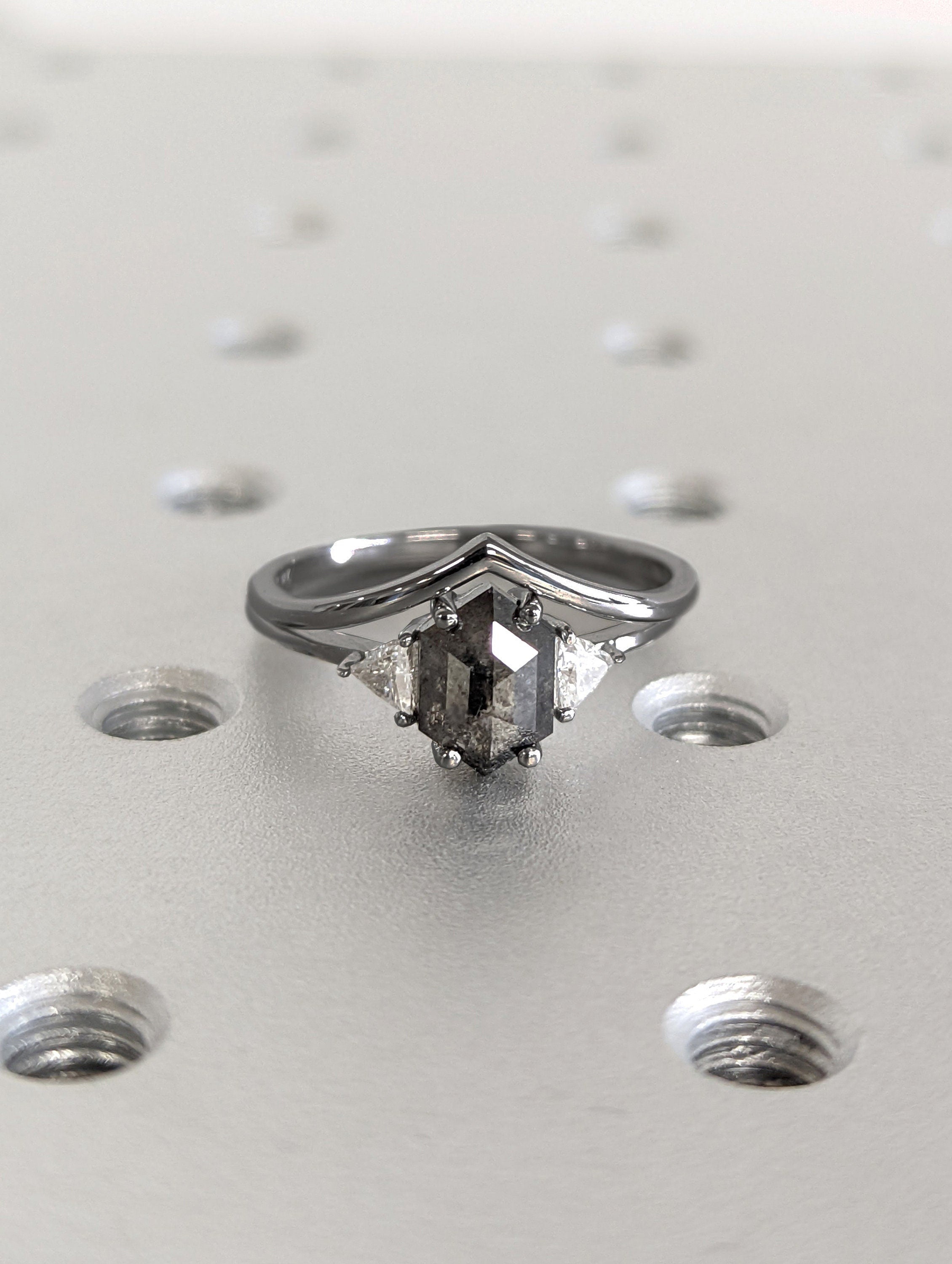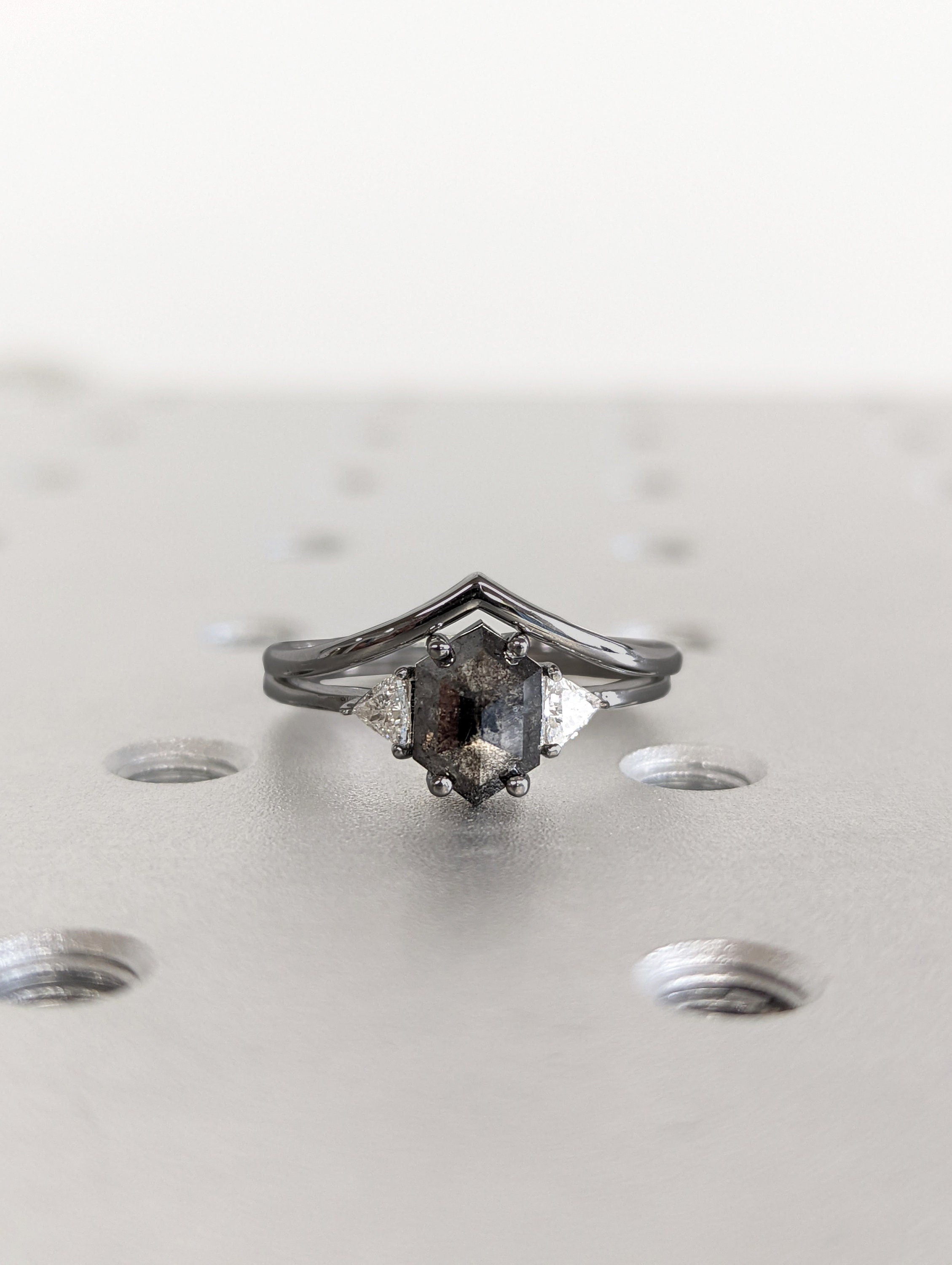 Raw Diamond Hexagon Triangle Diamond, Salt and Pepper, Plain Unique Bridal Engagement Set, Rose Cut Geometric Diamond Ring, Custom Handmade