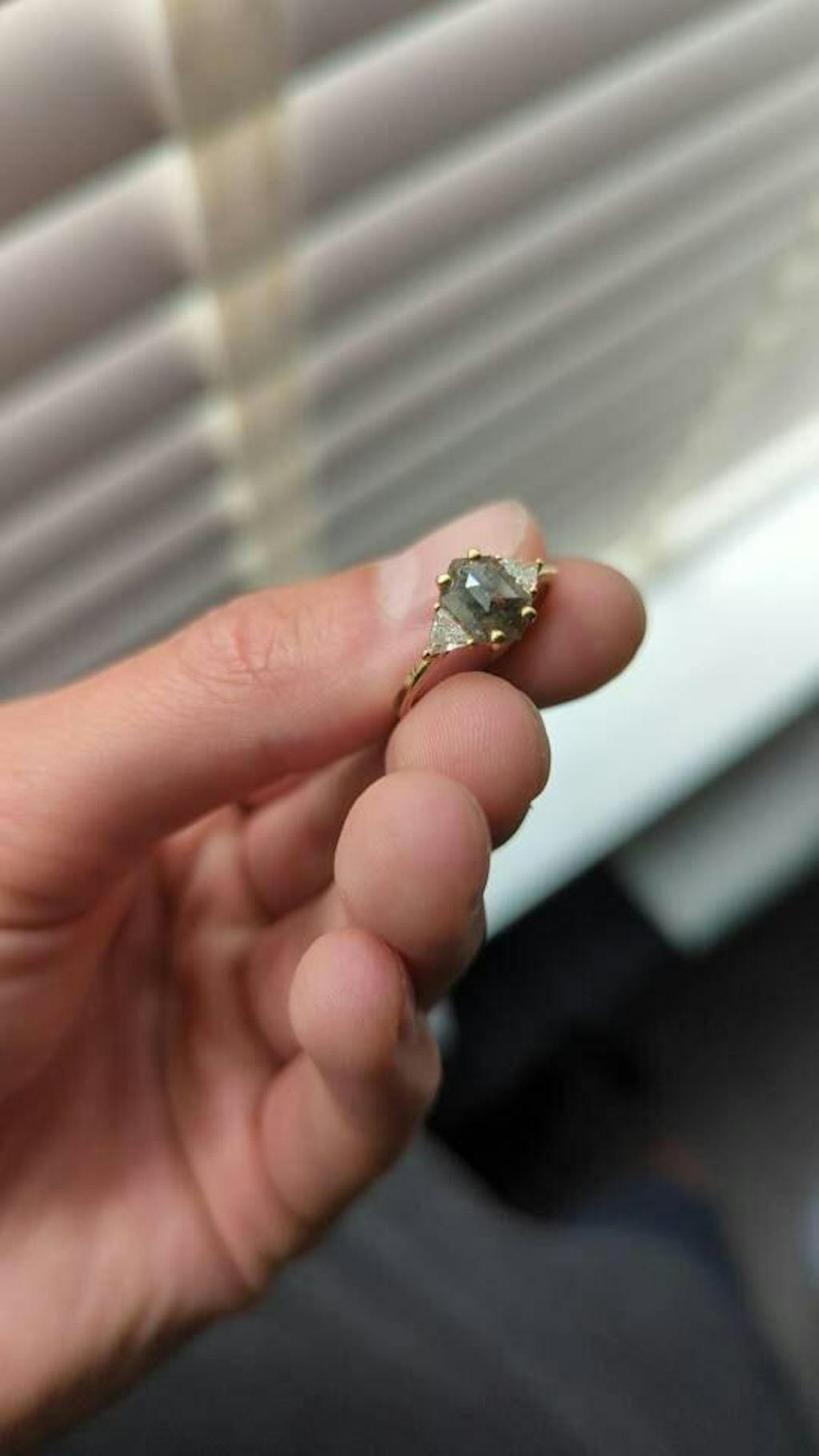 ONE-OF-A-KIND Hexagon salt and pepper diamond, a trillion enhanced diamond ring that is just pure uniqueness, nothing that has ever been seen before. Can match with a gold wedding band.