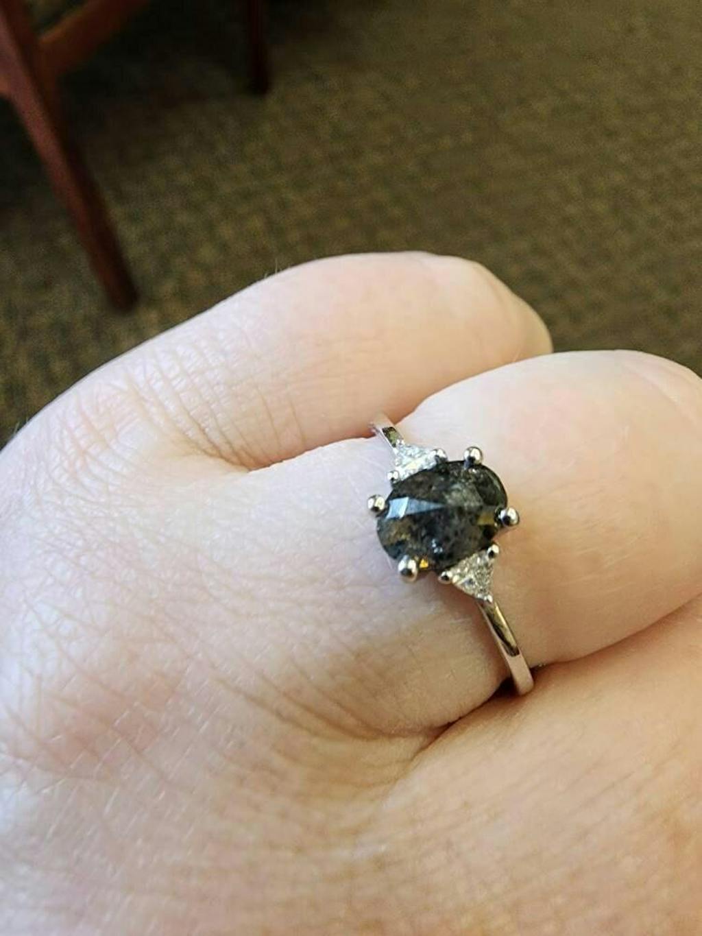 ONE-OF-A-KIND Oval salt and pepper diamond, a trillion enhanced diamond ring that is just pure uniqueness, nothing that has ever been seen before.