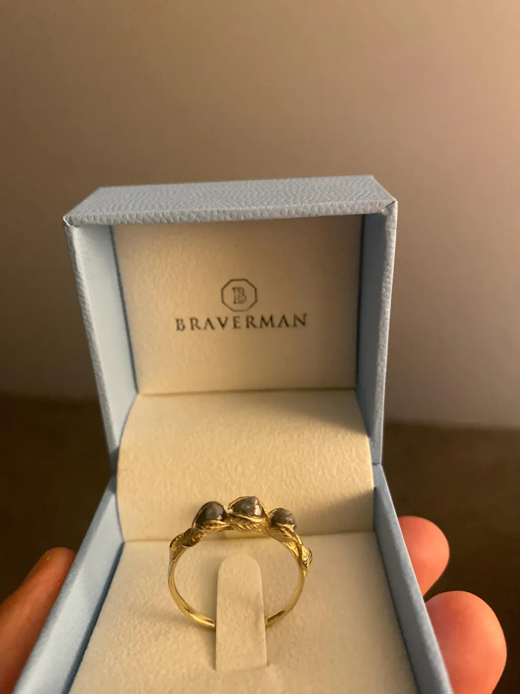 This beautiful nature inspired ring features a vine of leaves, entangled over a twig - gently grasping 3 raw rough uncut diamonds, this piece is made to order, to ever-last and symbolize the natural aspect of LOVE :)