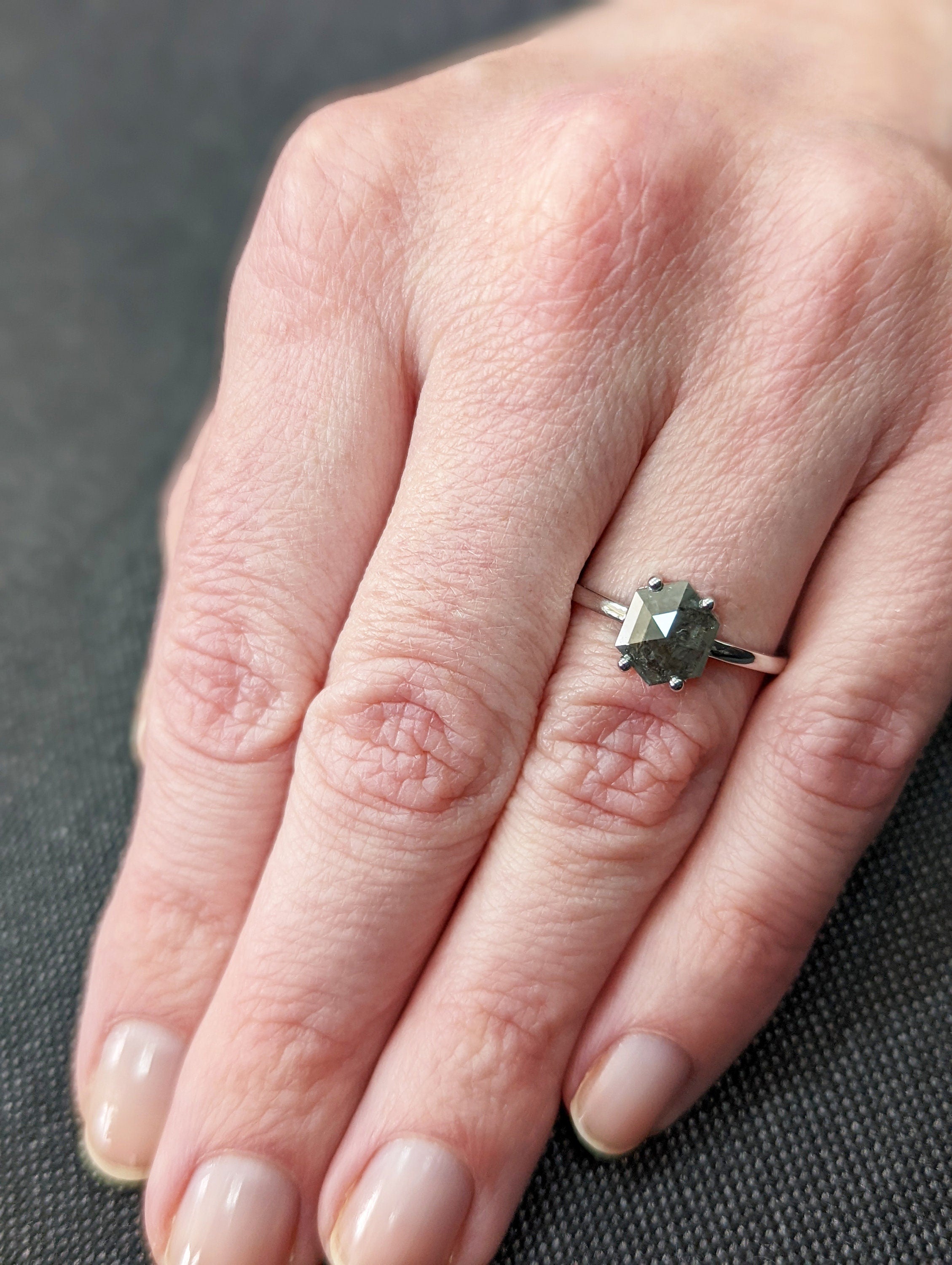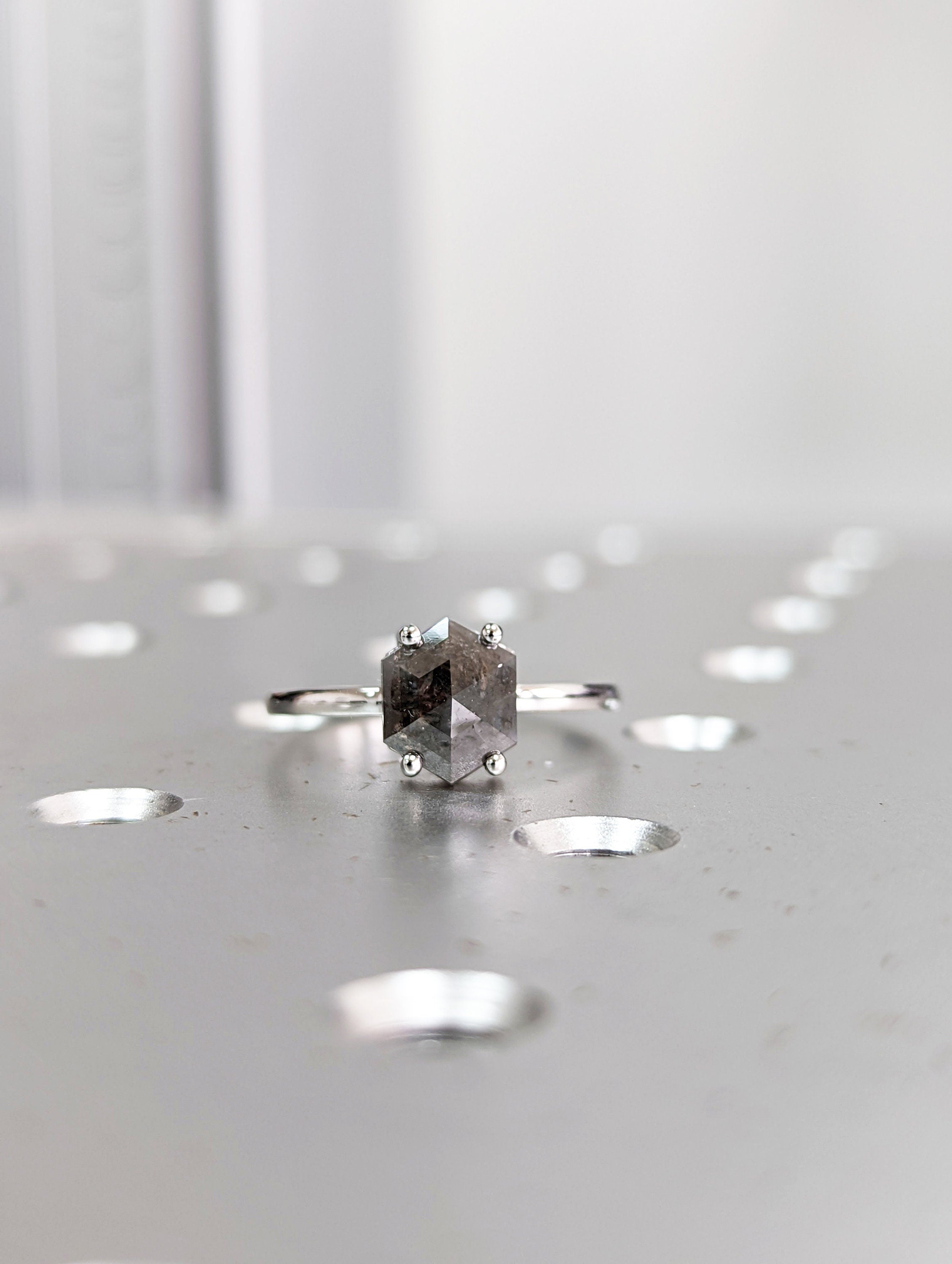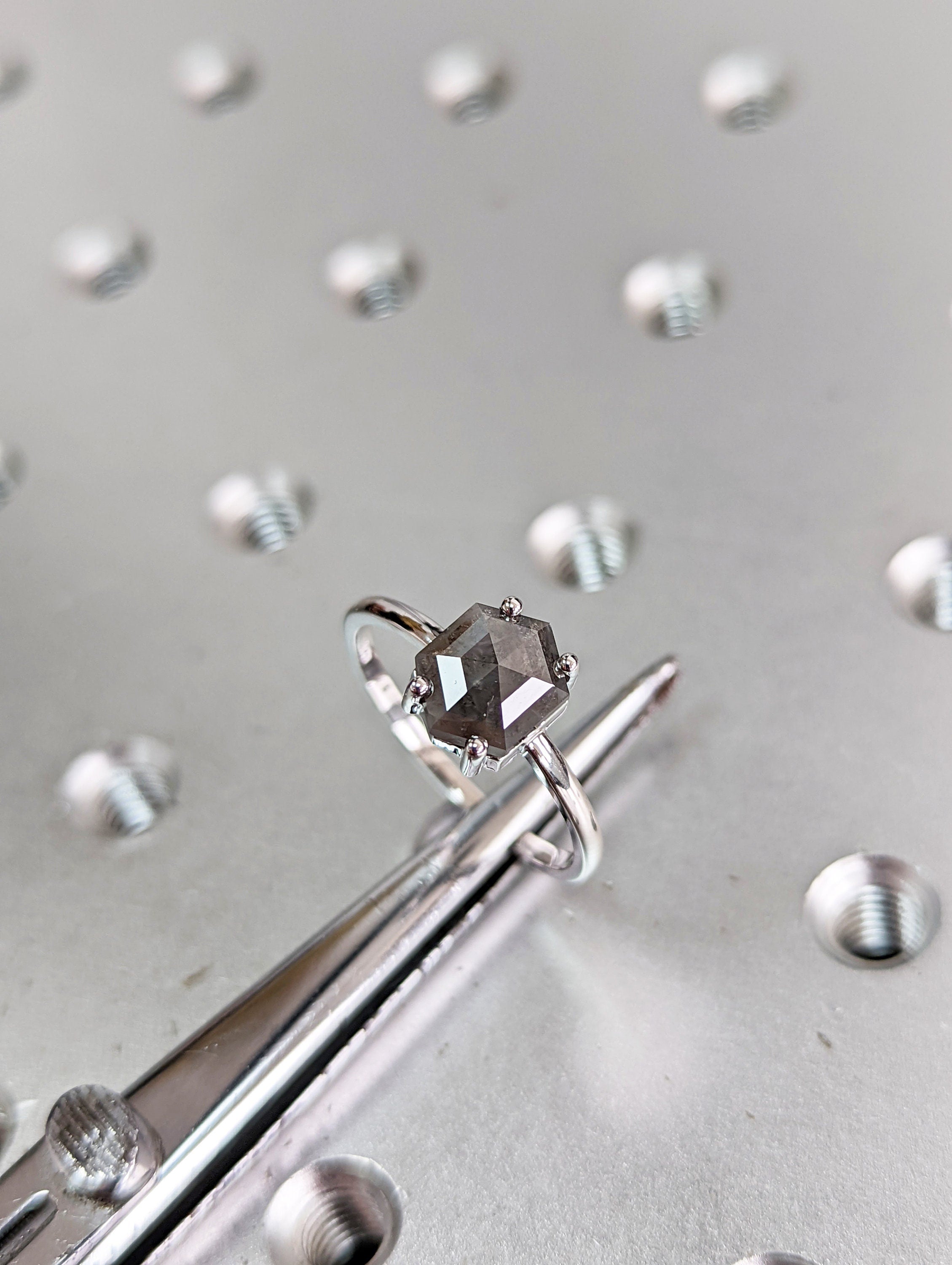 ONE-OF-A-KIND Hexagon salt and pepper diamond, solitaire ring that is just pure uniqueness, nothing that has ever been seen before.