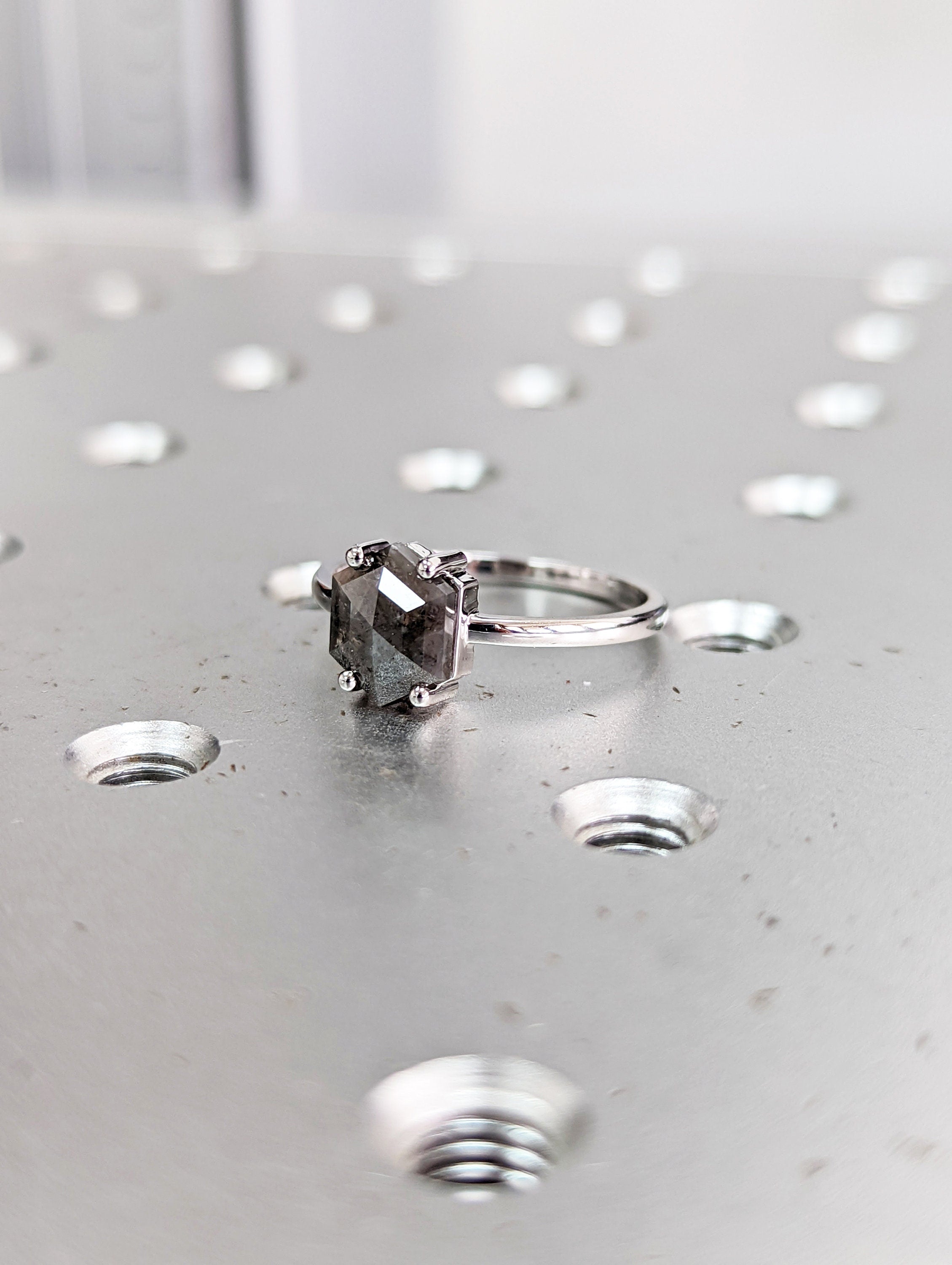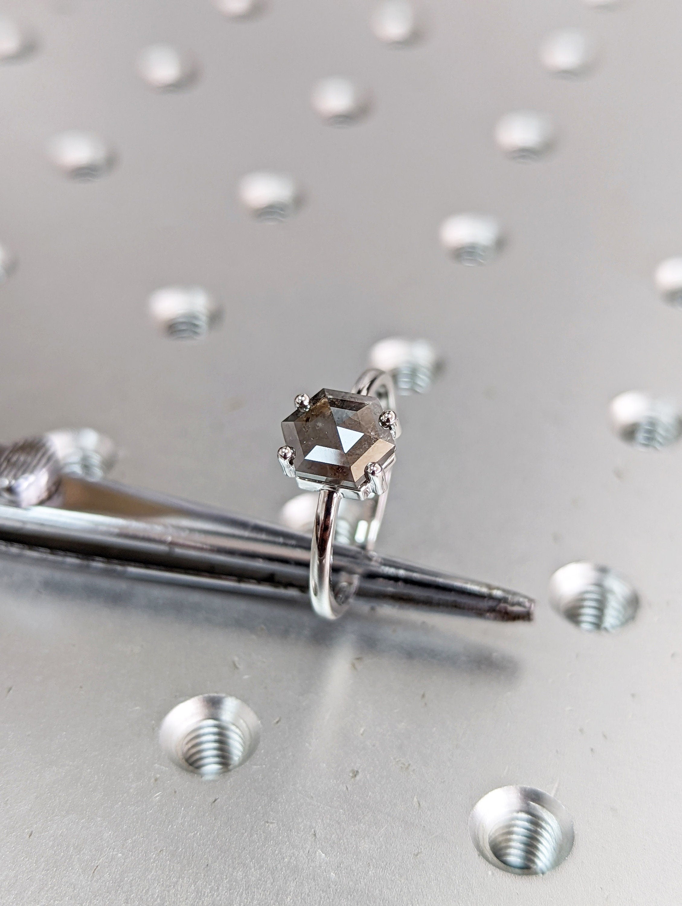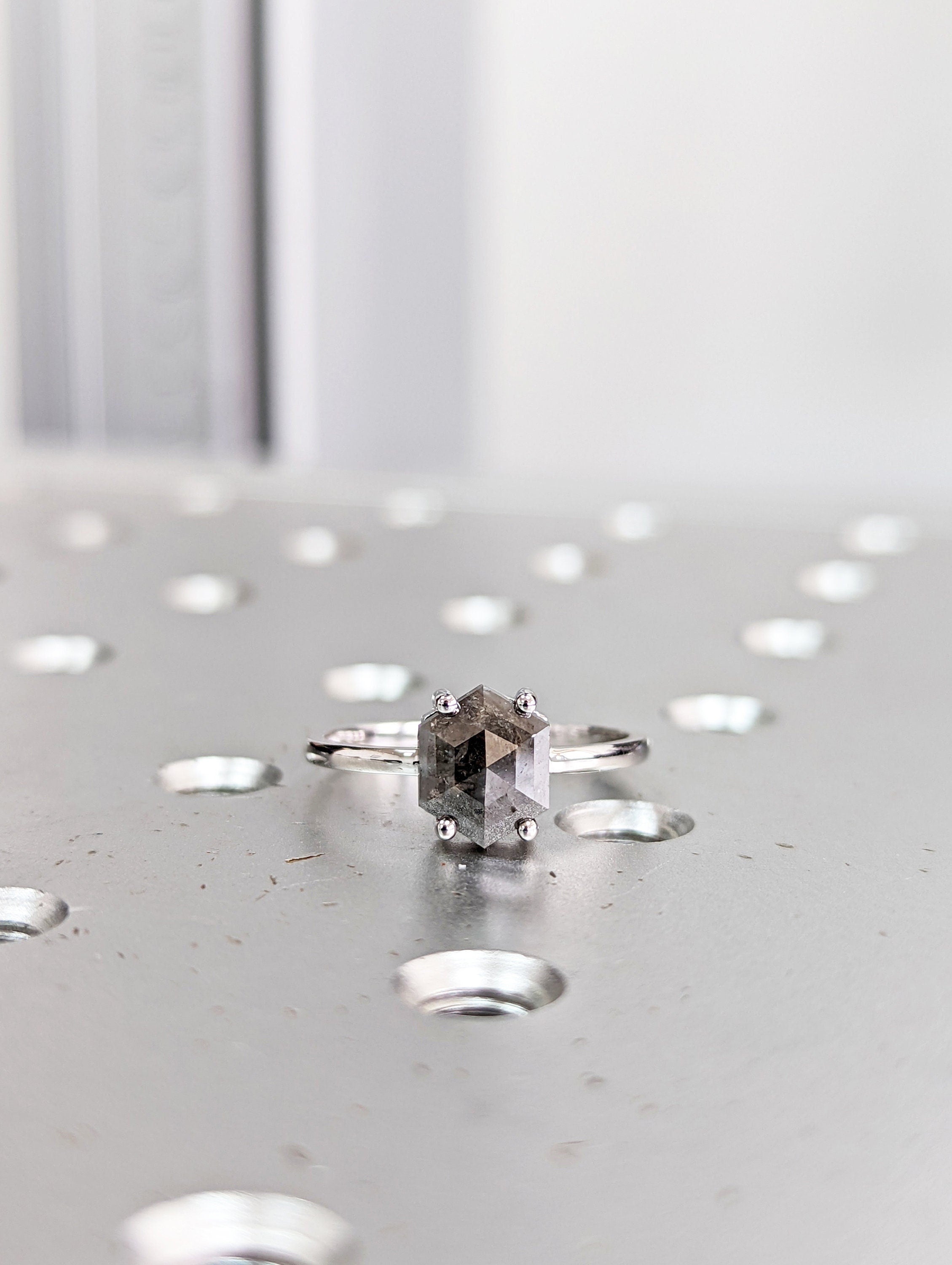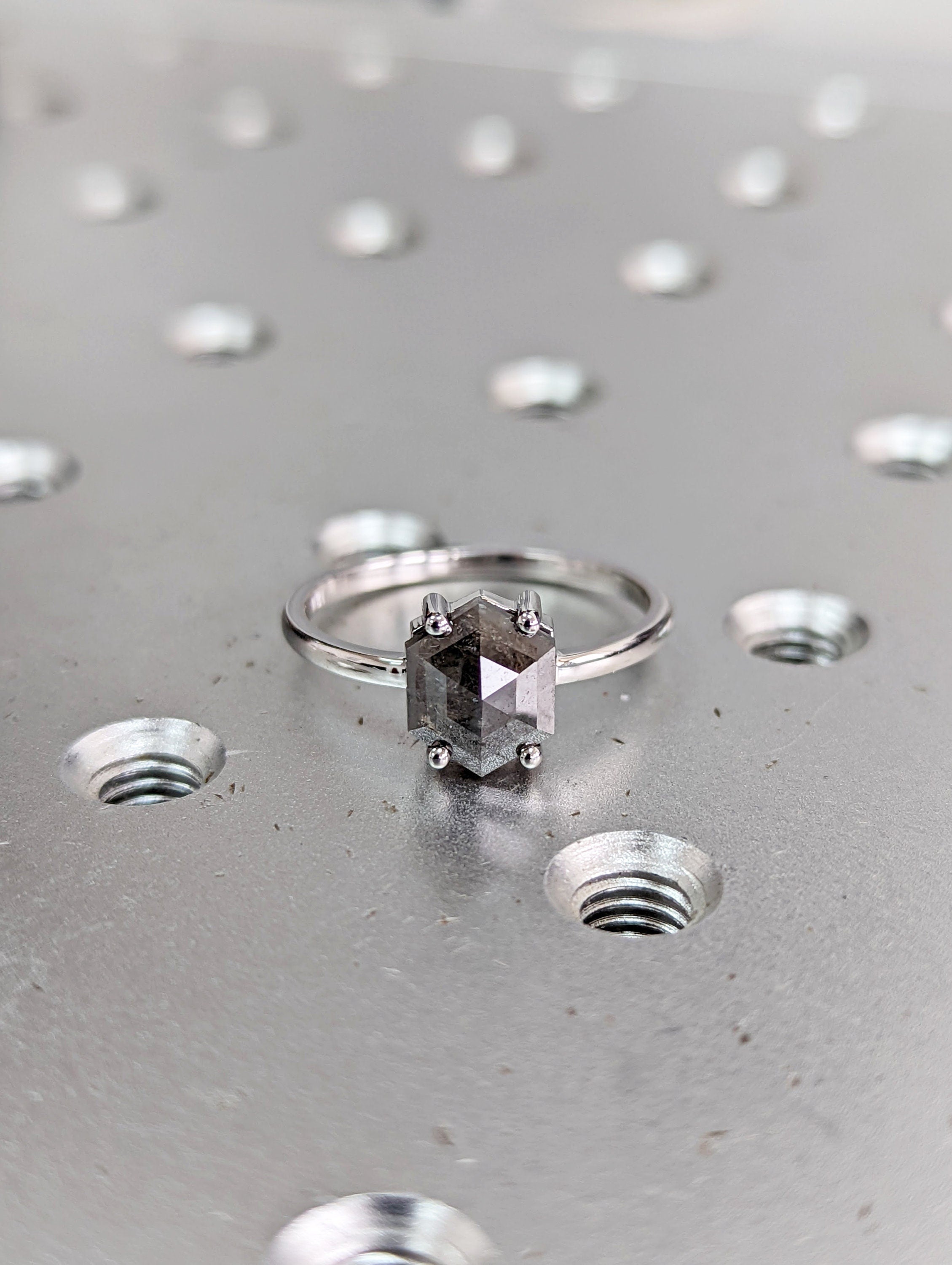 ONE-OF-A-KIND Hexagon salt and pepper diamond, solitaire ring that is just pure uniqueness, nothing that has ever been seen before.