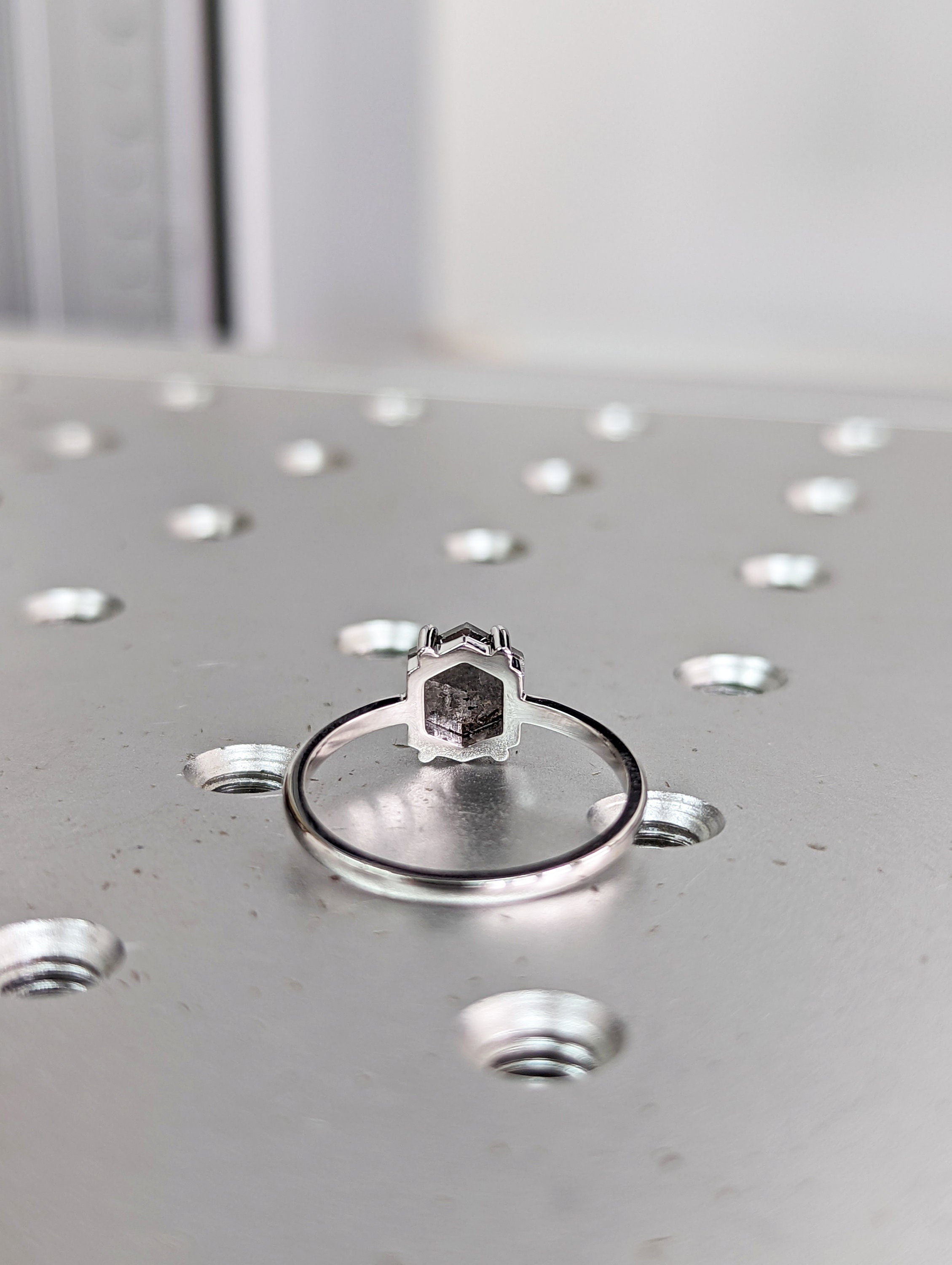 Raw Diamond, Salt and Pepper, Hexagon, Unique Engagement Ring, Rose Cut Geometric Diamond Ring, 14k Gold, Custom Handmade