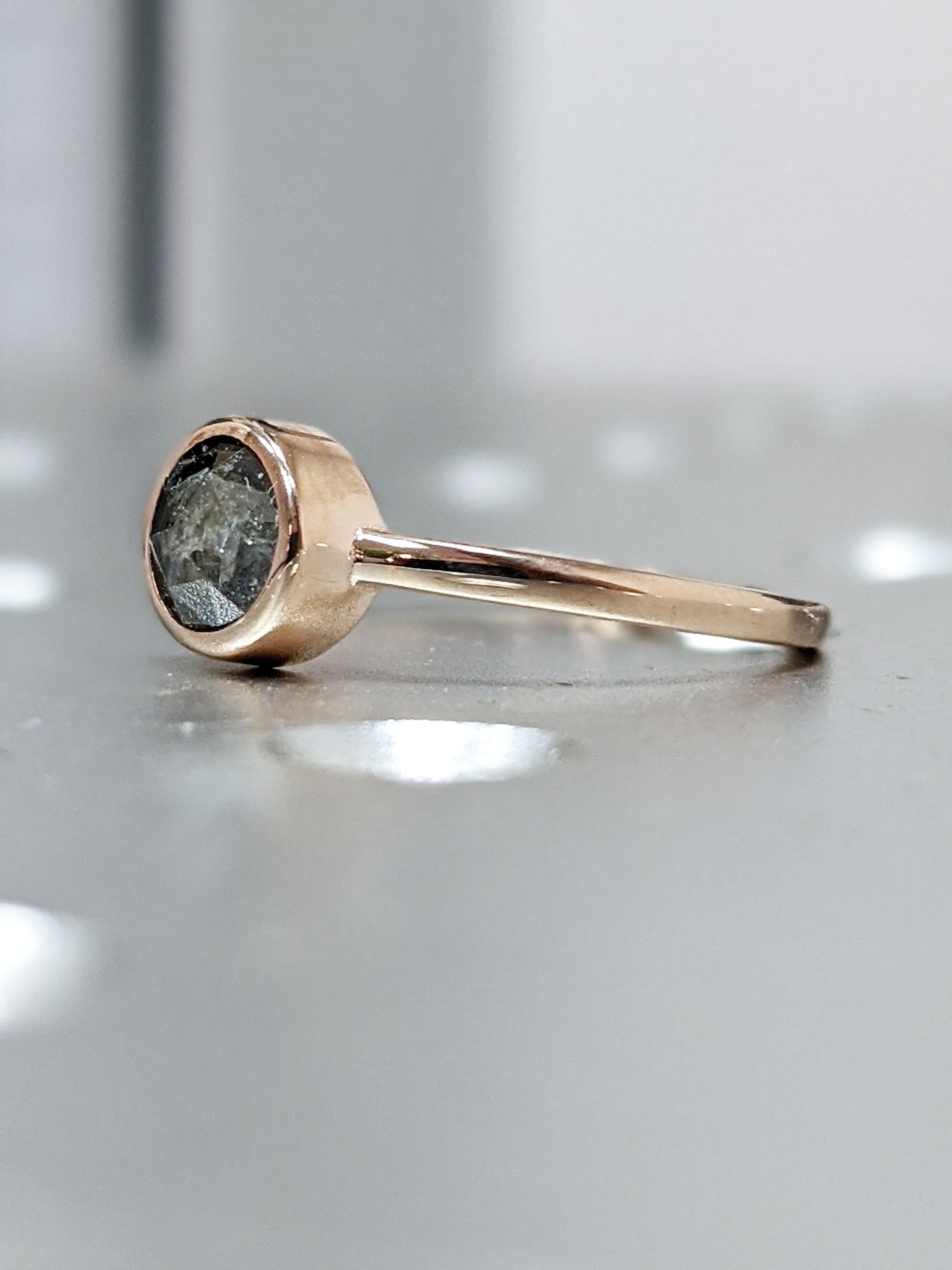 ONE-OF-A-KIND Round Rose Cut salt and pepper diamond, solitaire ring that is just pure uniqueness, nothing that has ever been seen before.