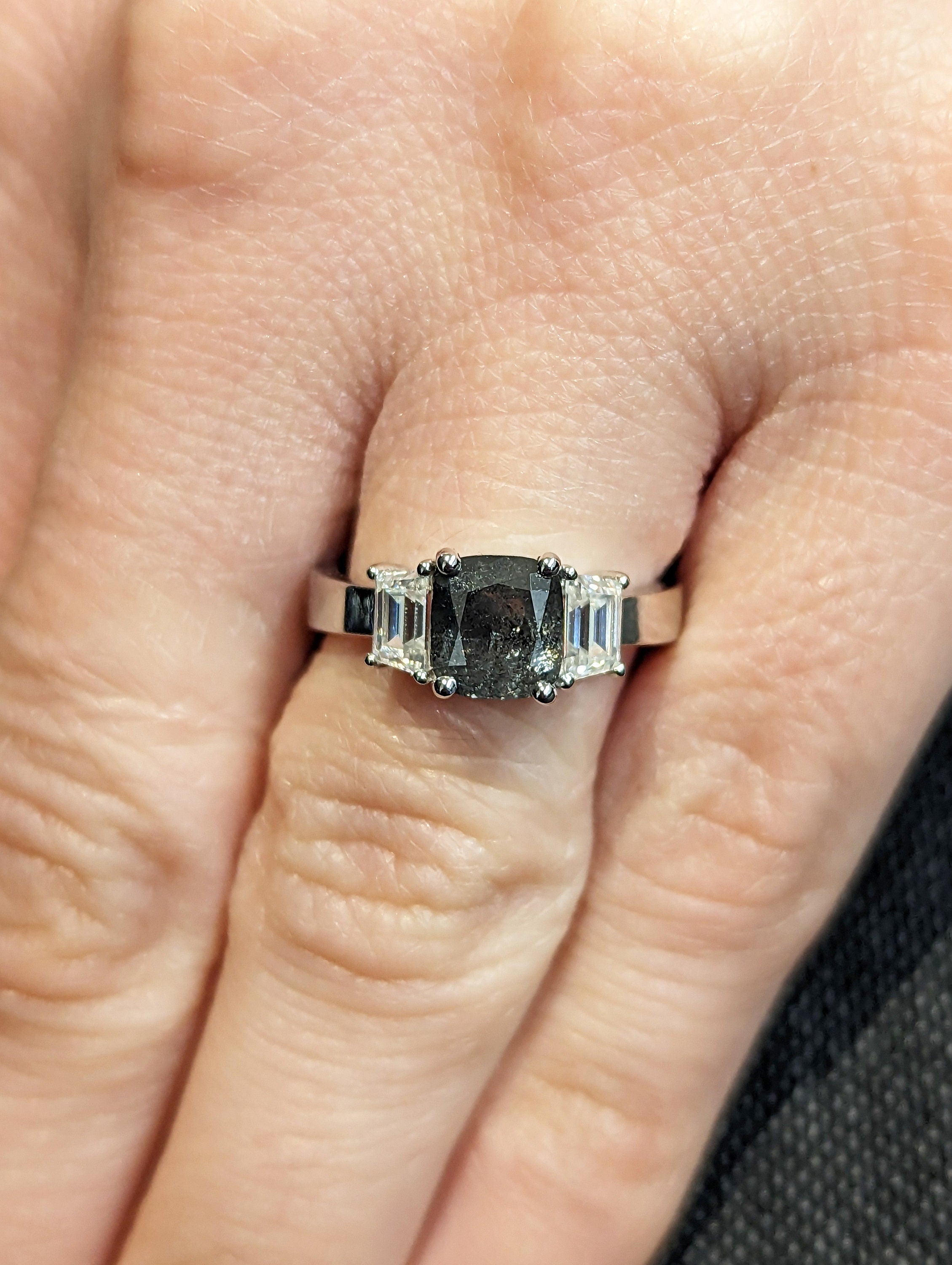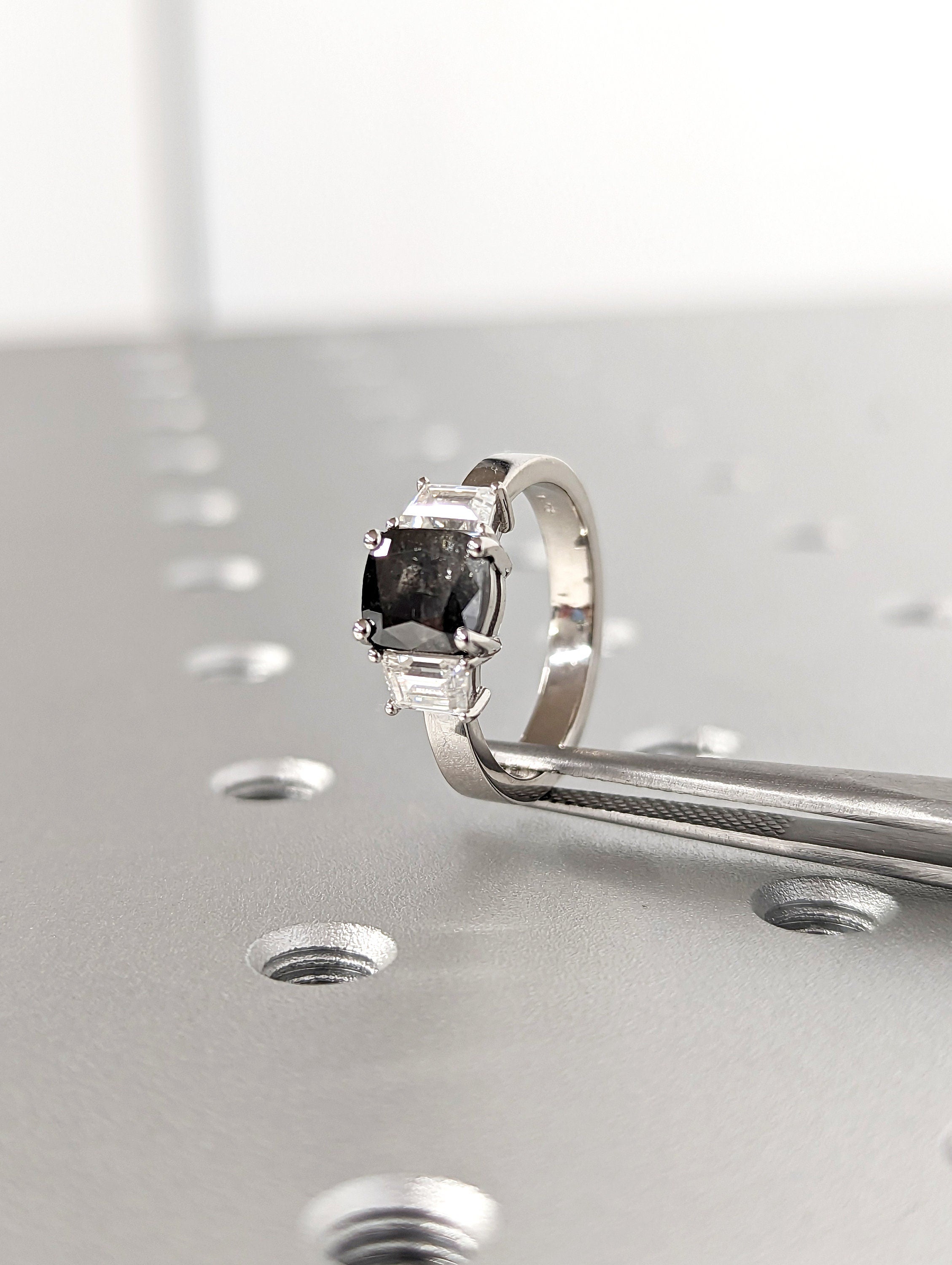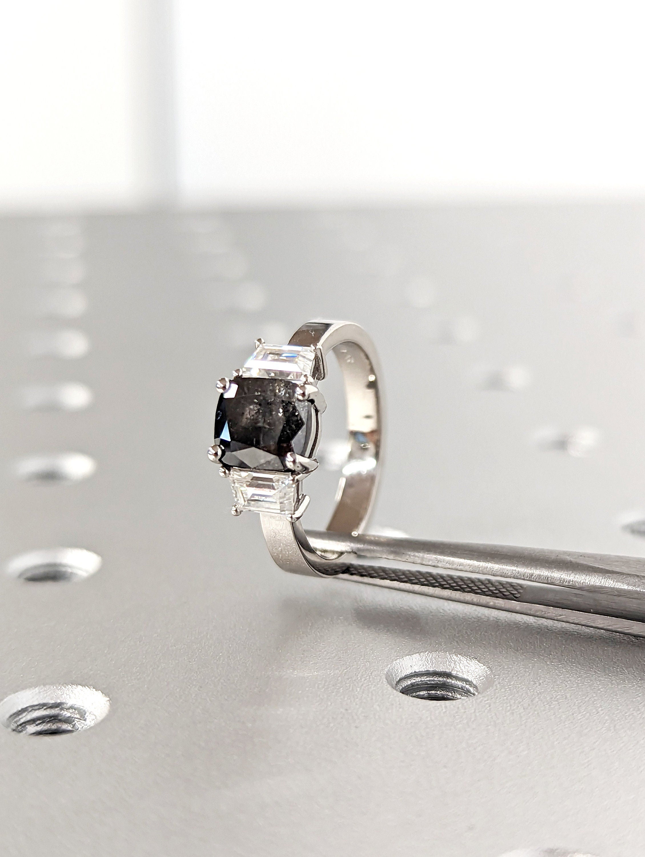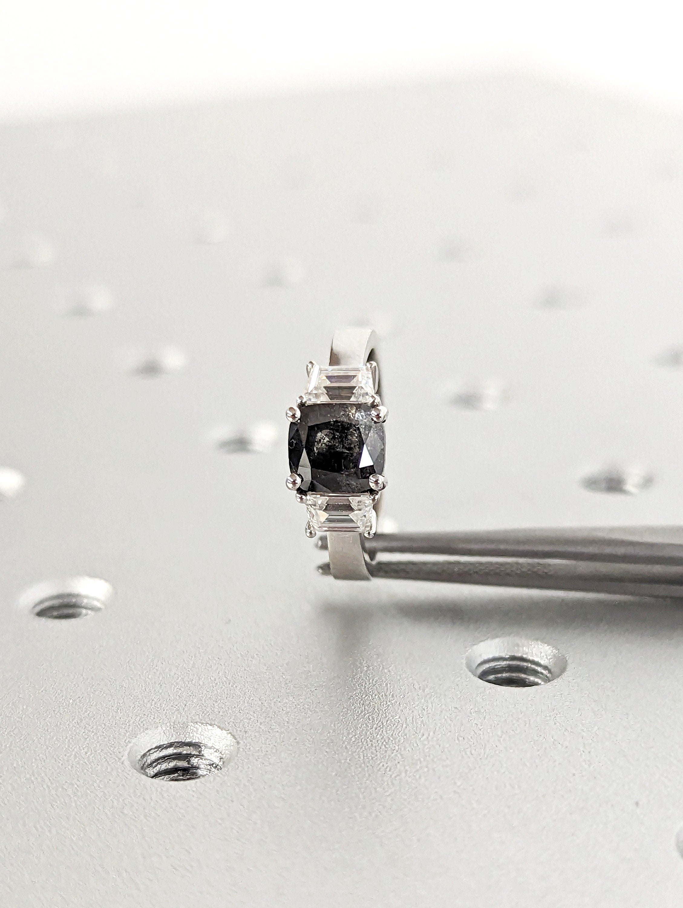 ONE-OF-A-KIND Cushion cut salt and pepper diamond, flanked by trapezoid moissanite shoulders - for a ring that is just pure uniqueness. The wider band tapered to emphasise the unique shape of the side stones.