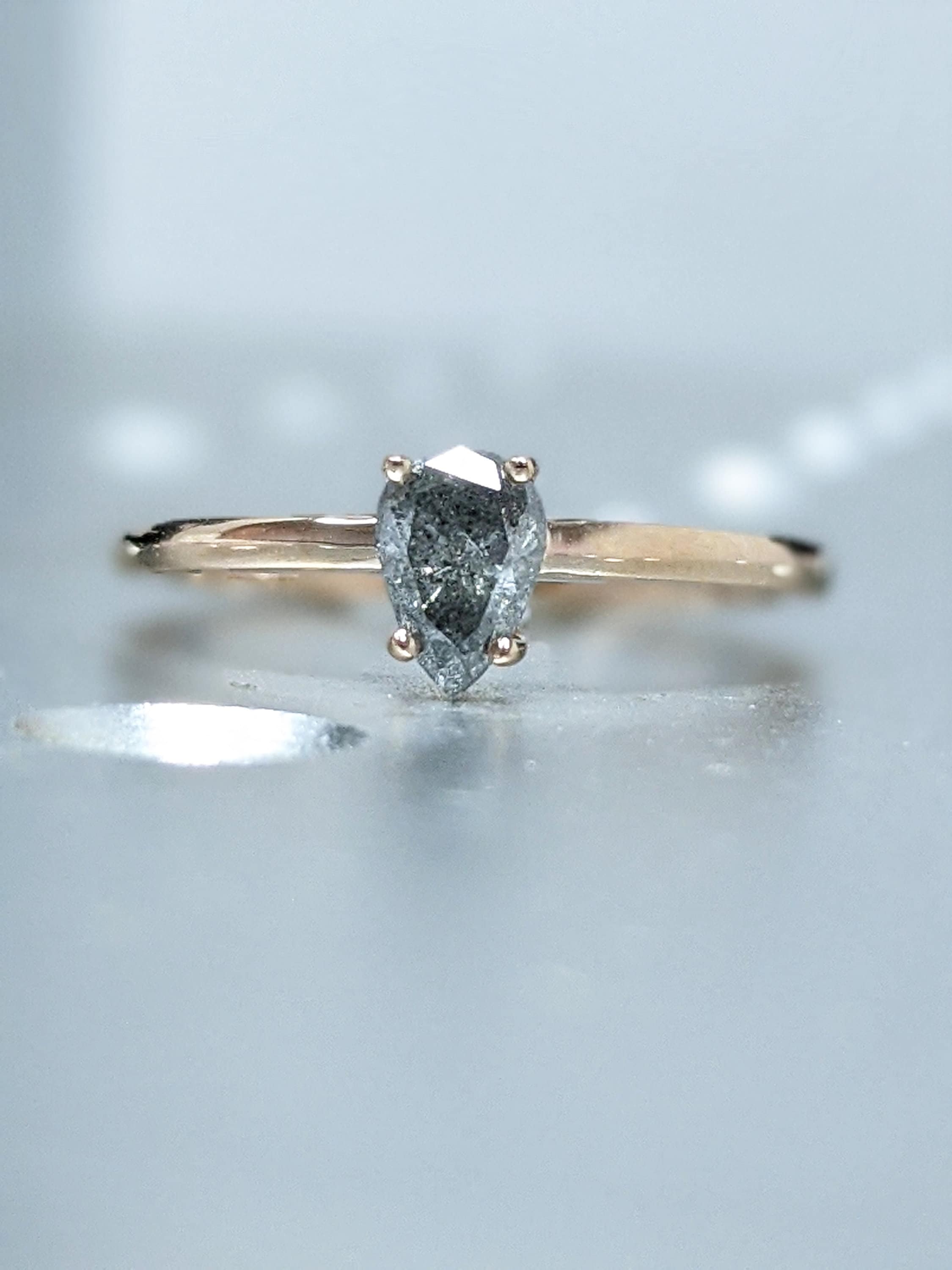 Raw Salt and Pepper Diamond, Rose Cut Pear Diamond Ring, Unique Engagement, Black, Gray Pear, 14k Yellow, Rose, or White Gold