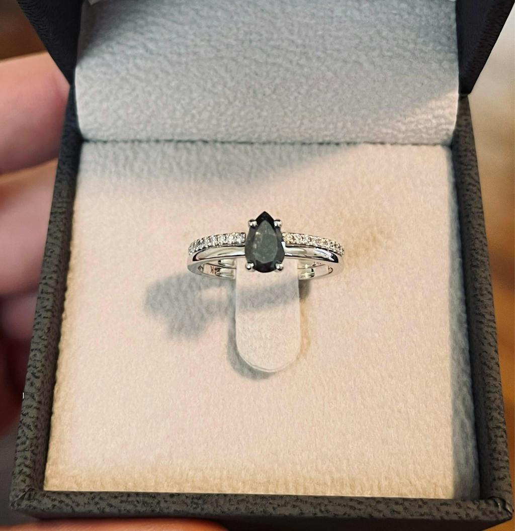 Enchanting vintage inspired design, unique salt and pepper pear shaped diamond, can match with an open diamond band.