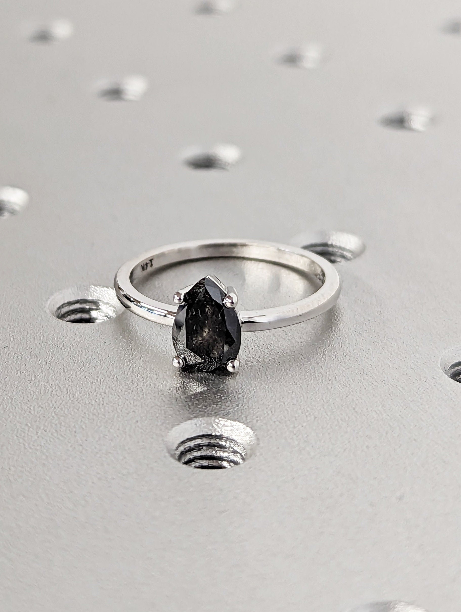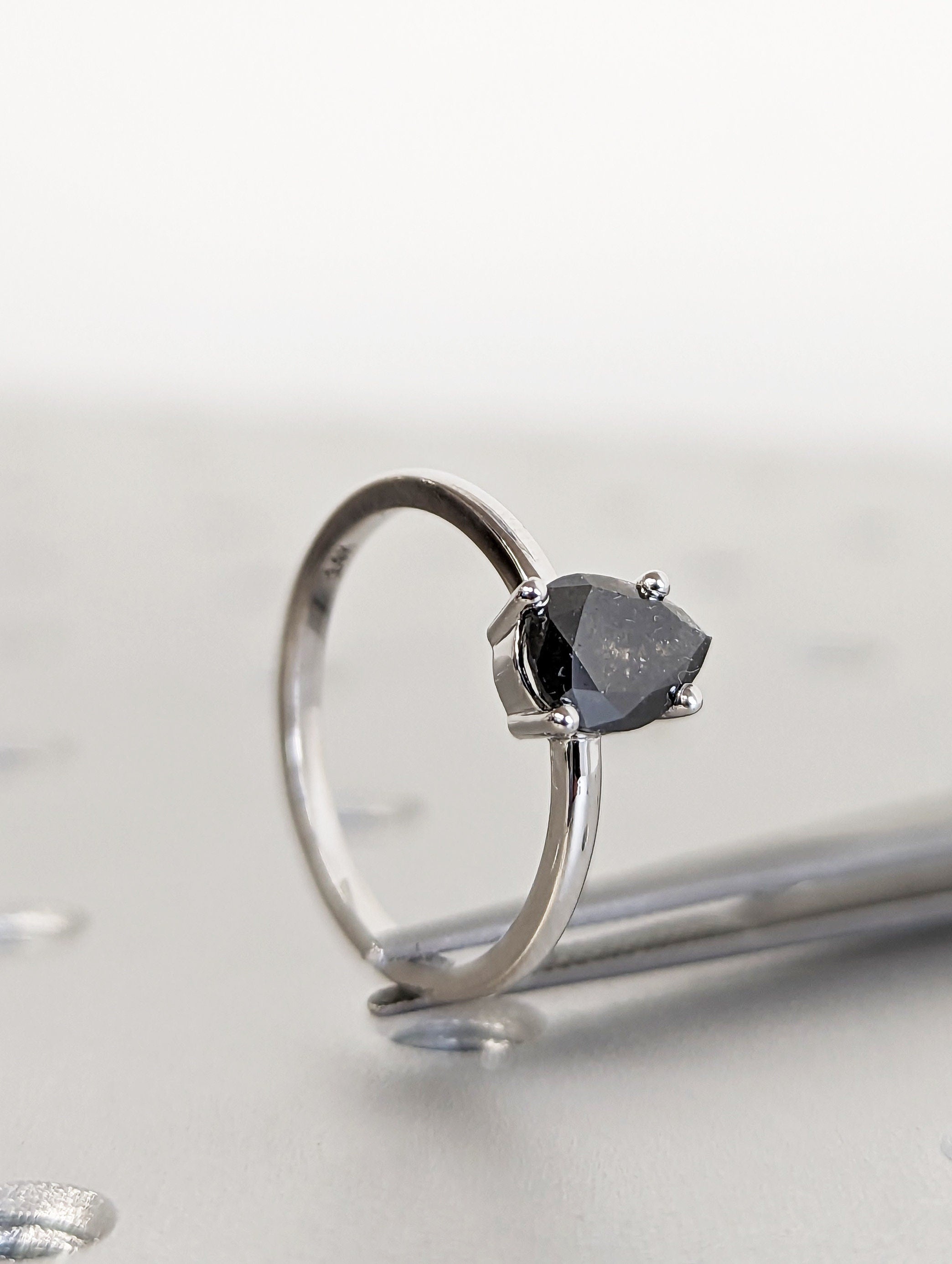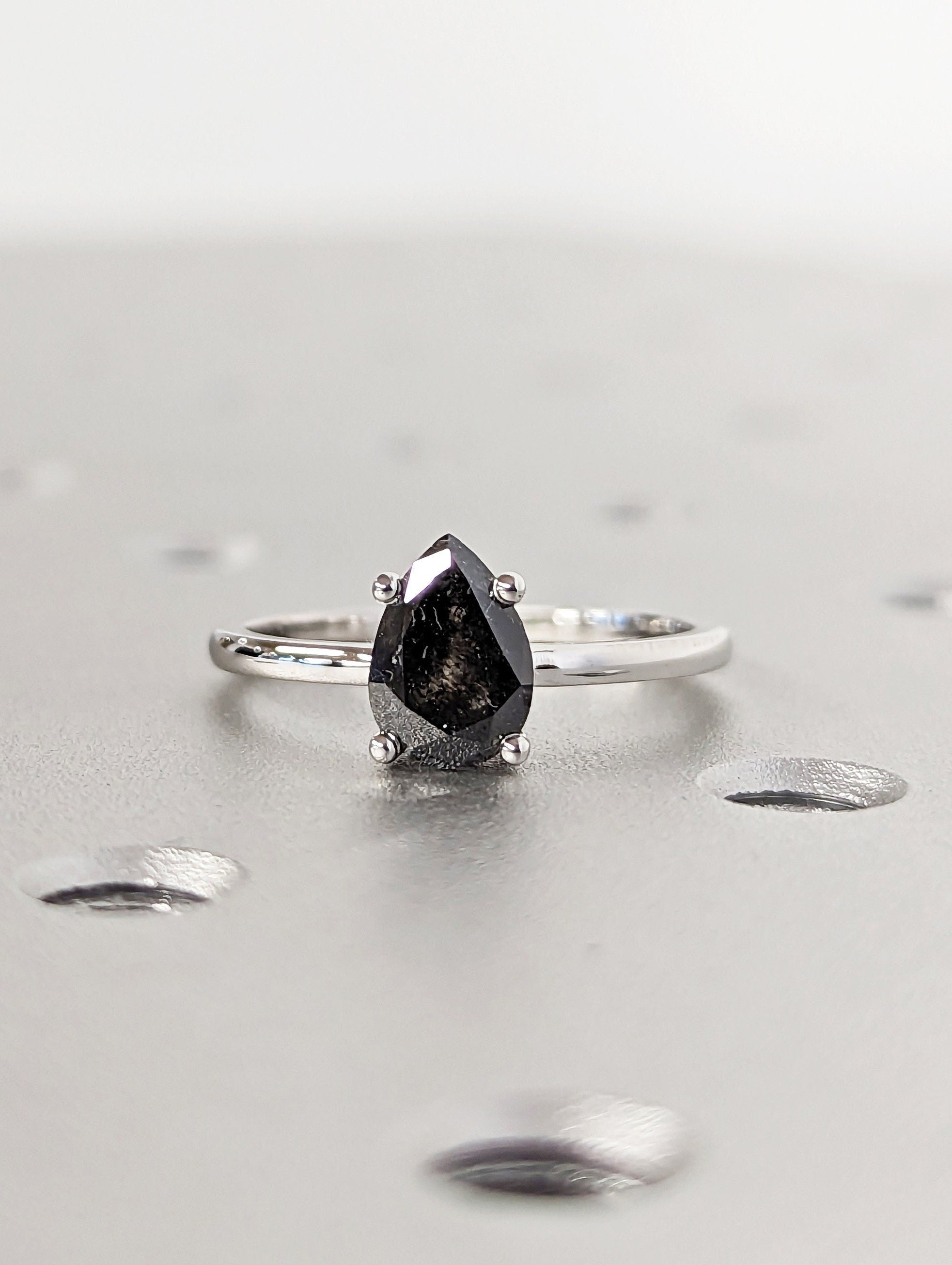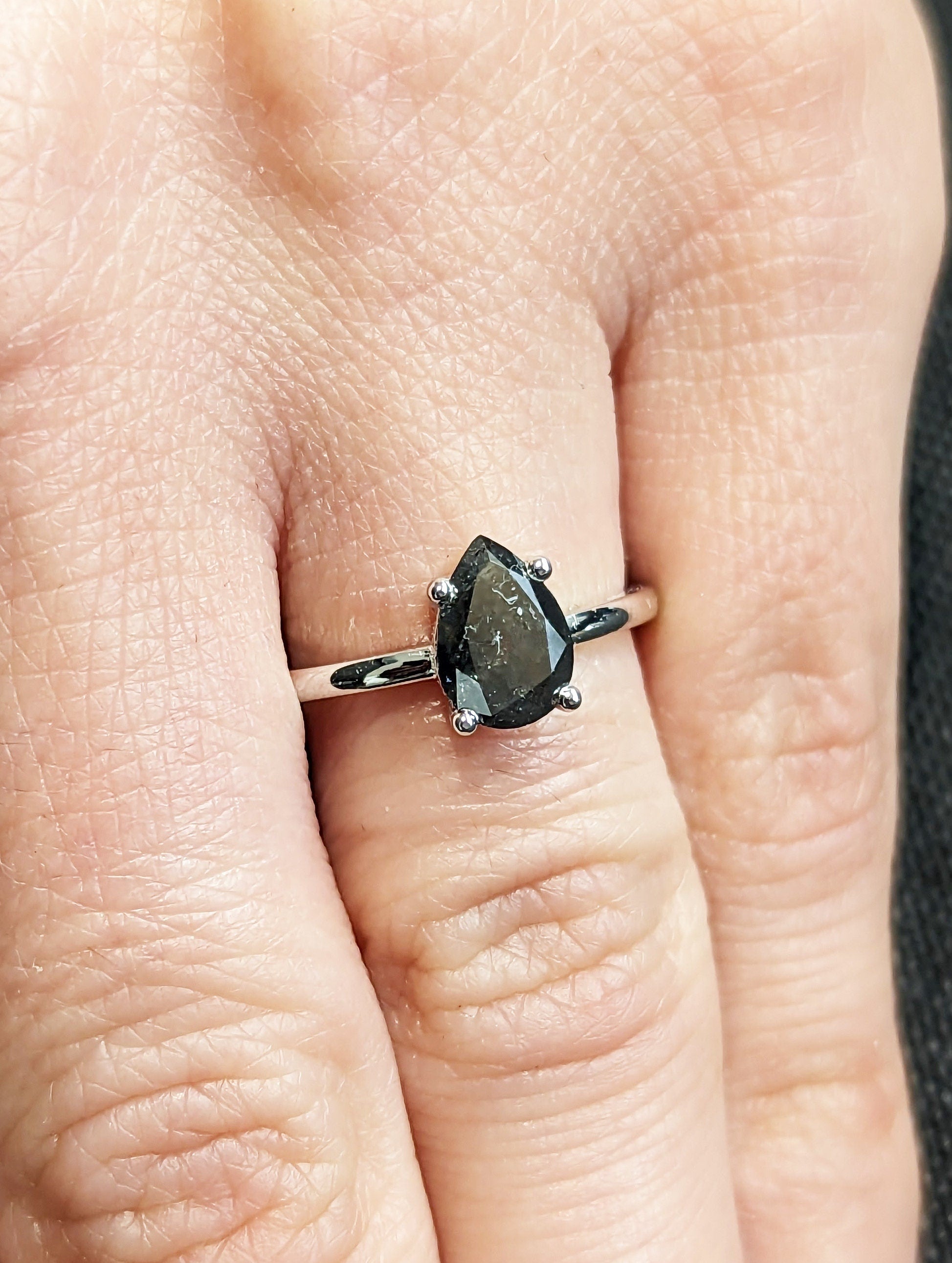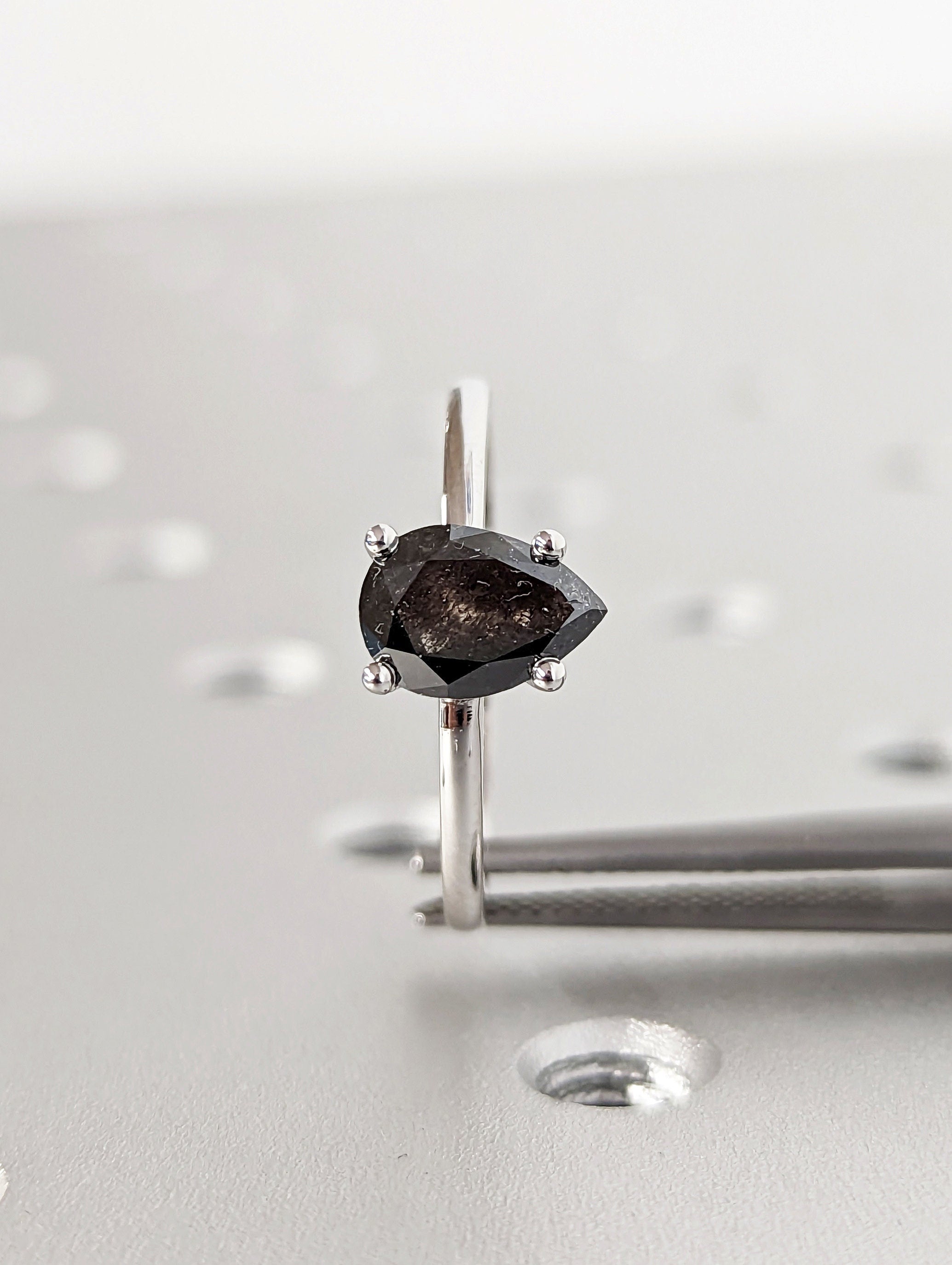 Raw Salt and Pepper Diamond, Rose Cut Pear Diamond Ring, Unique Engagement, Black, Gray Pear, 14k Yellow, Rose, White or Black Gold, Vintage
