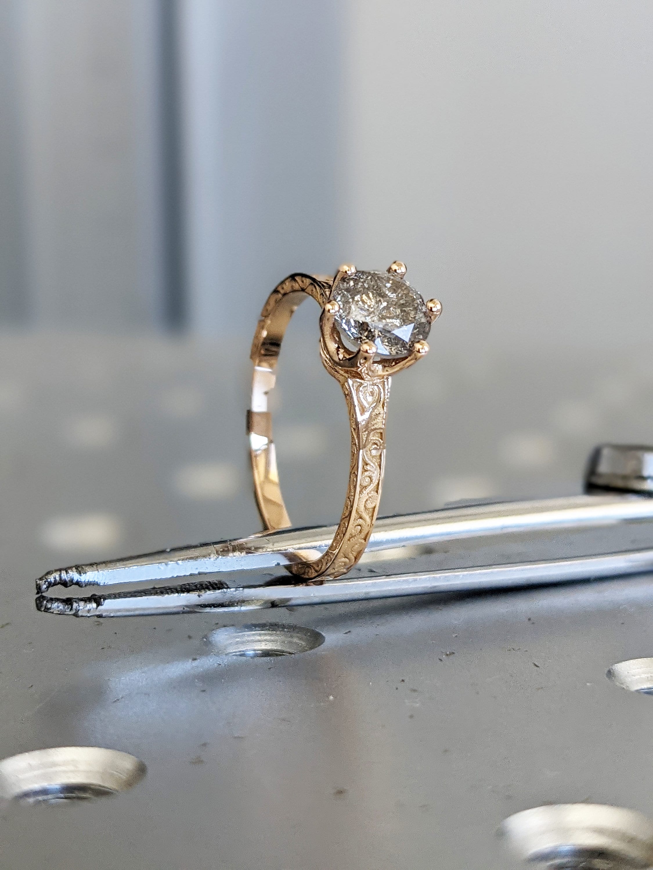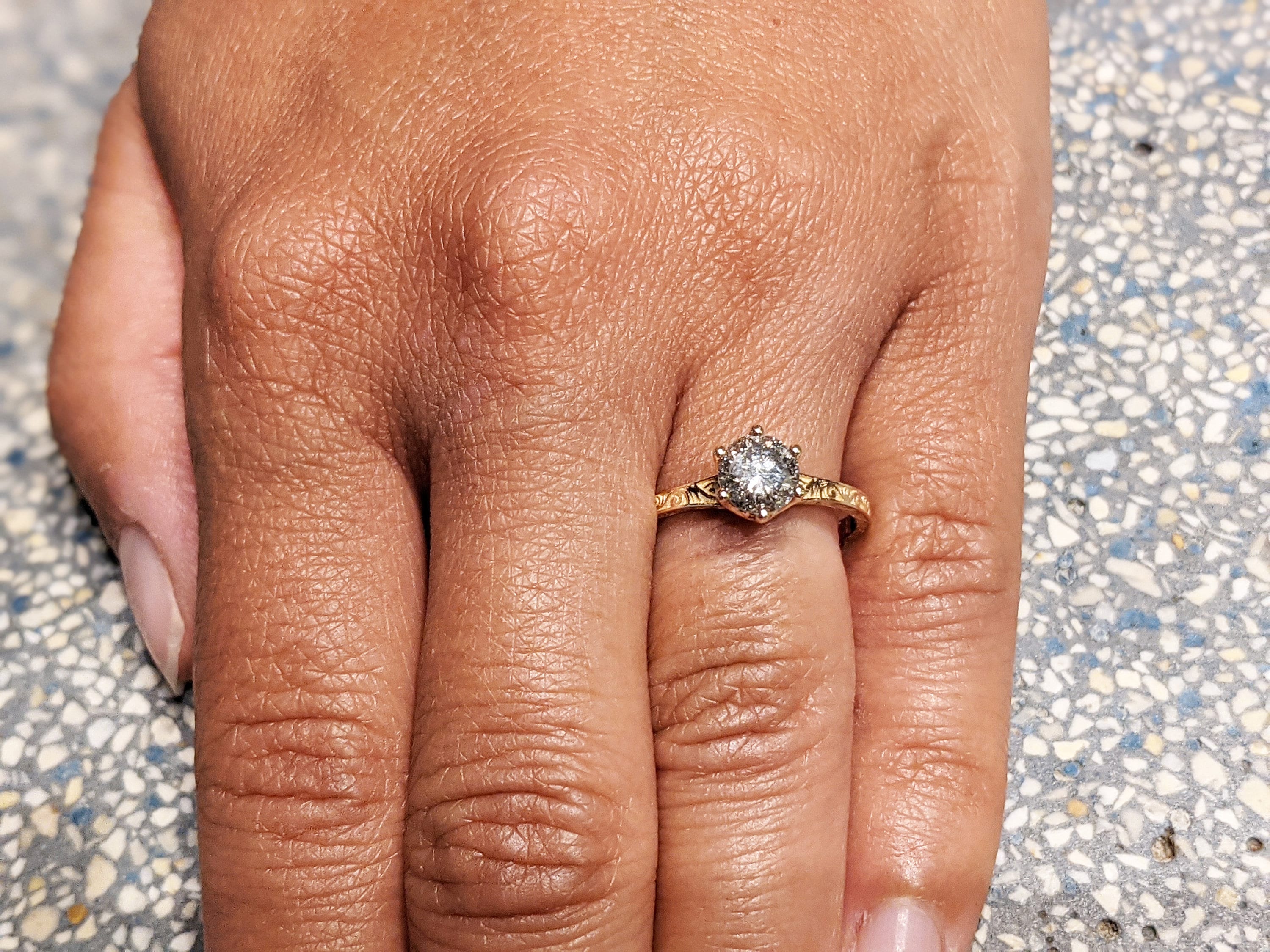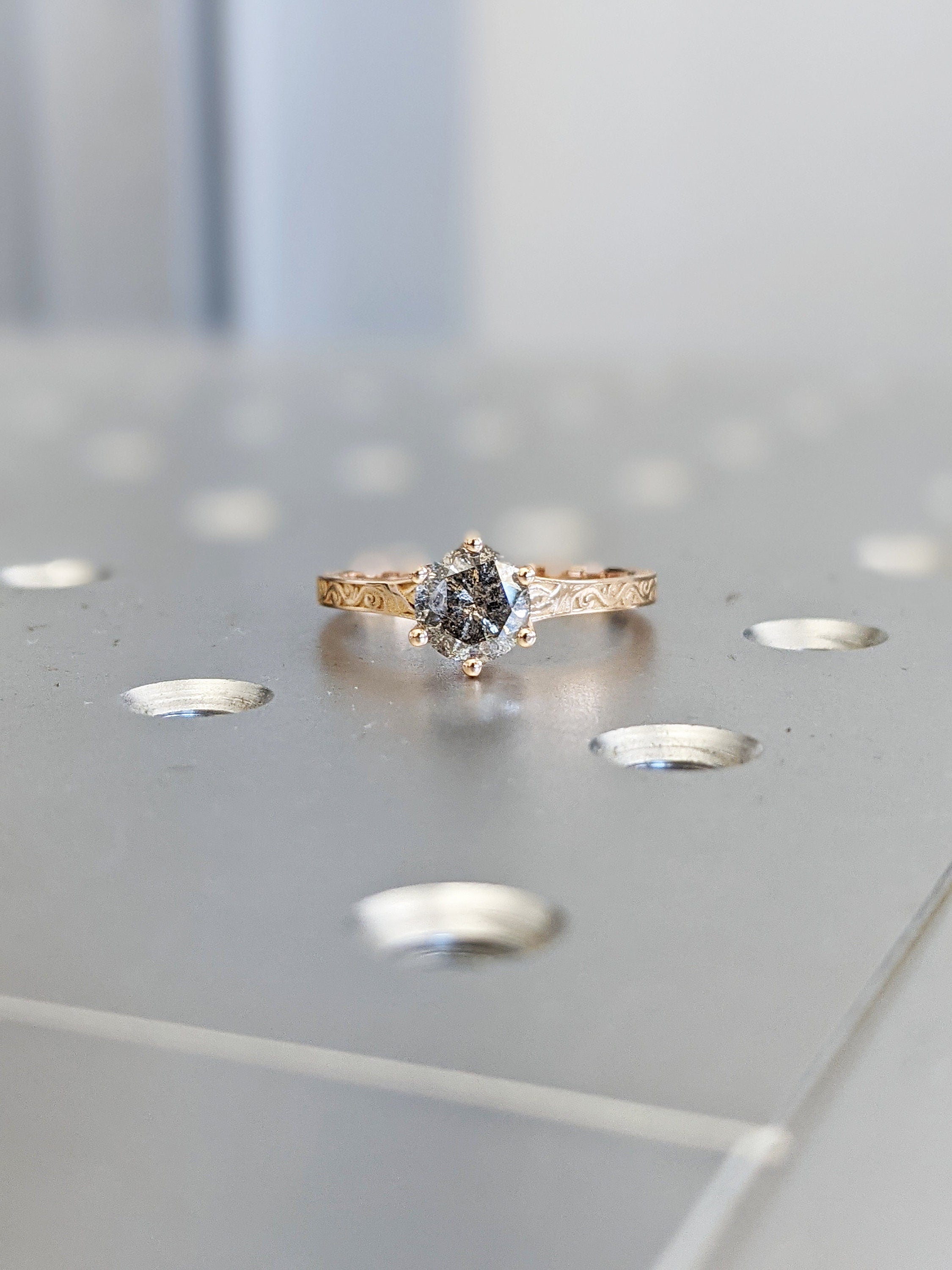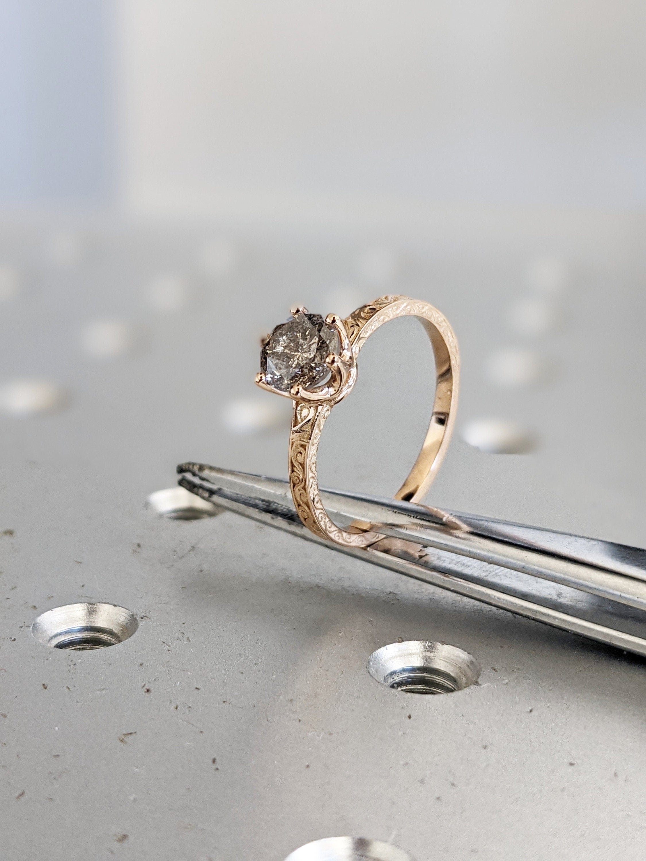 Raw Salt and Pepper Diamond Solitaire Wedding Anniversary Ring: 14k or 18k Solid Gold with Hand Engrave Filigree Band