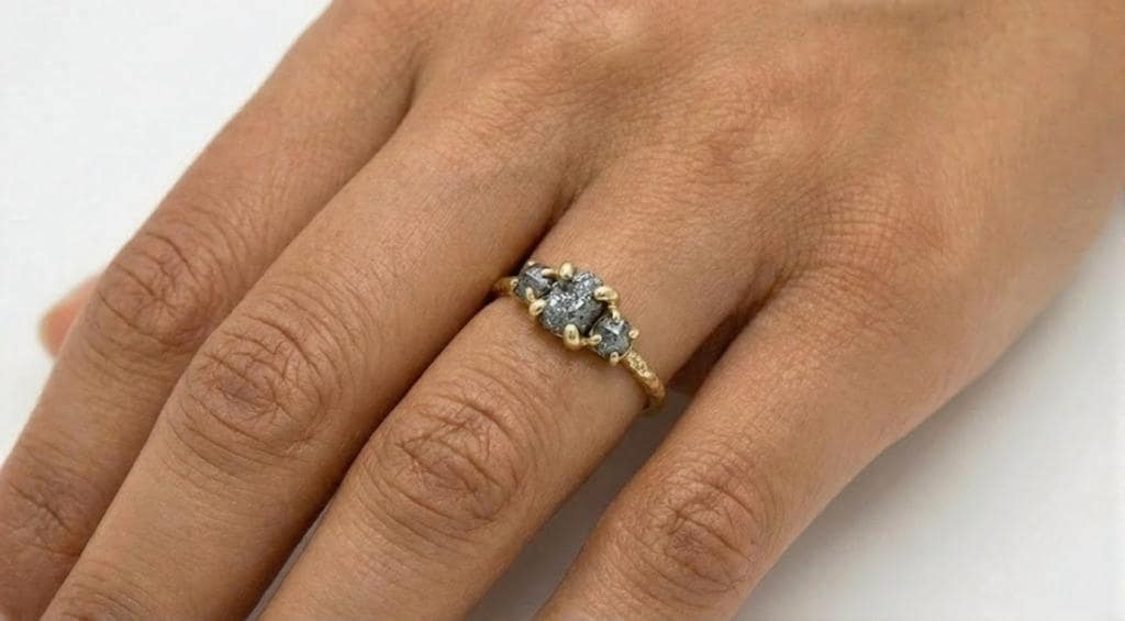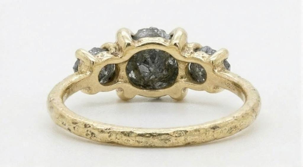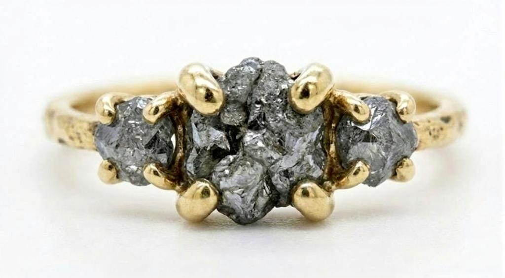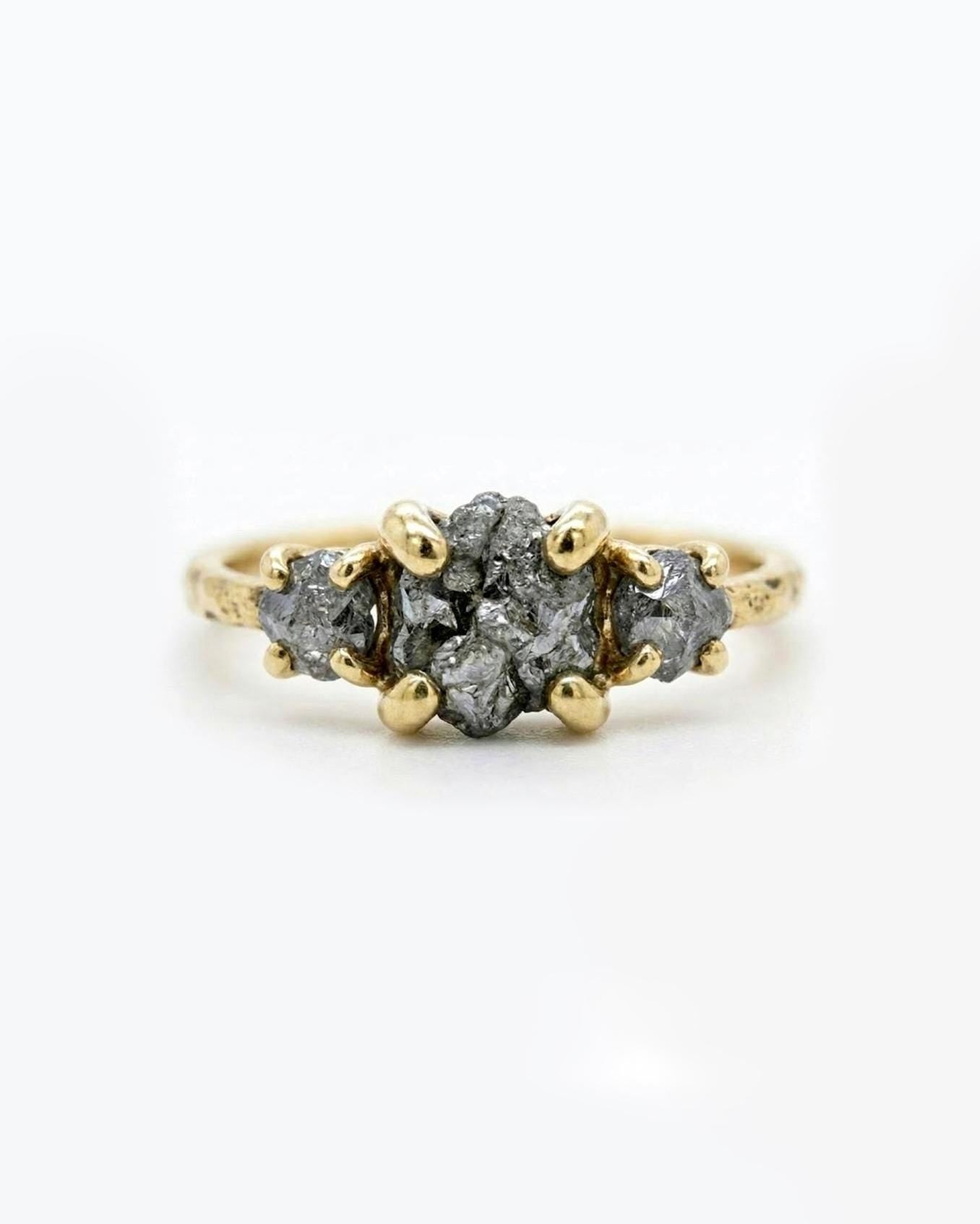 This captivating three-stone ring features raw, uncut Salt and Pepper Diamond, celebrated for its natural, untouched beauty and cosmic speckled patterns. Two smaller side stones frame the centerpiece, adding balance while keeping the focus on the organic character of the rough diamond. The stones sit on a slim, hand-hammered band that adds subtle texture and an artisanal feel. Unique, earthy, and full of personality, this ring is perfect for anyone drawn to natural elegance and one-of-a-kind charm.